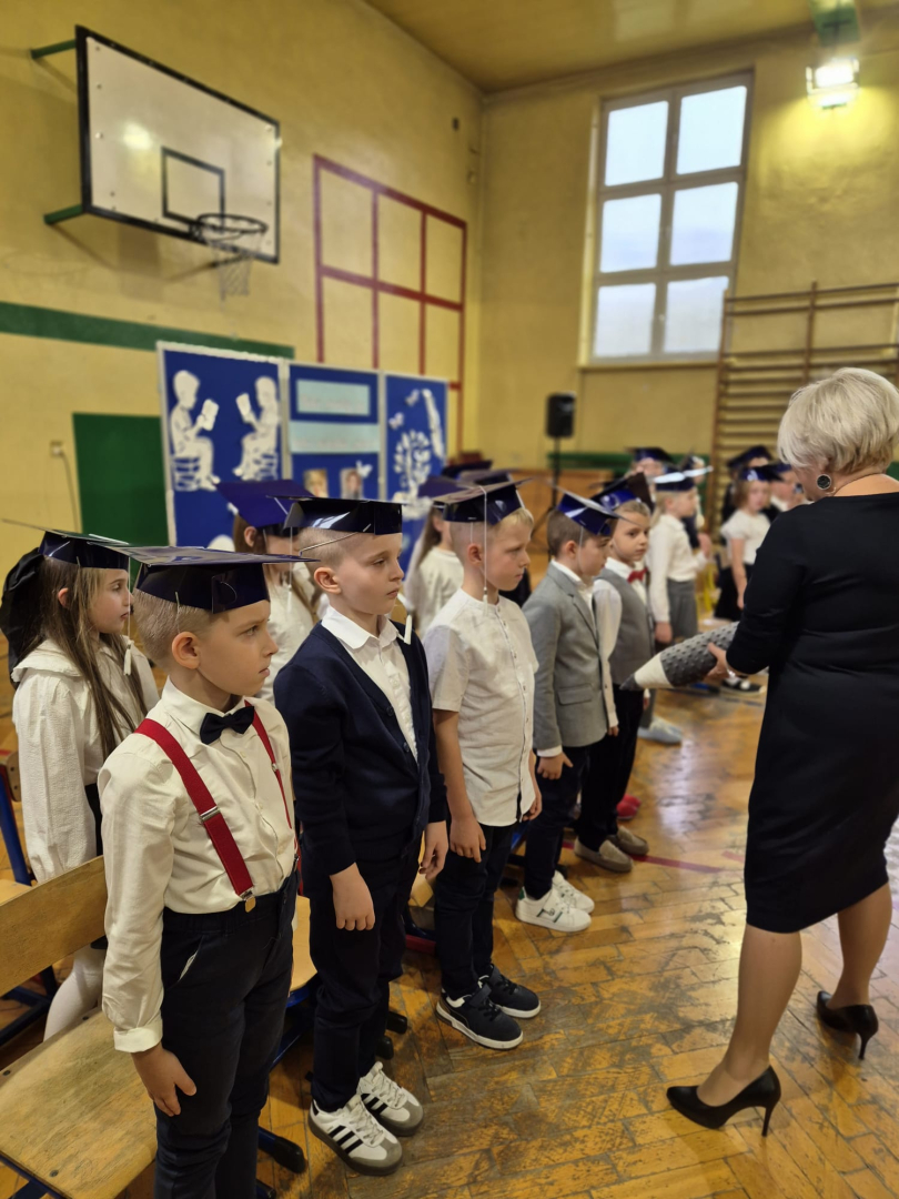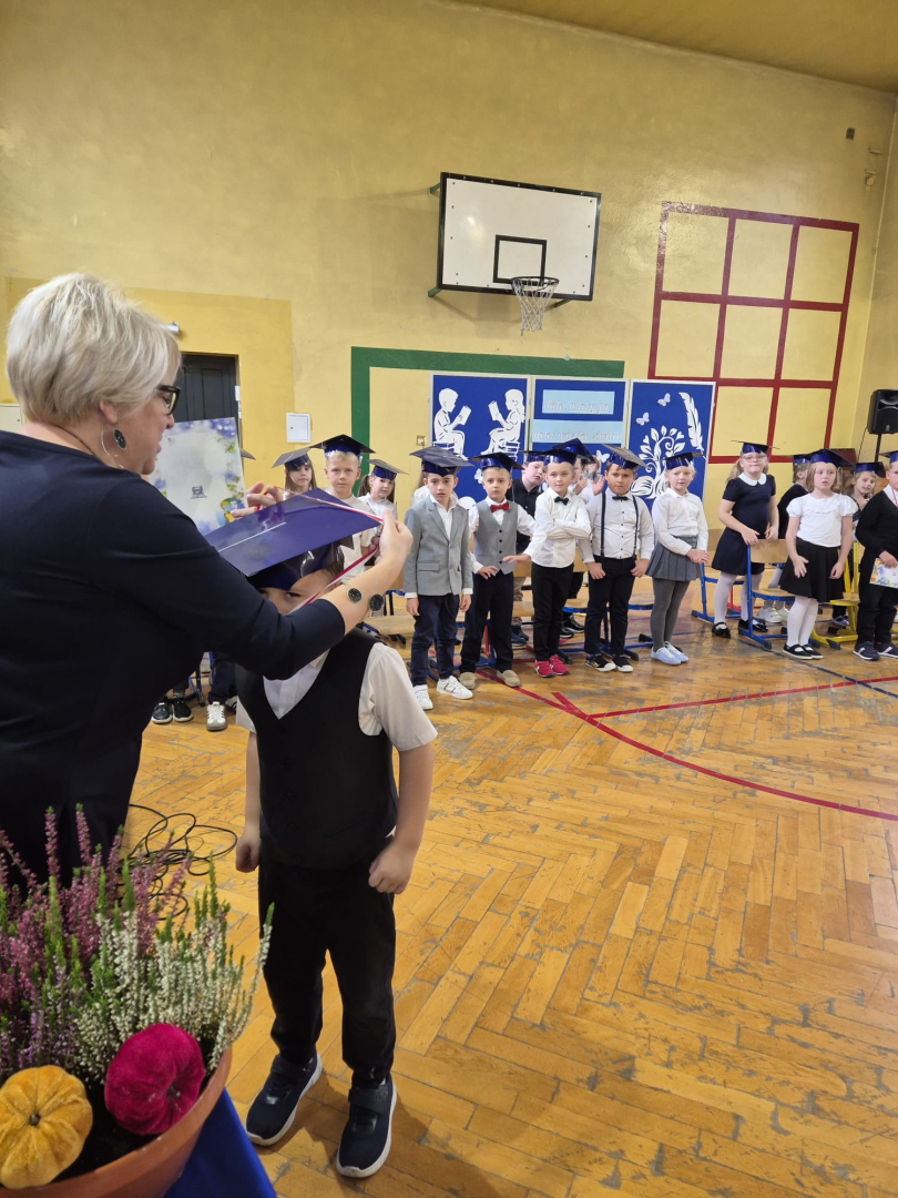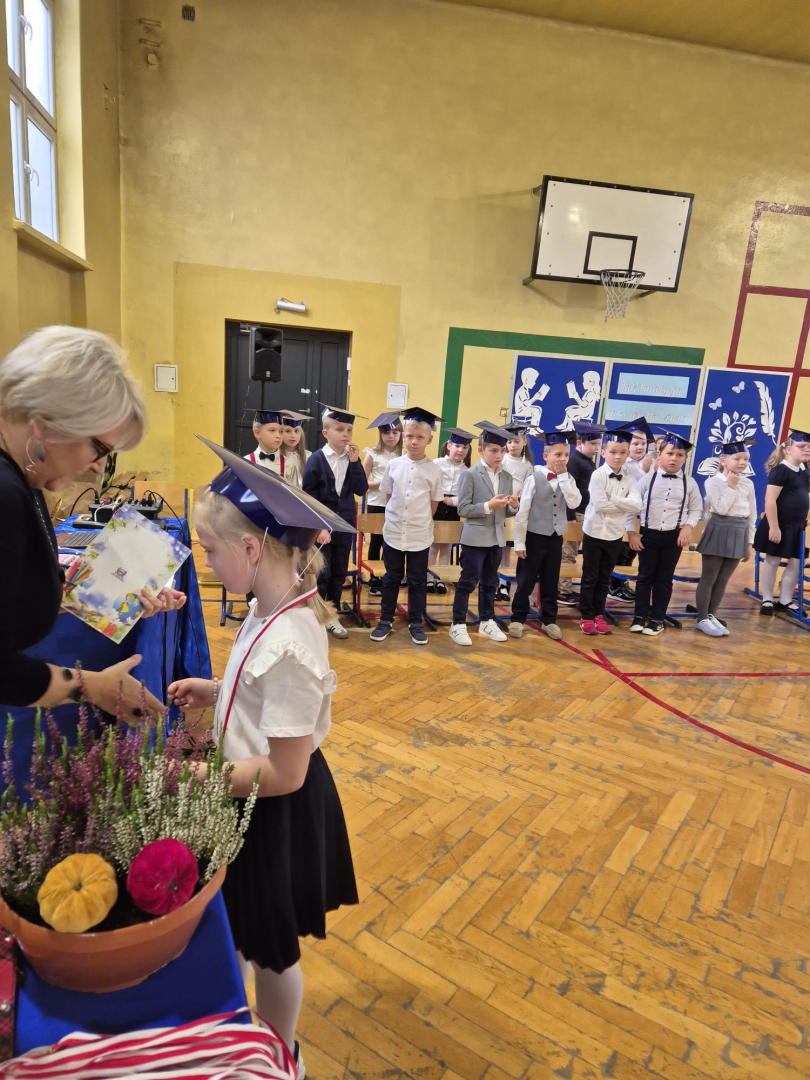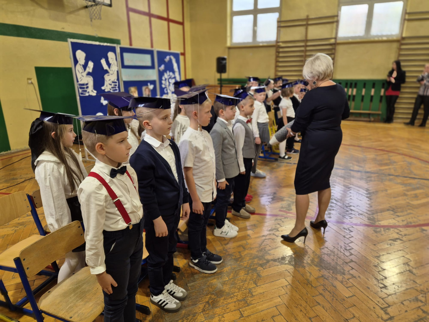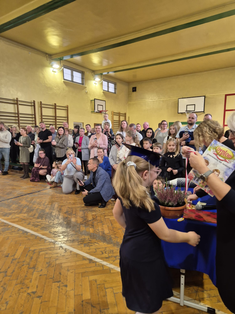 Mimo stresu związanego z pierwszym publicznym występem, dzieci doskonale sobie poradziły i udowodniły, że są gotowe, aby stać się stuprocentowymi uczniami. Dodatkowej wagi tej uroczystości dodali przybyli rodzice oraz Dyrekcja szkoły. W części artystycznej uczniowie zaprezentowali wierszyki, piosenki oraz wykonywali różne zadania. Po zakończeniu części artystycznej, w niezwykle podniosłej atmosferze, przed pocztem sztandarowym uczniowie ślubowali być dobrymi Polakami, godnie reprezentować swoją szkołę, swym zachowaniem i nauką sprawiać radość rodzicom i nauczycielom. Po złożeniu ślubowania Pani Dyrektor dokonała symbolicznego pasowania na ucznia. Wielką kredką, jak czarodziejską różdżką dotykała ramion swoich podopiecznych. Nie obyło się bez upominków i pamiątkowych zdjęć. Kochane Pierwszaki cieszymy się, że jesteście już uczniami i życzymy Wam sukcesów w nauce. Powodzenia.