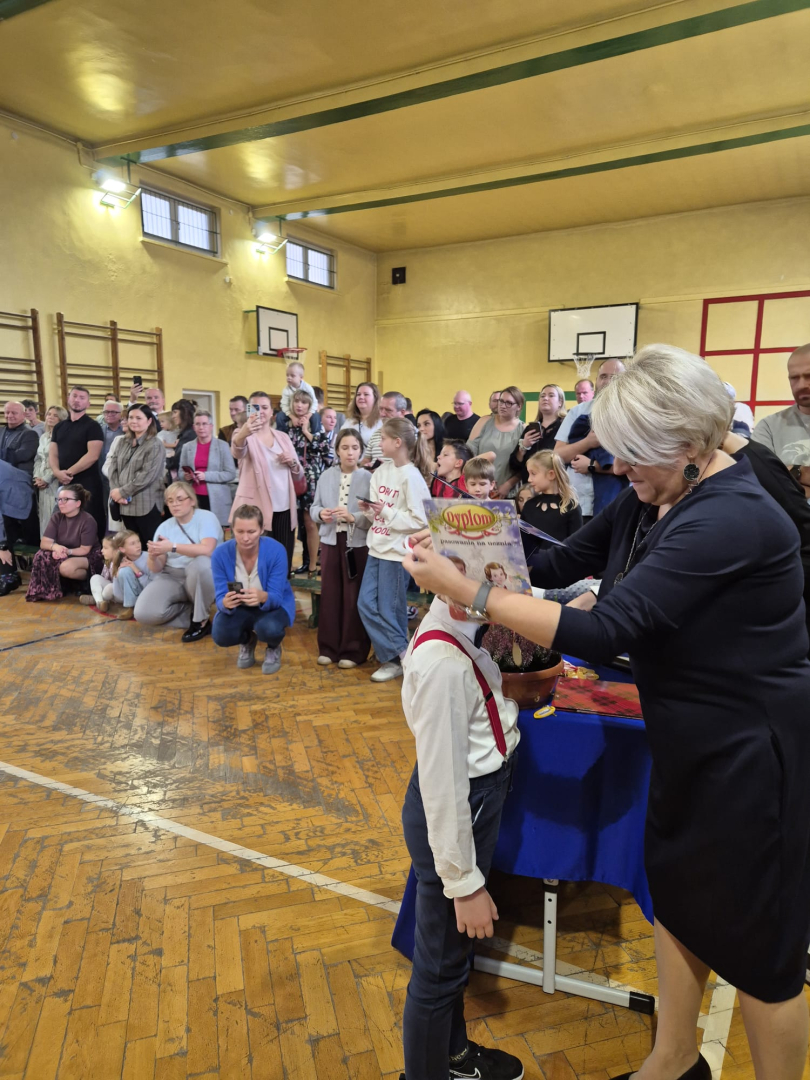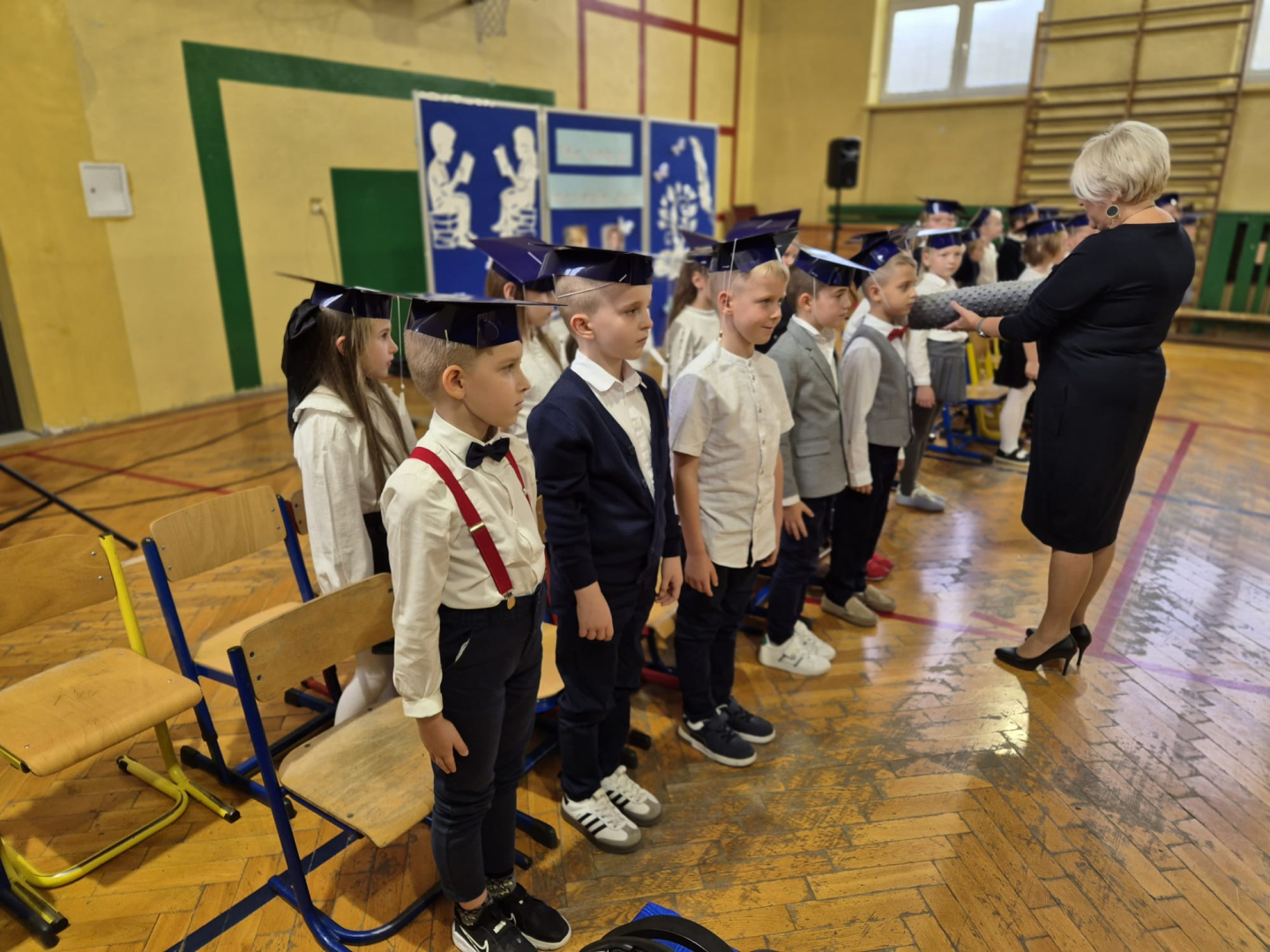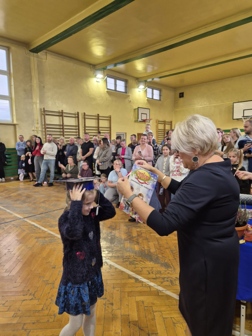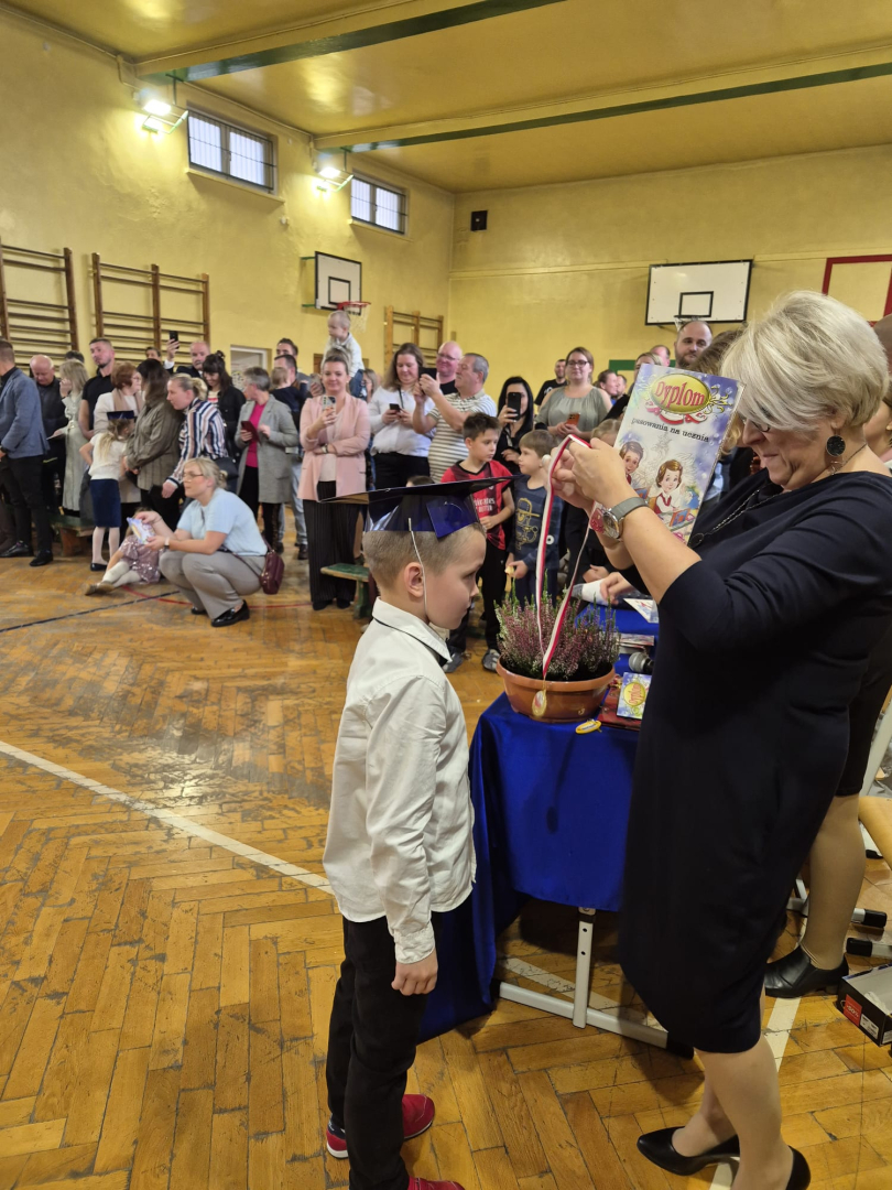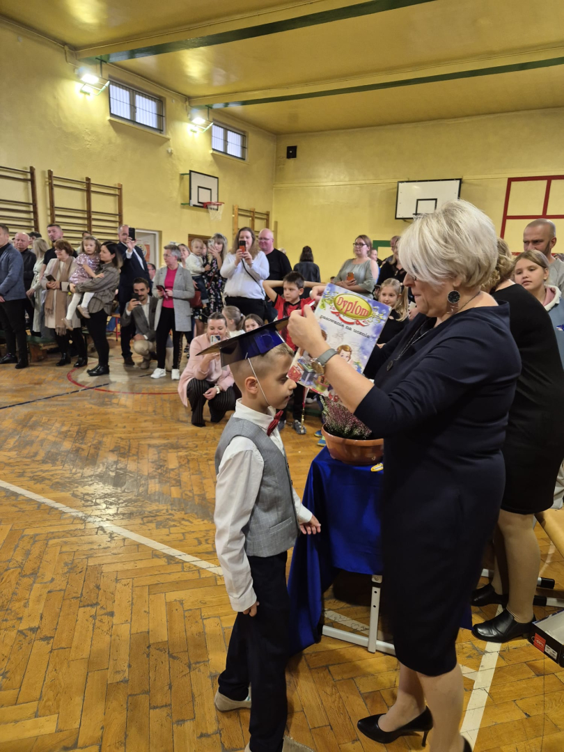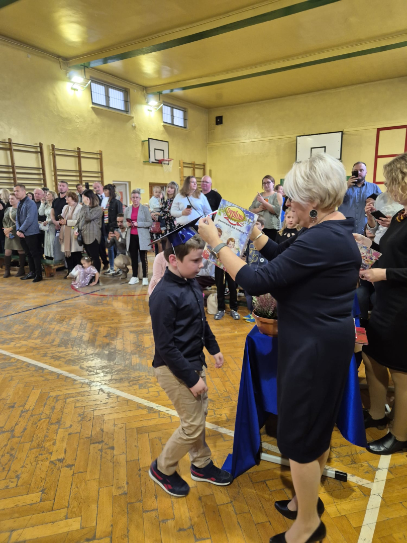 Mimo stresu związanego z pierwszym publicznym występem, dzieci doskonale sobie poradziły i udowodniły, że są gotowe, aby stać się stuprocentowymi uczniami. Dodatkowej wagi tej uroczystości dodali przybyli rodzice oraz Dyrekcja szkoły. W części artystycznej uczniowie zaprezentowali wierszyki, piosenki oraz wykonywali różne zadania. Po zakończeniu części artystycznej, w niezwykle podniosłej atmosferze, przed pocztem sztandarowym uczniowie ślubowali być dobrymi Polakami, godnie reprezentować swoją szkołę, swym zachowaniem i nauką sprawiać radość rodzicom i nauczycielom. Po złożeniu ślubowania Pani Dyrektor dokonała symbolicznego pasowania na ucznia. Wielką kredką, jak czarodziejską różdżką dotykała ramion swoich podopiecznych. Nie obyło się bez upominków i pamiątkowych zdjęć. Kochane Pierwszaki cieszymy się, że jesteście już uczniami i życzymy Wam sukcesów w nauce. Powodzenia.