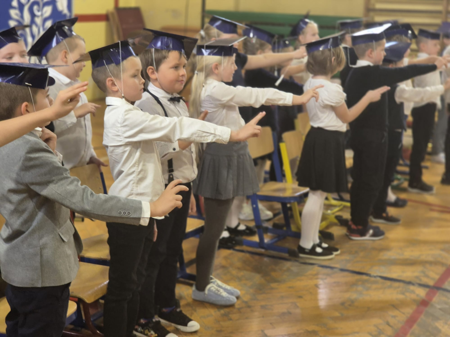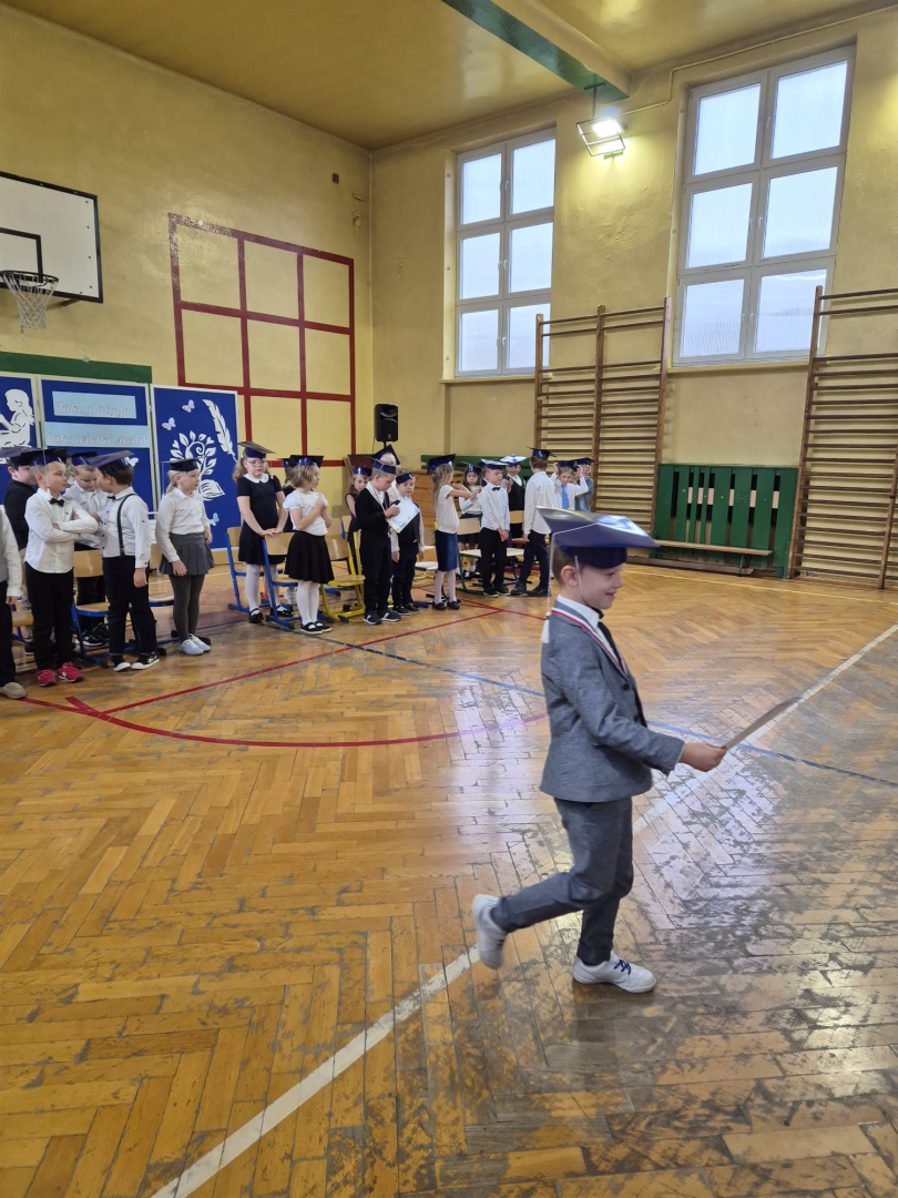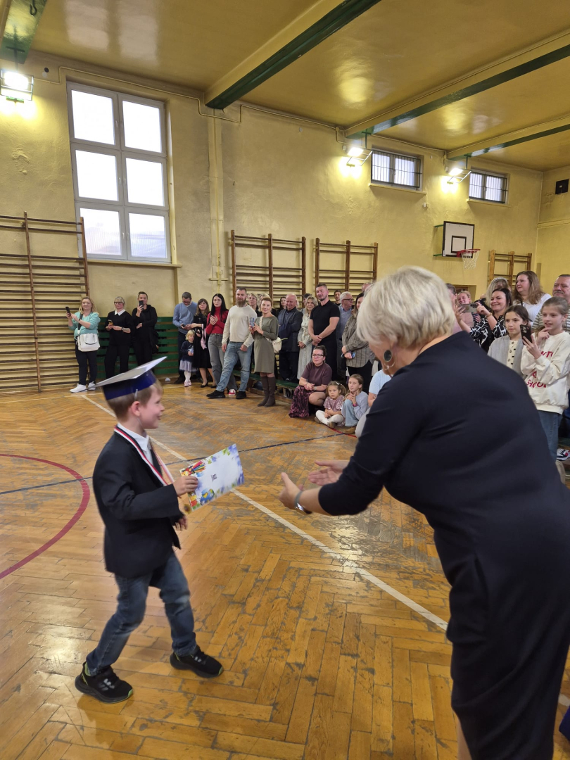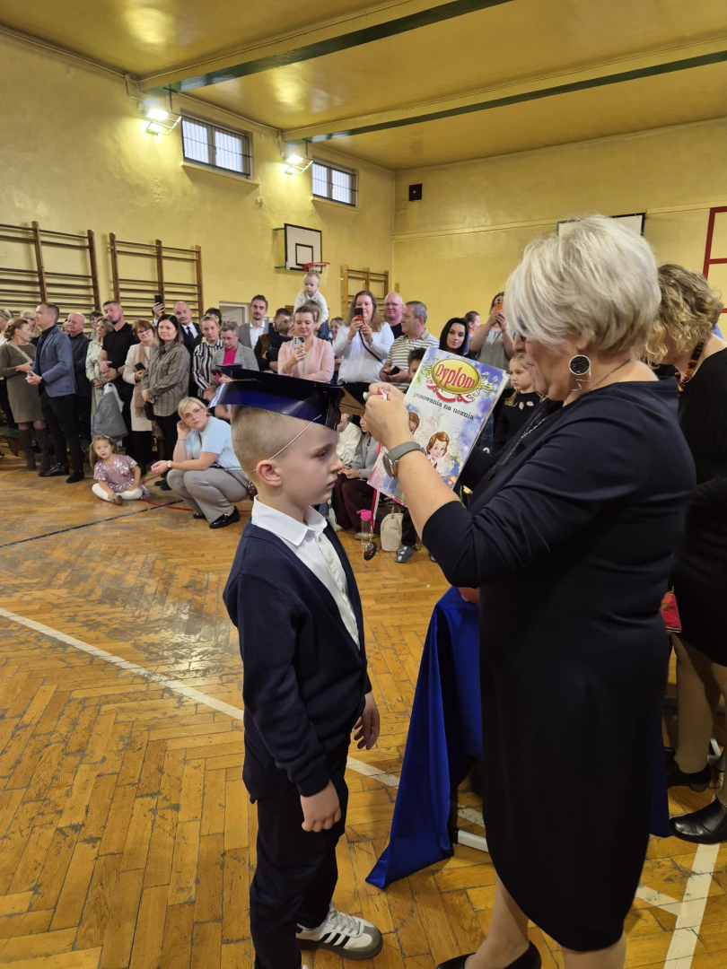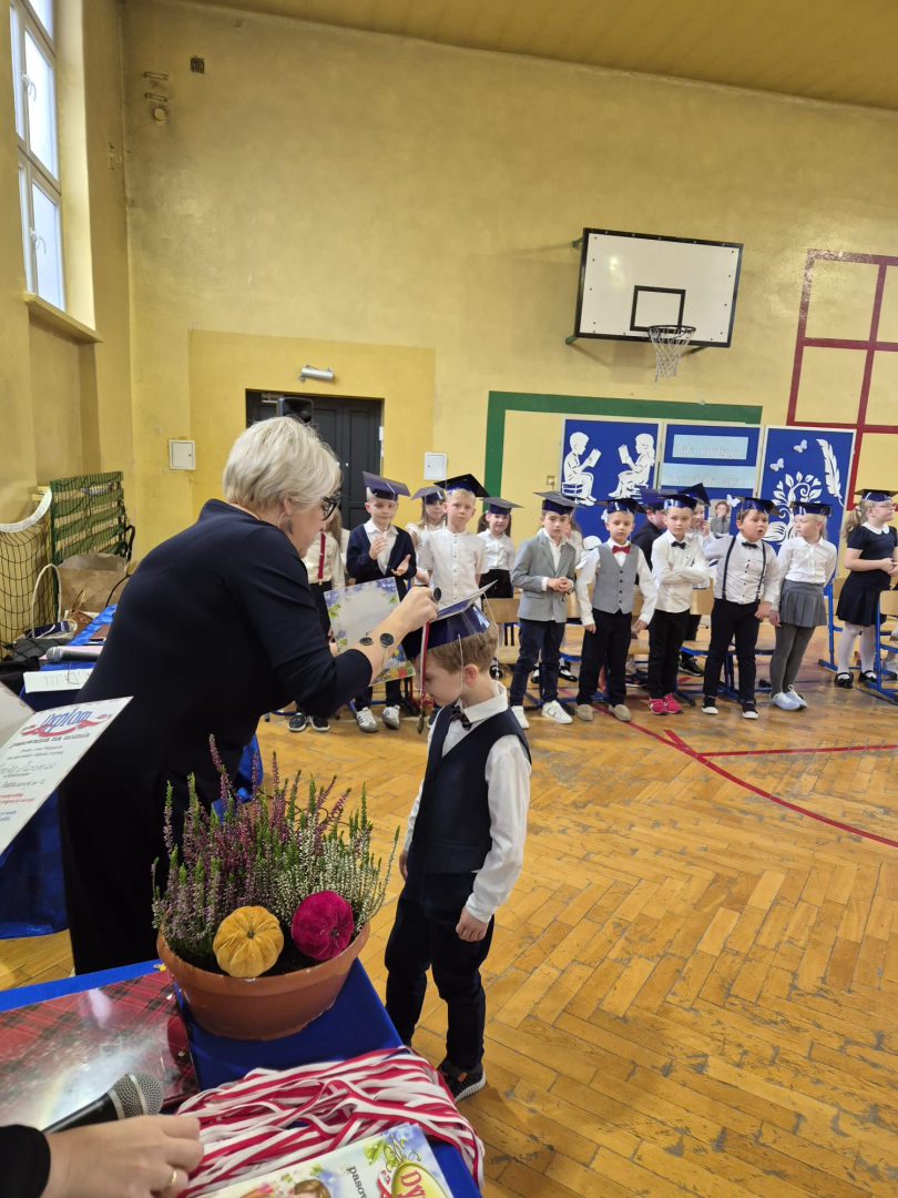 Mimo stresu związanego z pierwszym publicznym występem, dzieci doskonale sobie poradziły i udowodniły, że są gotowe, aby stać się stuprocentowymi uczniami. Dodatkowej wagi tej uroczystości dodali przybyli rodzice oraz Dyrekcja szkoły. W części artystycznej uczniowie zaprezentowali wierszyki, piosenki oraz wykonywali różne zadania. Po zakończeniu części artystycznej, w niezwykle podniosłej atmosferze, przed pocztem sztandarowym uczniowie ślubowali być dobrymi Polakami, godnie reprezentować swoją szkołę, swym zachowaniem i nauką sprawiać radość rodzicom i nauczycielom. Po złożeniu ślubowania Pani Dyrektor dokonała symbolicznego pasowania na ucznia. Wielką kredką, jak czarodziejską różdżką dotykała ramion swoich podopiecznych. Nie obyło się bez upominków i pamiątkowych zdjęć. Kochane Pierwszaki cieszymy się, że jesteście już uczniami i życzymy Wam sukcesów w nauce. Powodzenia.