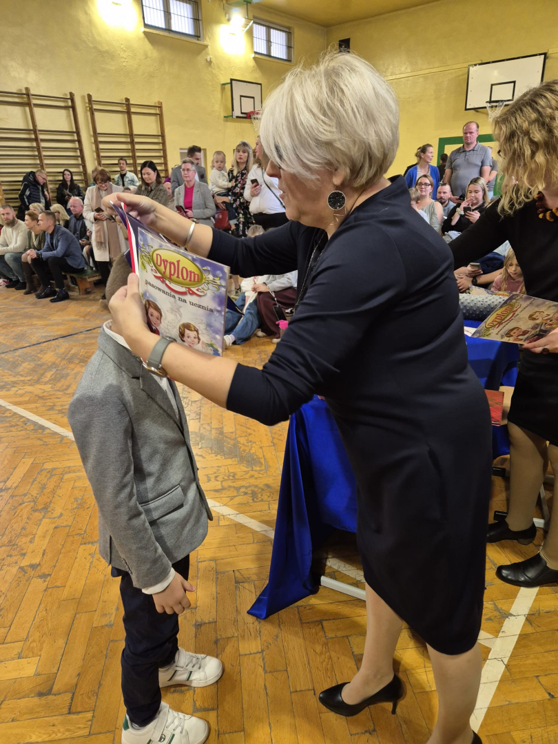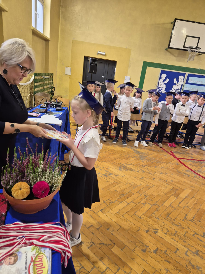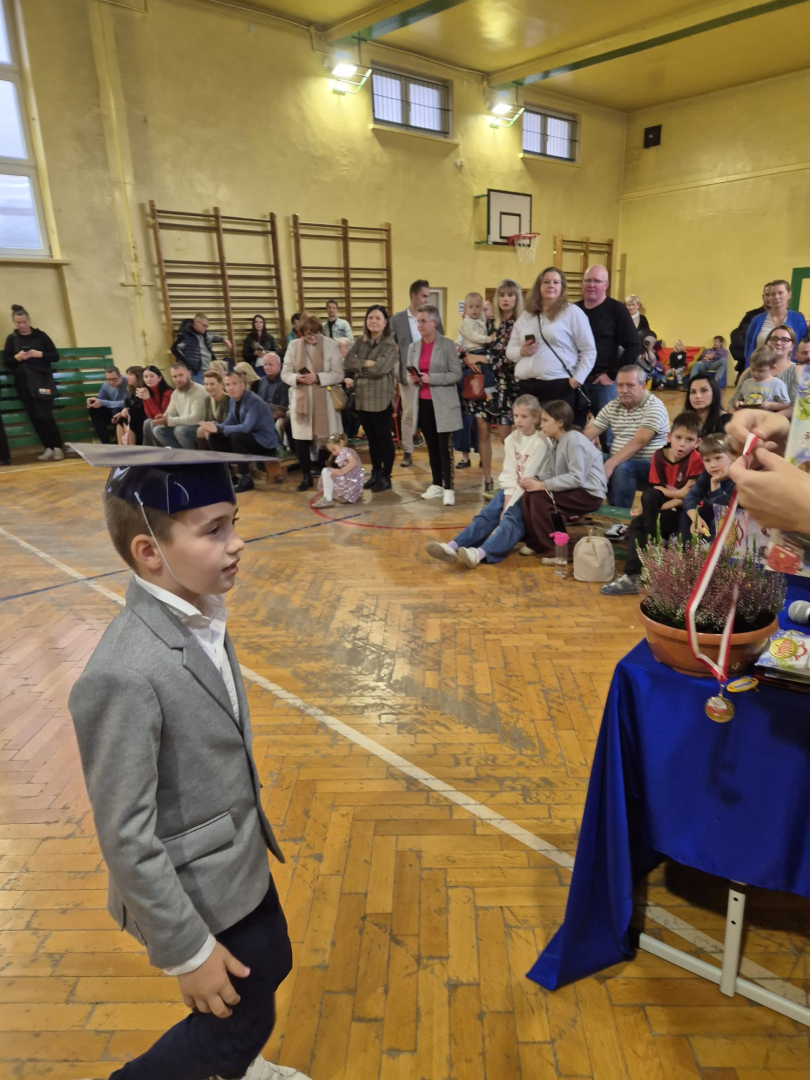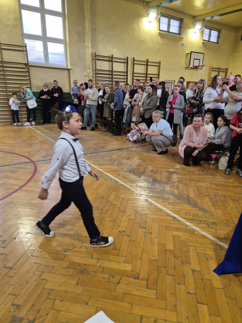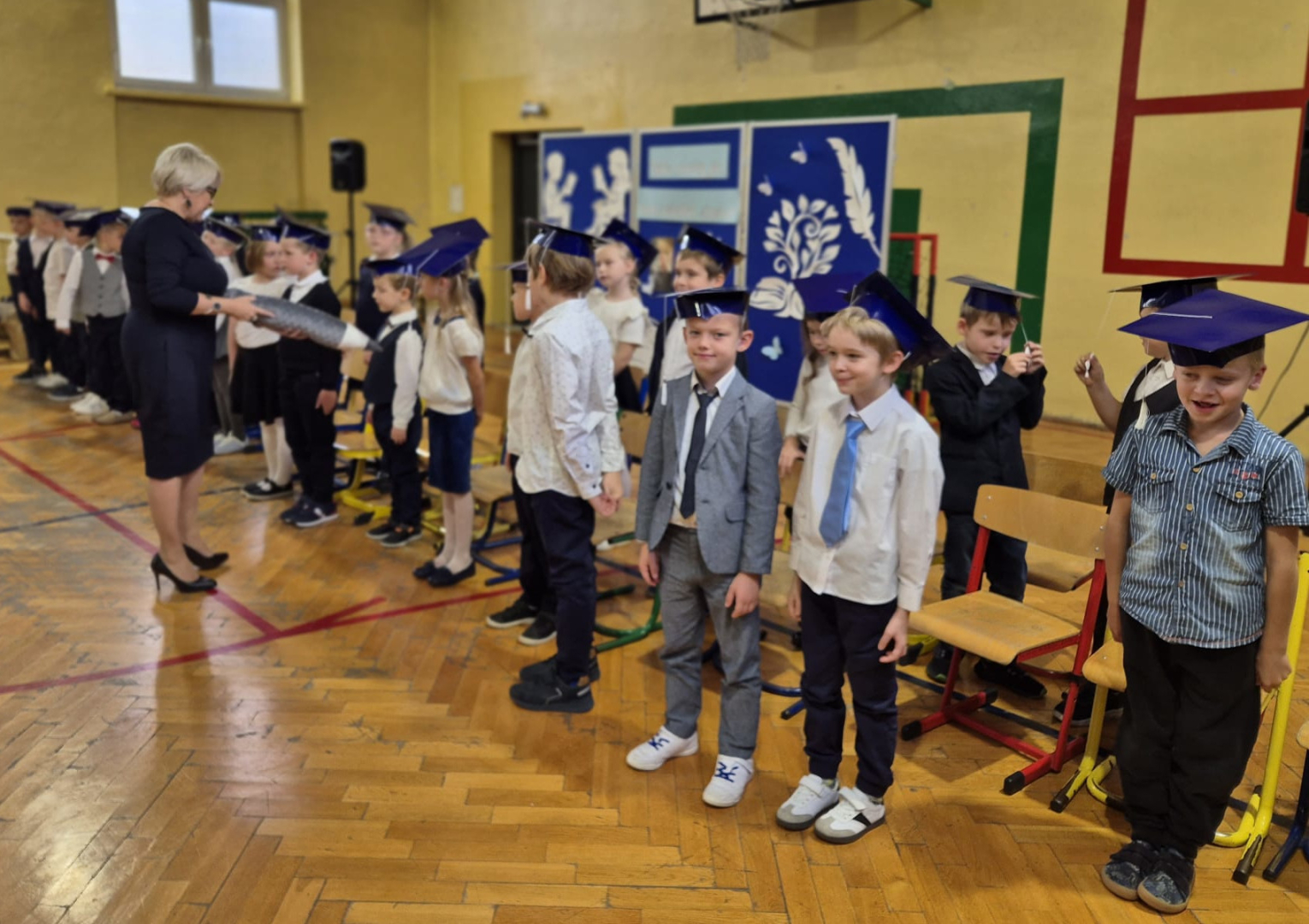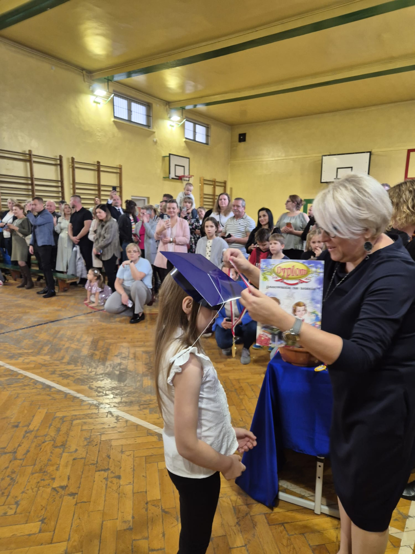 Mimo stresu związanego z pierwszym publicznym występem, dzieci doskonale sobie poradziły i udowodniły, że są gotowe, aby stać się stuprocentowymi uczniami. Dodatkowej wagi tej uroczystości dodali przybyli rodzice oraz Dyrekcja szkoły. W części artystycznej uczniowie zaprezentowali wierszyki, piosenki oraz wykonywali różne zadania. Po zakończeniu części artystycznej, w niezwykle podniosłej atmosferze, przed pocztem sztandarowym uczniowie ślubowali być dobrymi Polakami, godnie reprezentować swoją szkołę, swym zachowaniem i nauką sprawiać radość rodzicom i nauczycielom. Po złożeniu ślubowania Pani Dyrektor dokonała symbolicznego pasowania na ucznia. Wielką kredką, jak czarodziejską różdżką dotykała ramion swoich podopiecznych. Nie obyło się bez upominków i pamiątkowych zdjęć. Kochane Pierwszaki cieszymy się, że jesteście już uczniami i życzymy Wam sukcesów w nauce. Powodzenia.