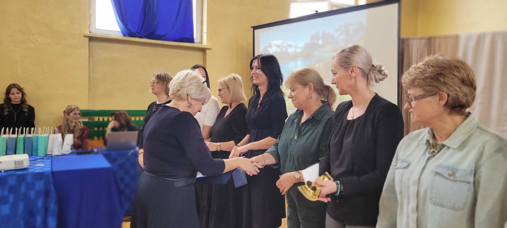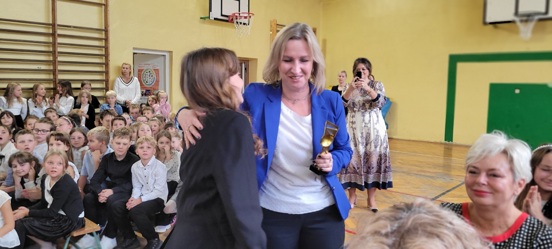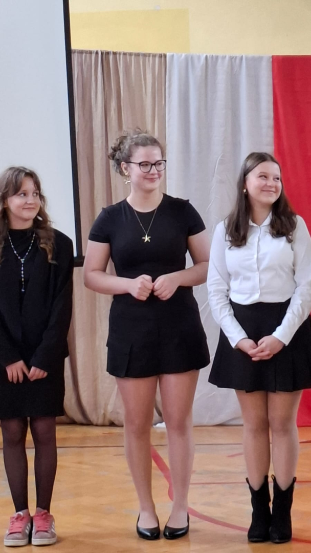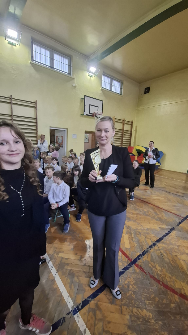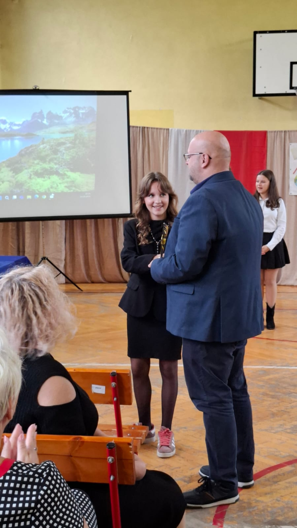 W drugiej części uroczystości opiekunki samorządu uczniowskiego - panie Agnieszka Kręgiel i Katarzyna Stachura wraz z przewodniczącą samorządu Nadią Spinek (kl. 7b) oraz wiceprzewodniczącymi Marią Jabłońską i Laurą Gawor (kl. 8a) wręczyły nagrody nauczycielom wybranym przez uczniów w szkolnym plebiscycie.