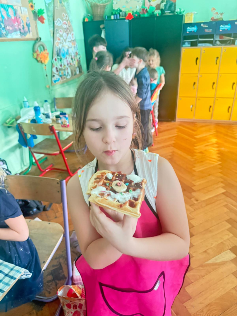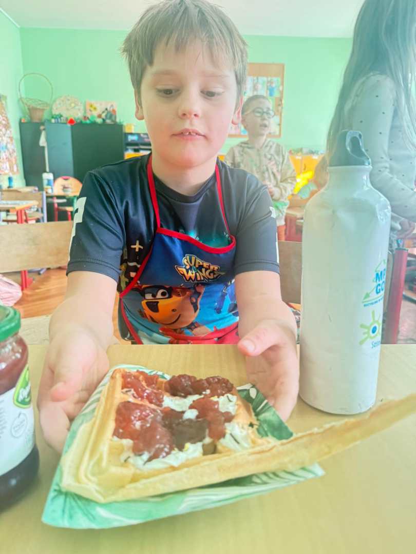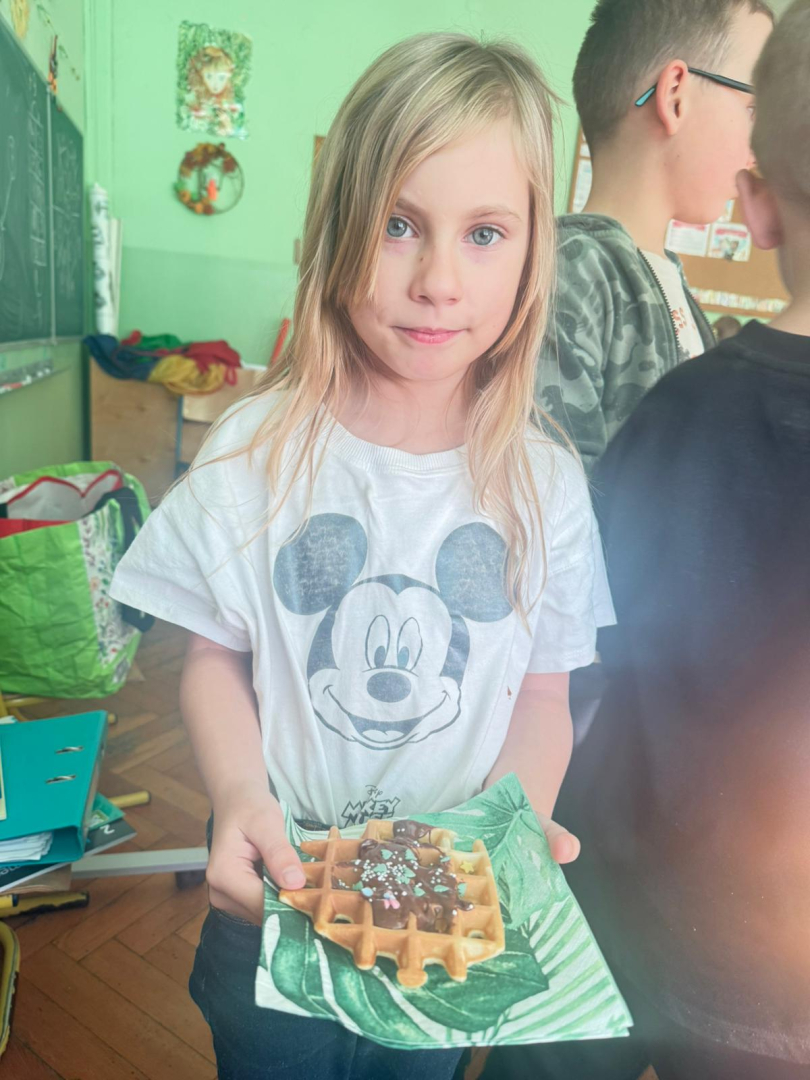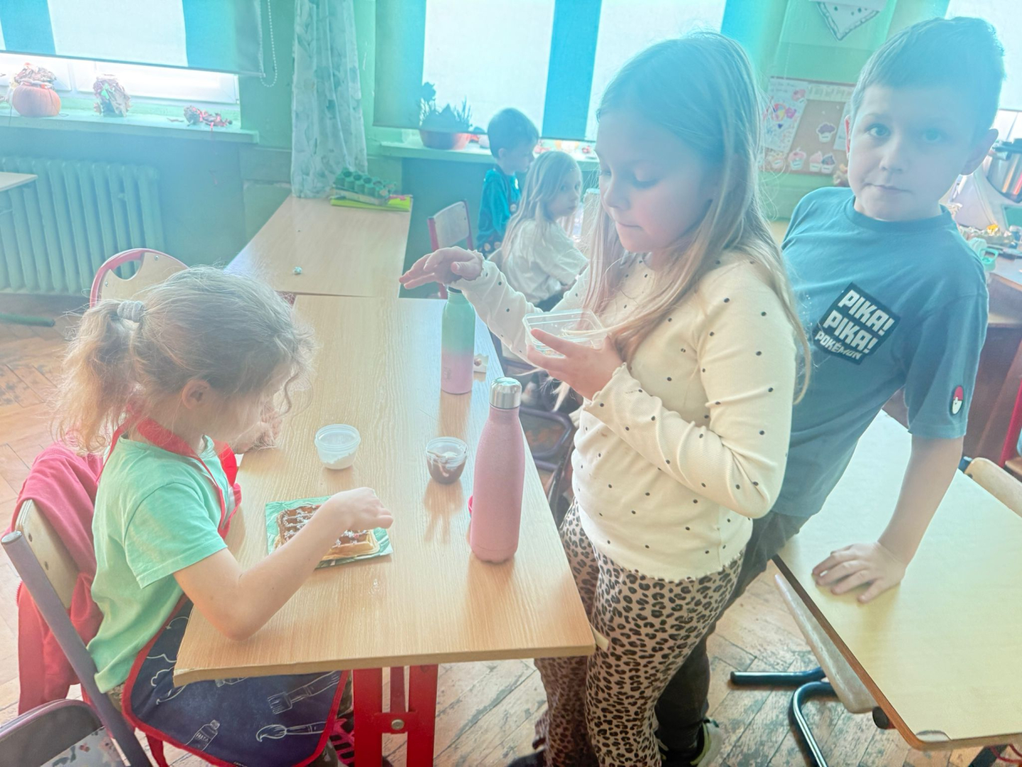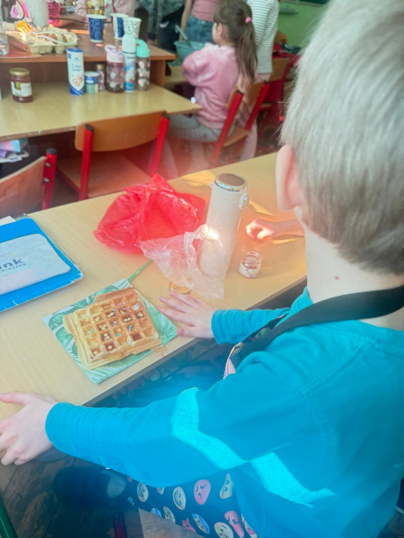 Po wspólnym przygotowaniu ciasta nadszedł najbardziej wyczekiwany moment — dekorowanie! Każdy uczeń ozdobił swojego gofra według własnego pomysłu. Na stołach królowały: Nutella, bita śmietana, kolorowe posypki, dżemy oraz swojskie powidła. Kreatywność dzieci nie miała końca, a efekty pracy były nie tylko piękne, ale przede wszystkim bardzo smaczne.