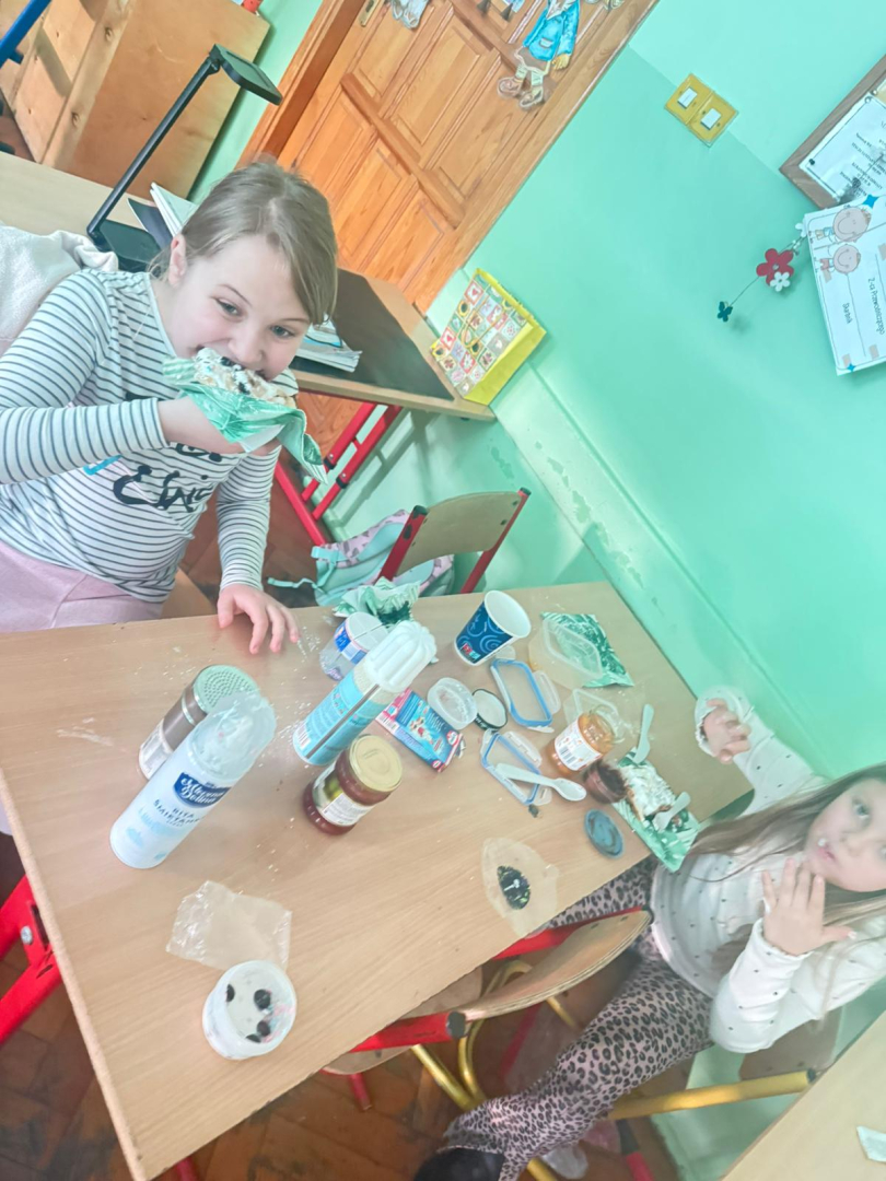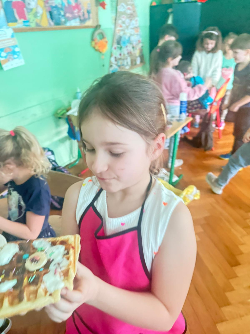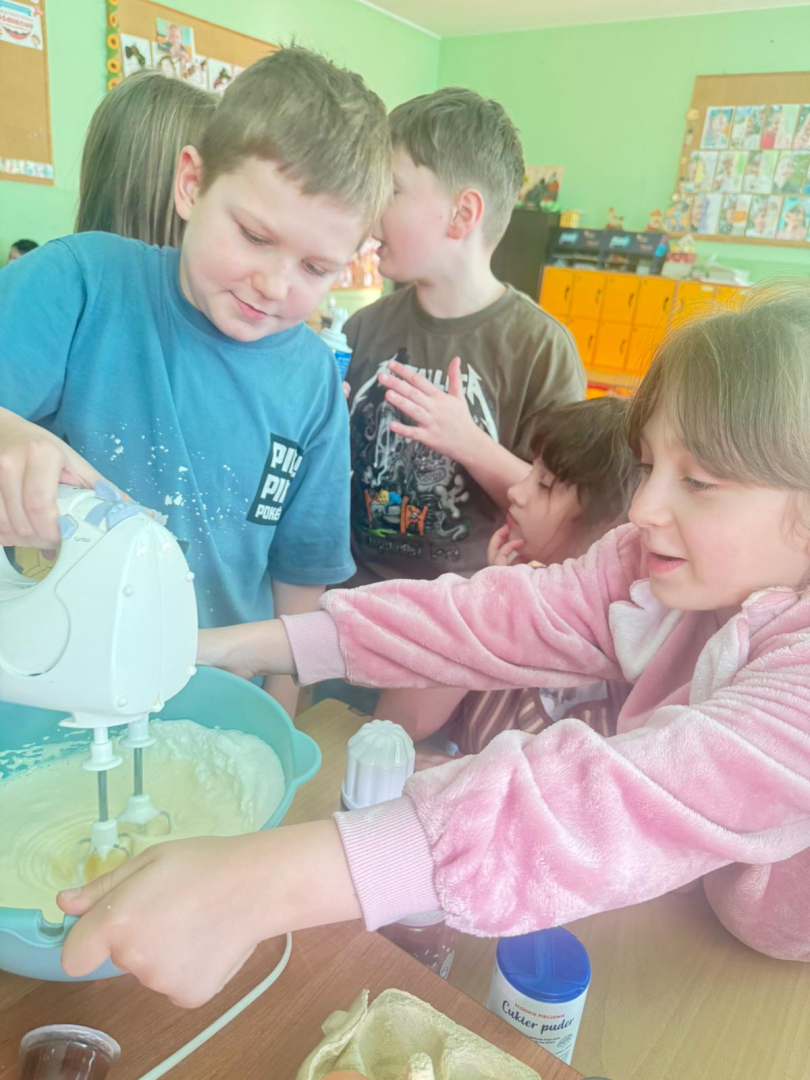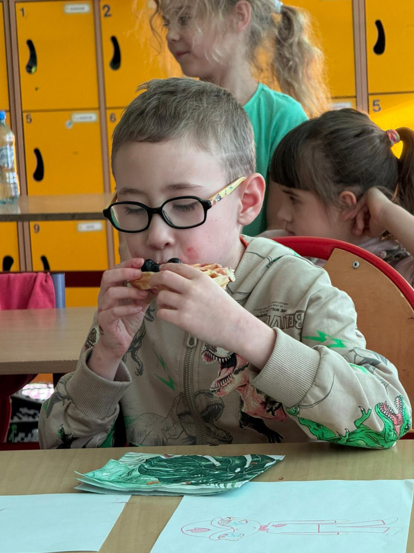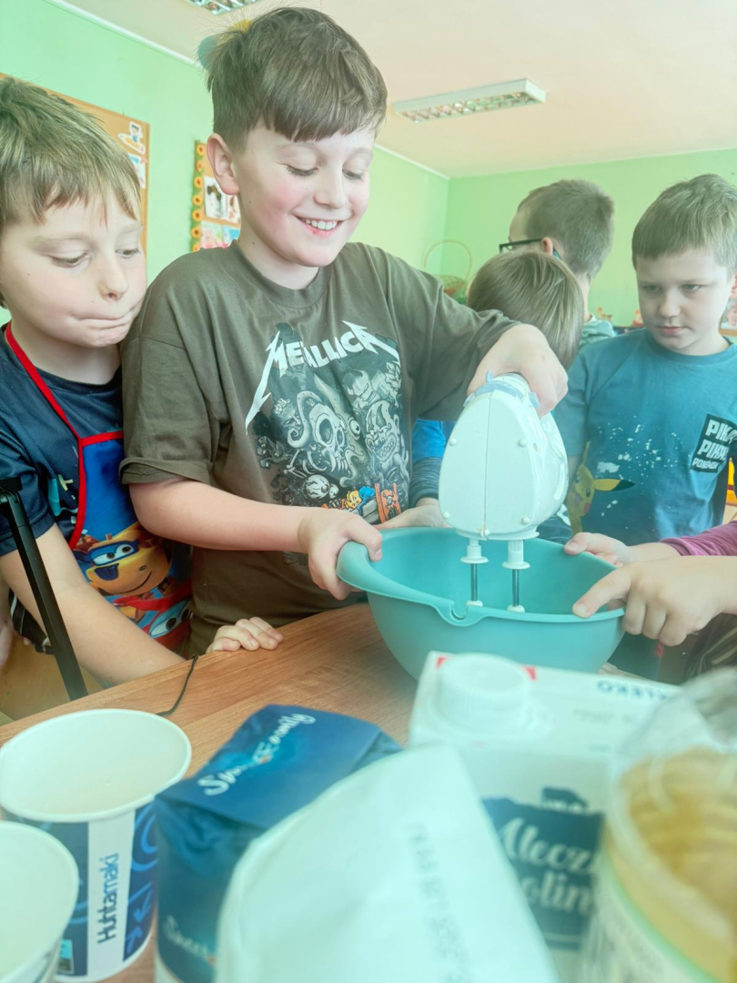 Po wspólnym przygotowaniu ciasta nadszedł najbardziej wyczekiwany moment — dekorowanie! Każdy uczeń ozdobił swojego gofra według własnego pomysłu. Na stołach królowały: Nutella, bita śmietana, kolorowe posypki, dżemy oraz swojskie powidła. Kreatywność dzieci nie miała końca, a efekty pracy były nie tylko piękne, ale przede wszystkim bardzo smaczne.