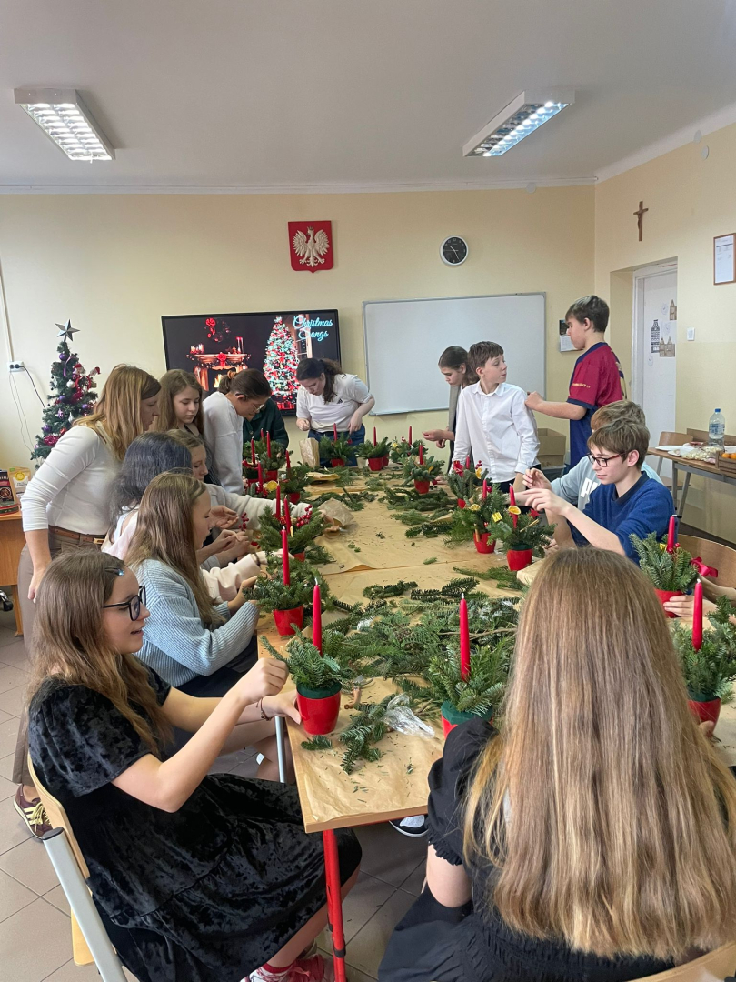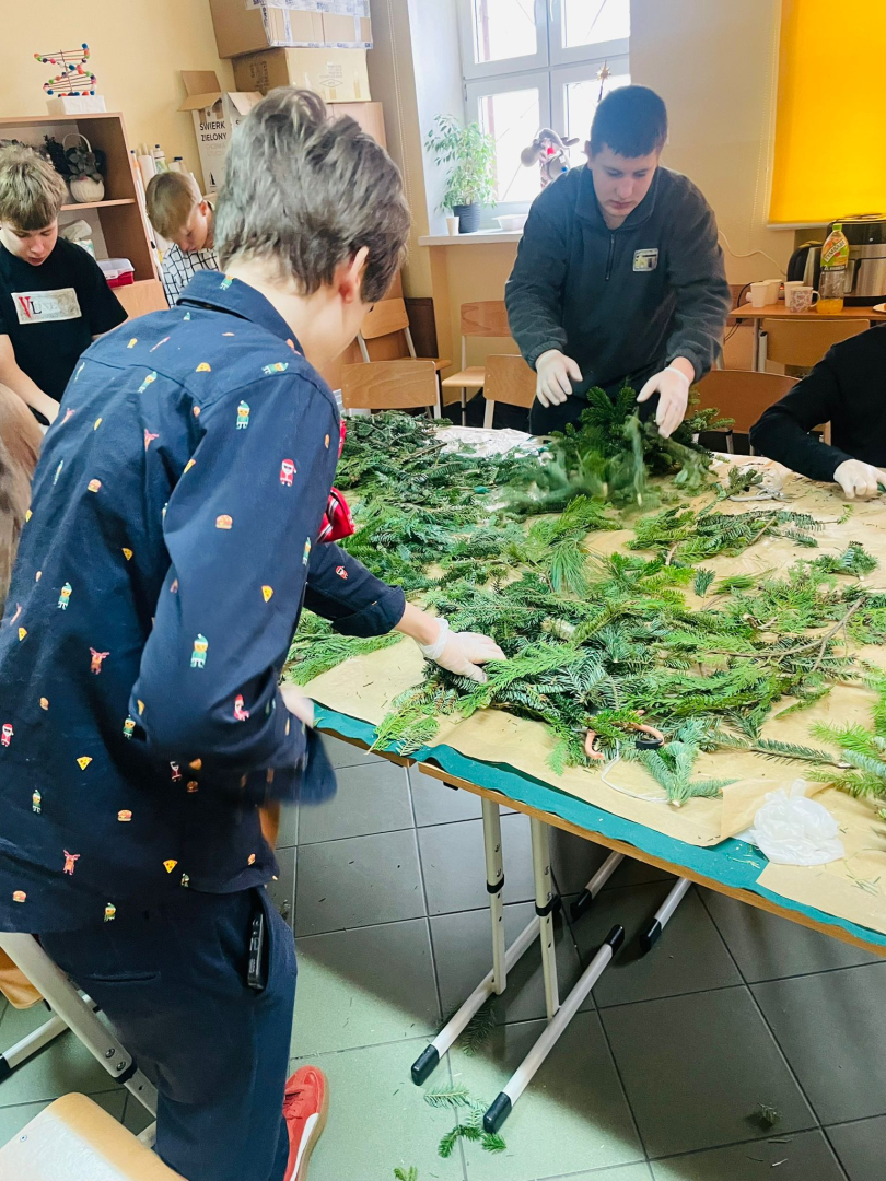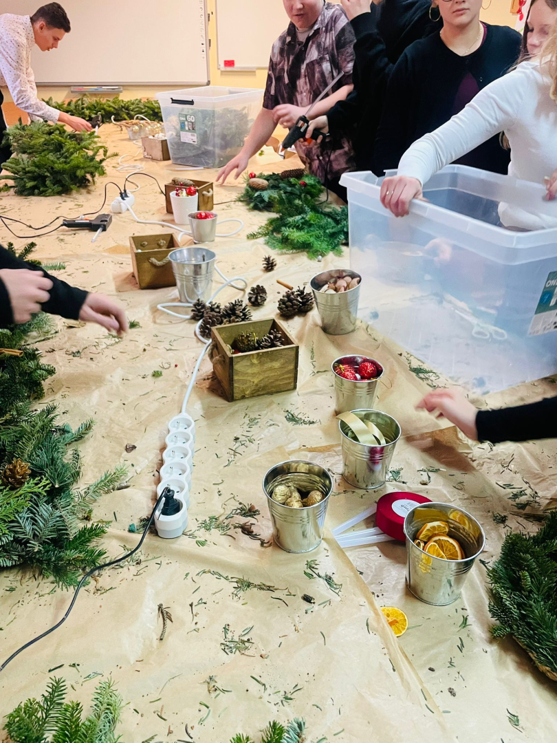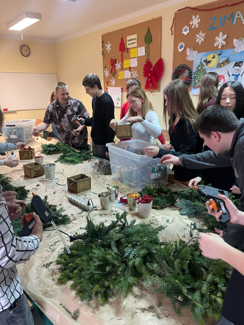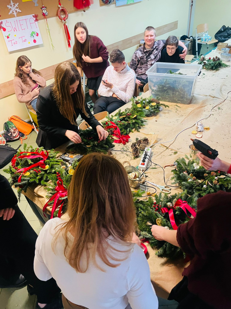 Warsztaty odbyły się w klasie, w miłej, ciepłej atmosferze, pełnej zapachu igliwia i świątecznych dekoracji. Był to czas twórczej pracy, radości i wspólnego przeżywania zbliżających się świąt Bożego Narodzenia. Powstałe stroiki z pewnością staną się piękną ozdobą domów uczniów i miłą pamiątką tego wyjątkowego spotkania.