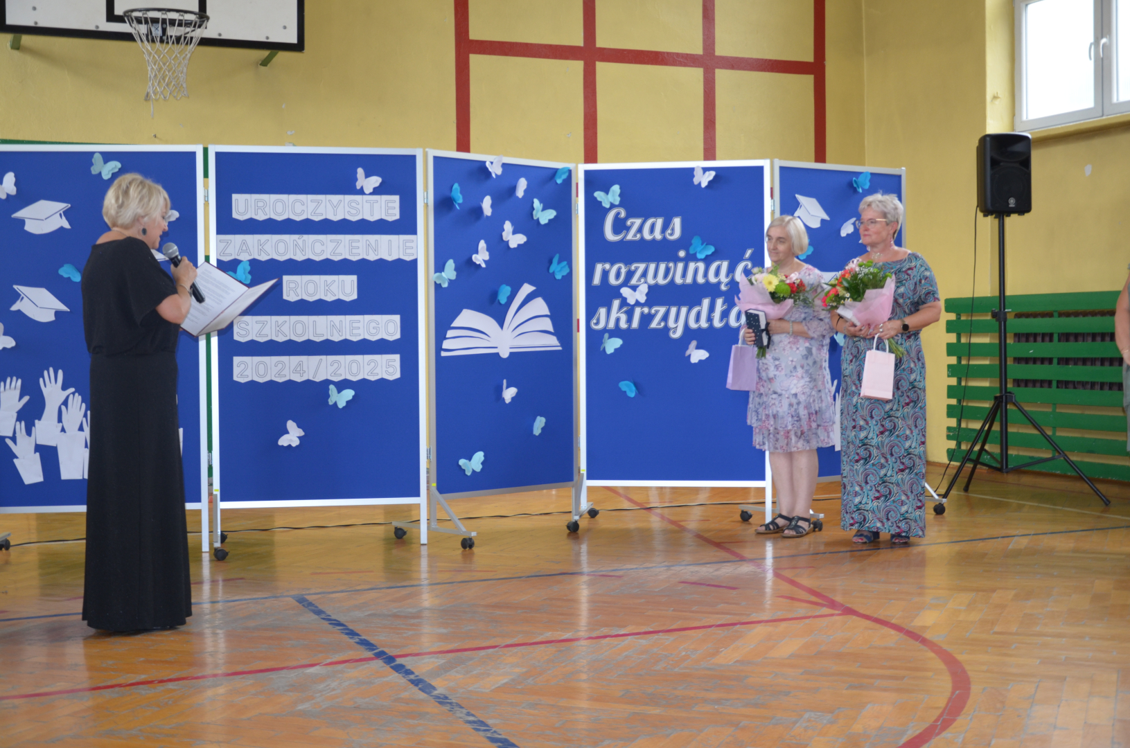 Wzruszającą chwilą było pożegnanie p. Małgorzaty Juszczyk oraz p. Teresy Gajdy, które z końcem roku szkolnego stały się szczęśliwymi emerytkami – nie zabrakło łez, ciepłych słów i serdecznych podziękowań od uczniów oraz grona pedagogicznego.