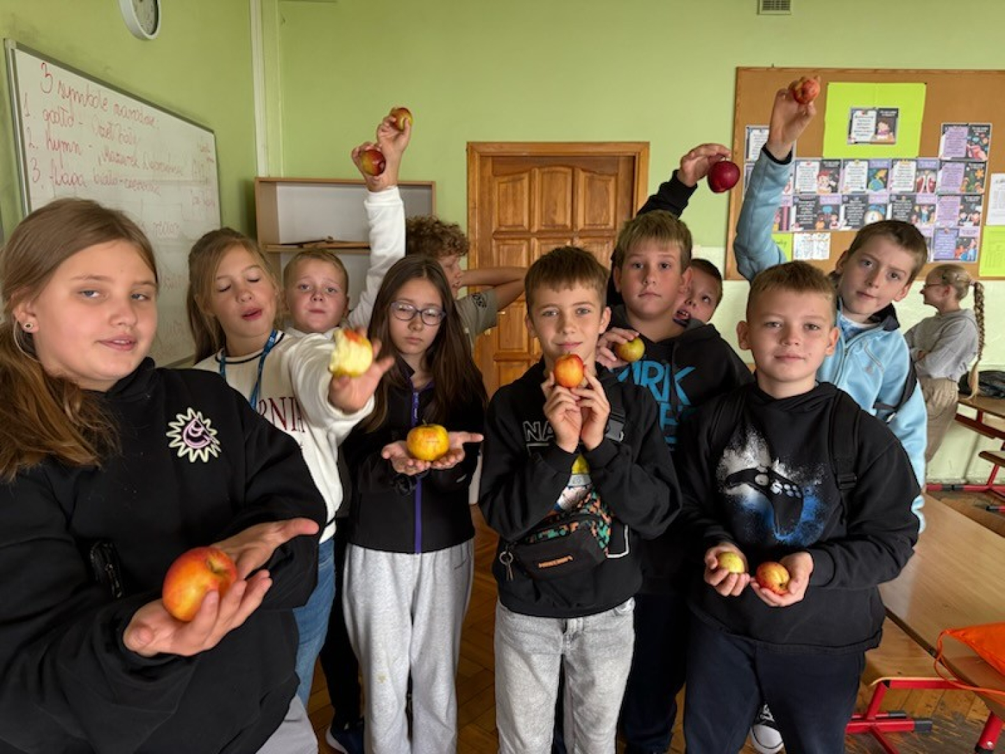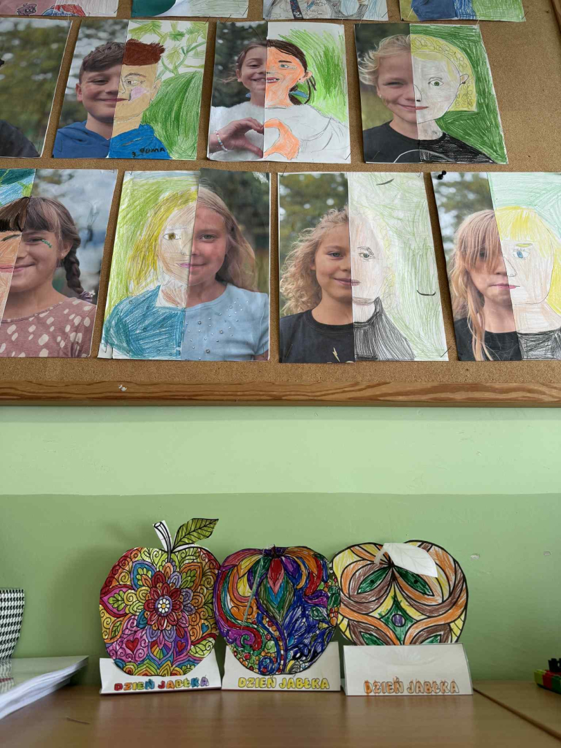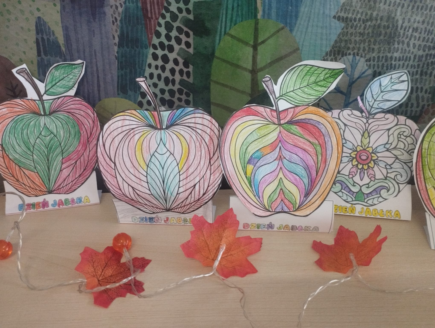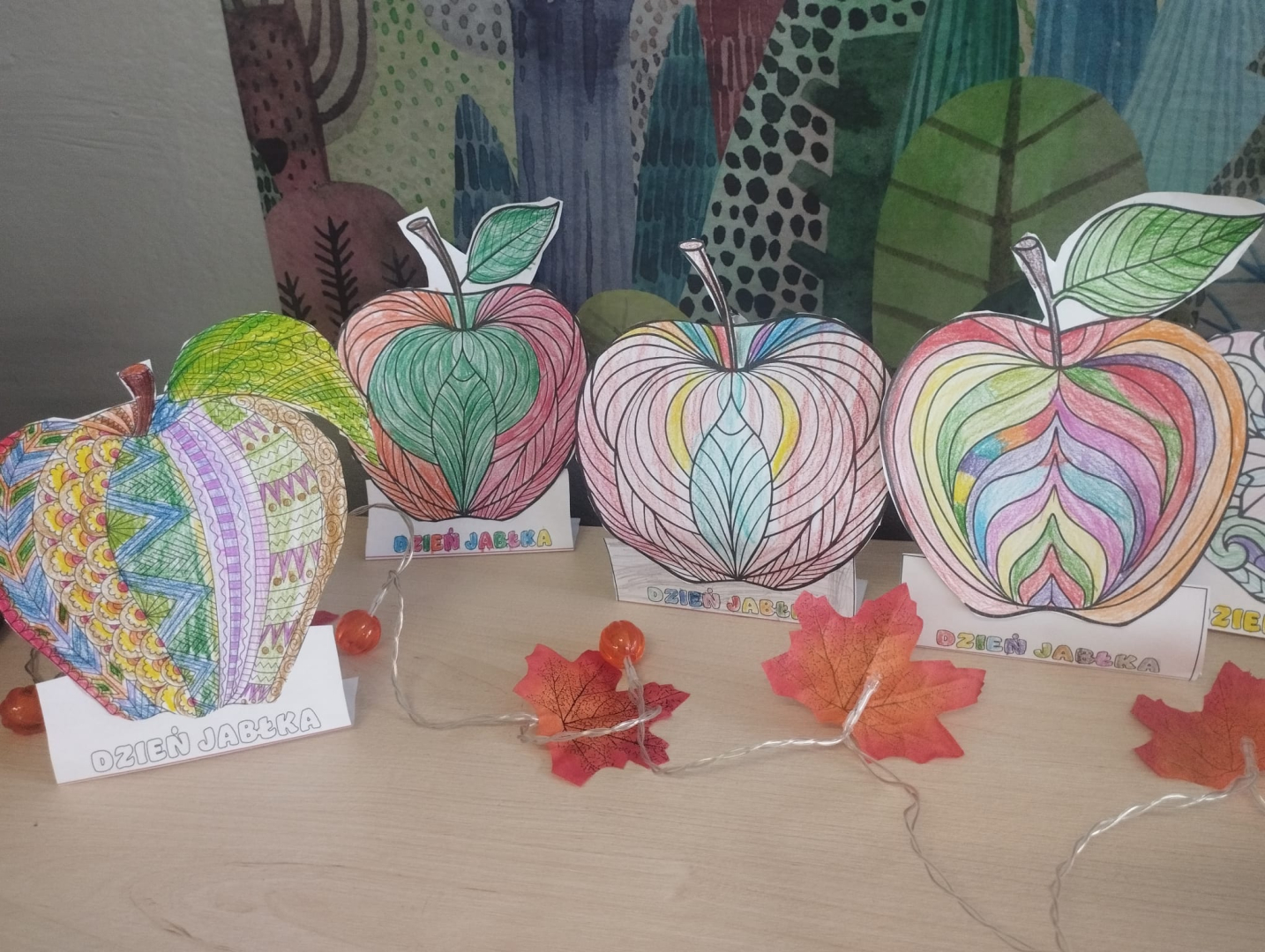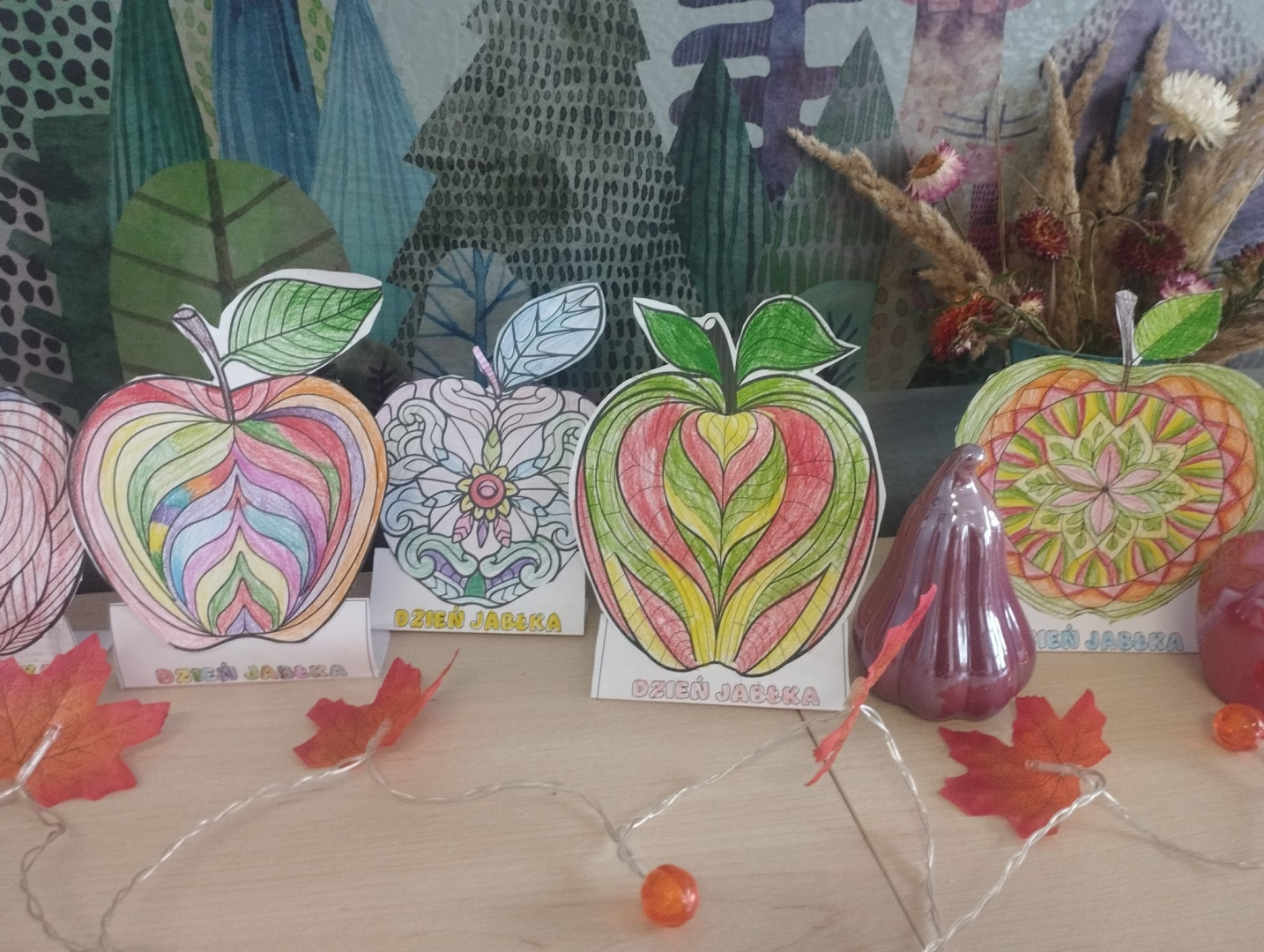 Uczniowie klas I–III przygotowali piękne, kolorowe prace – pokolorowane jabłka, które ozdobiły sale lekcyjne, tworząc wyjątkową, jesienną atmosferę. Każdy uczeń przyniósł także jabłko na drugie śniadanie, dzięki czemu mogliśmy wspólnie cieszyć się smakiem i wartościami odżywczymi tego wyjątkowego owocu.