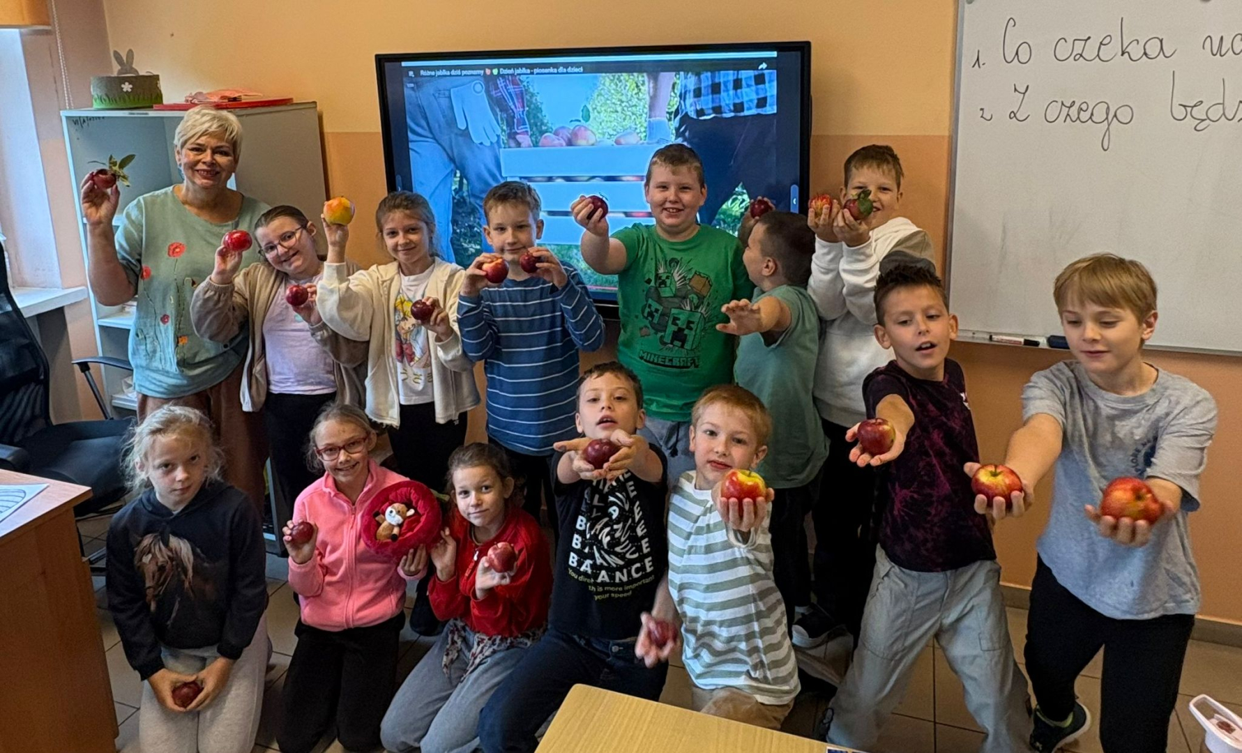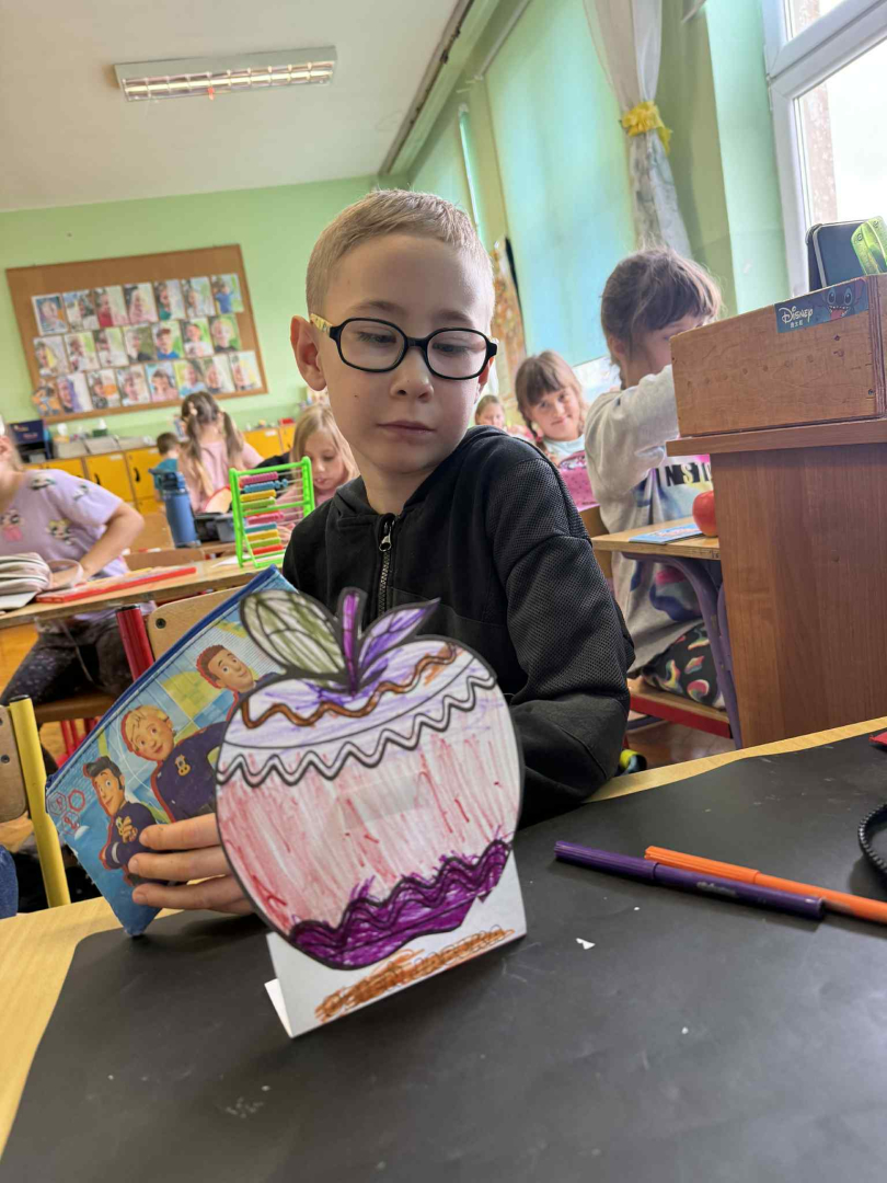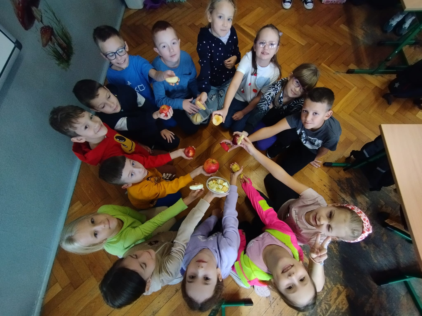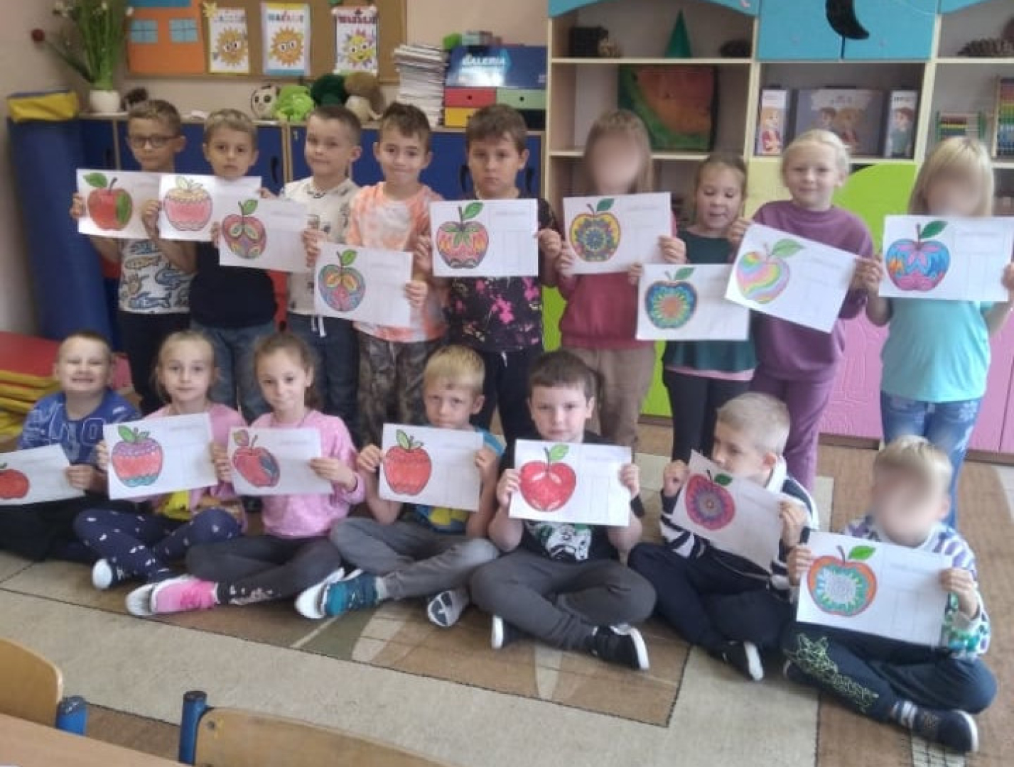 Uczniowie klas I–III przygotowali piękne, kolorowe prace – pokolorowane jabłka, które ozdobiły sale lekcyjne, tworząc wyjątkową, jesienną atmosferę. Każdy uczeń przyniósł także jabłko na drugie śniadanie, dzięki czemu mogliśmy wspólnie cieszyć się smakiem i wartościami odżywczymi tego wyjątkowego owocu.