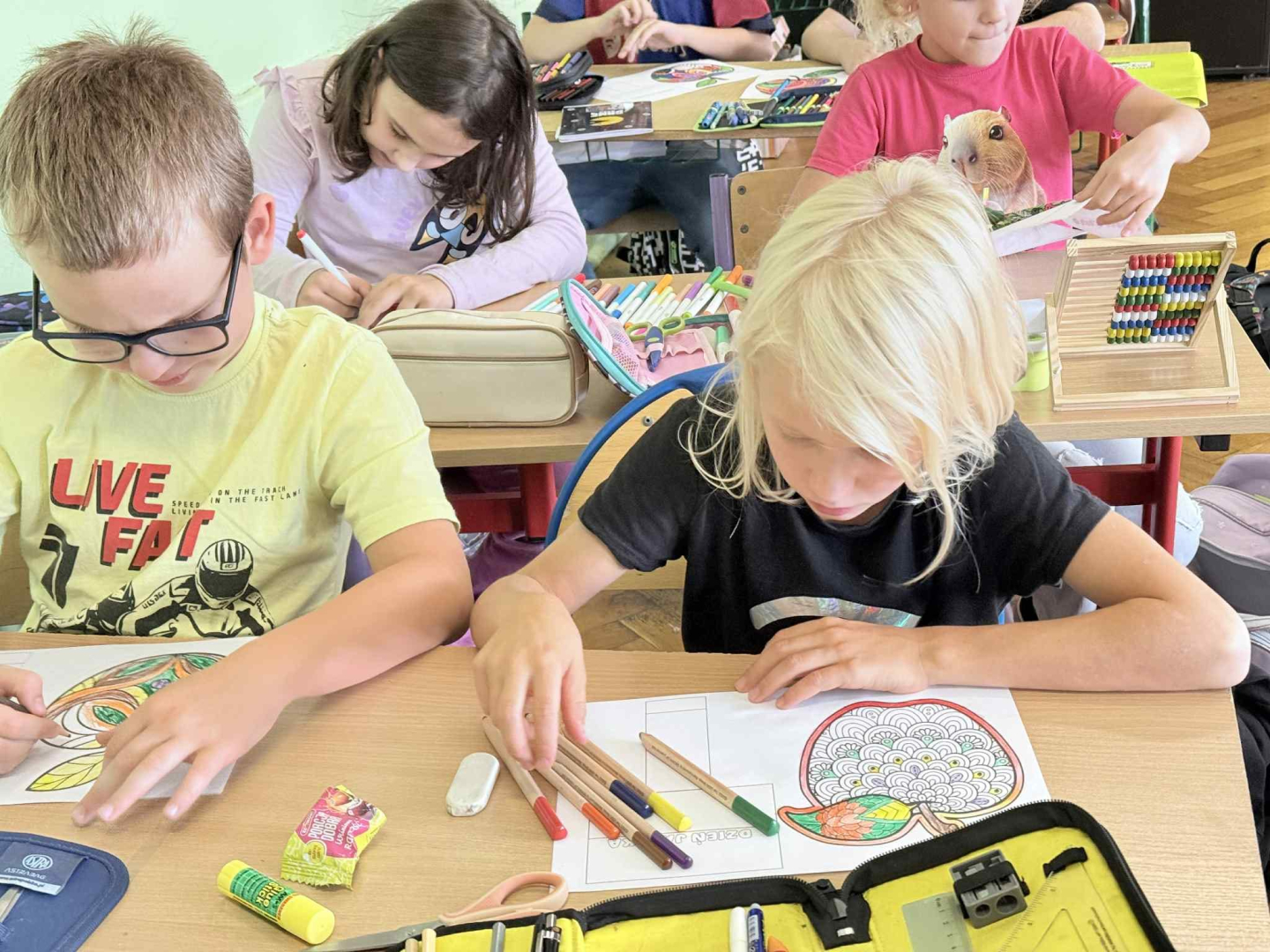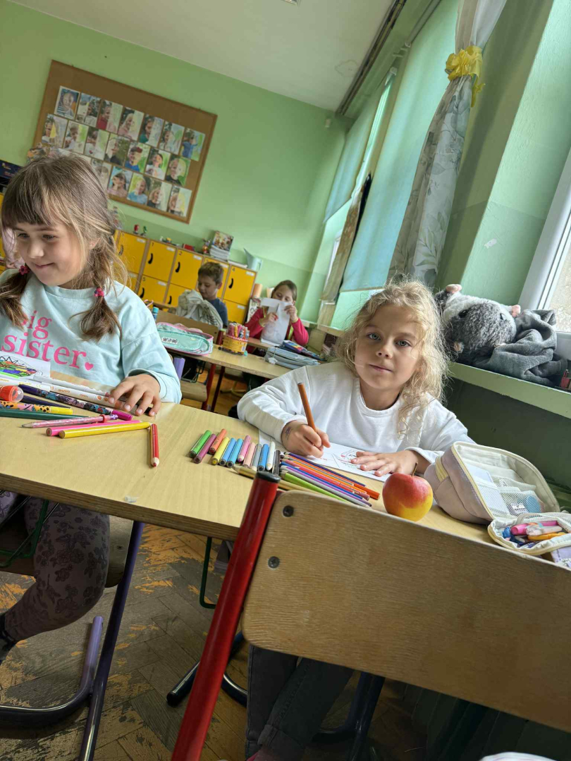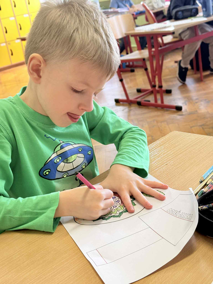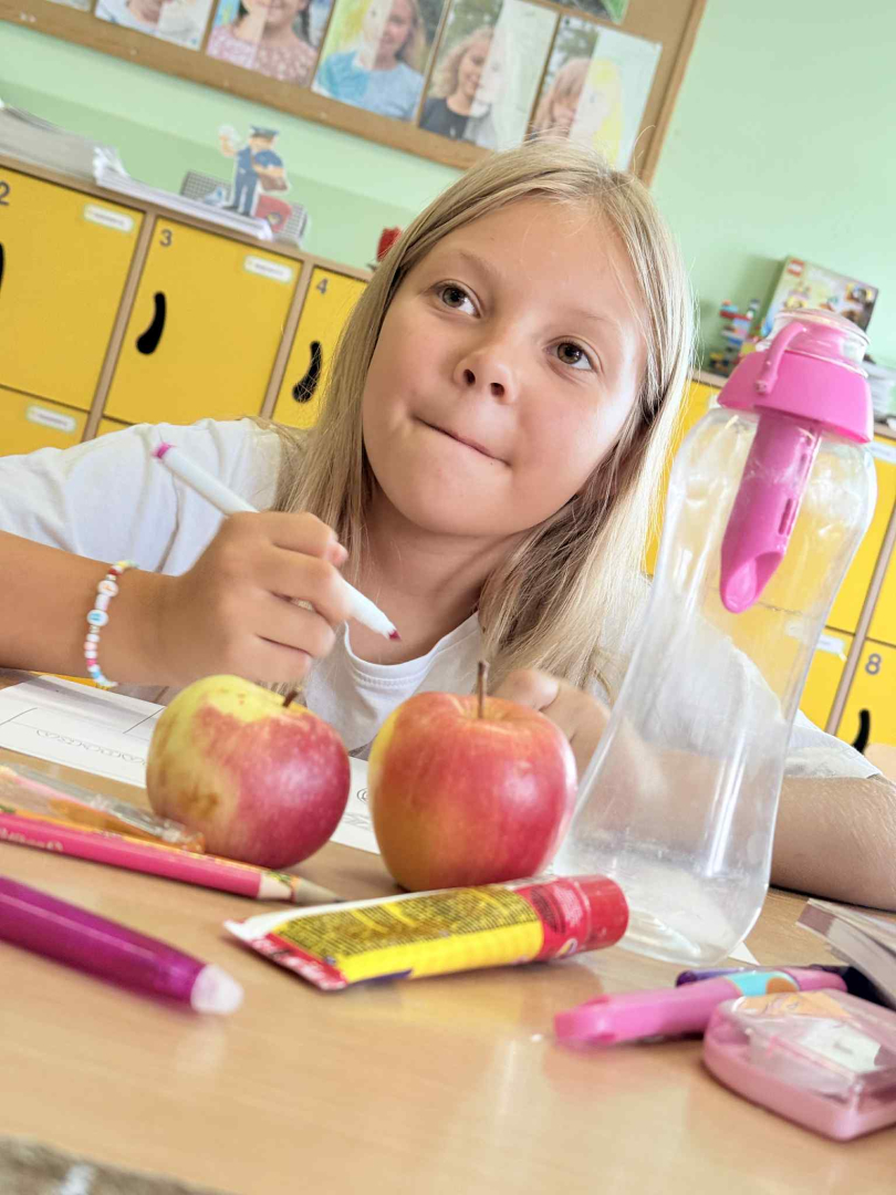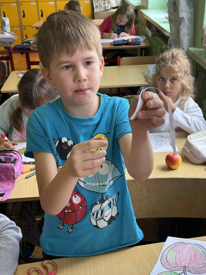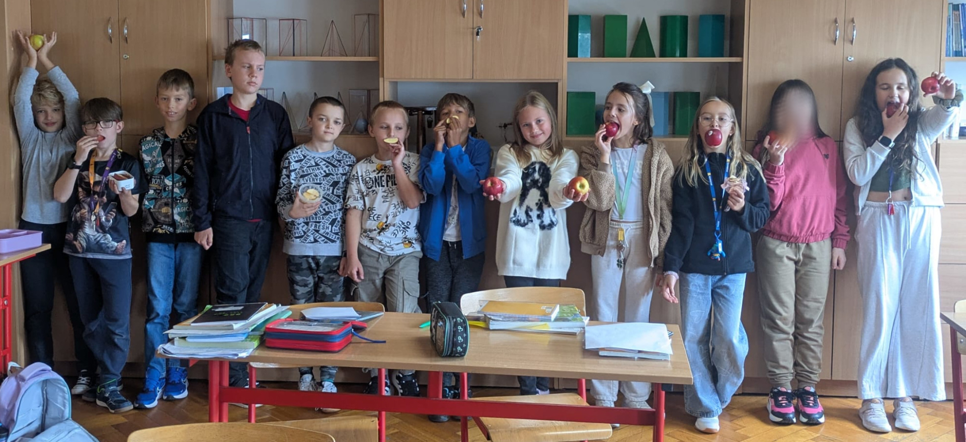 Uczniowie klas I–III przygotowali piękne, kolorowe prace – pokolorowane jabłka, które ozdobiły sale lekcyjne, tworząc wyjątkową, jesienną atmosferę. Każdy uczeń przyniósł także jabłko na drugie śniadanie, dzięki czemu mogliśmy wspólnie cieszyć się smakiem i wartościami odżywczymi tego wyjątkowego owocu.