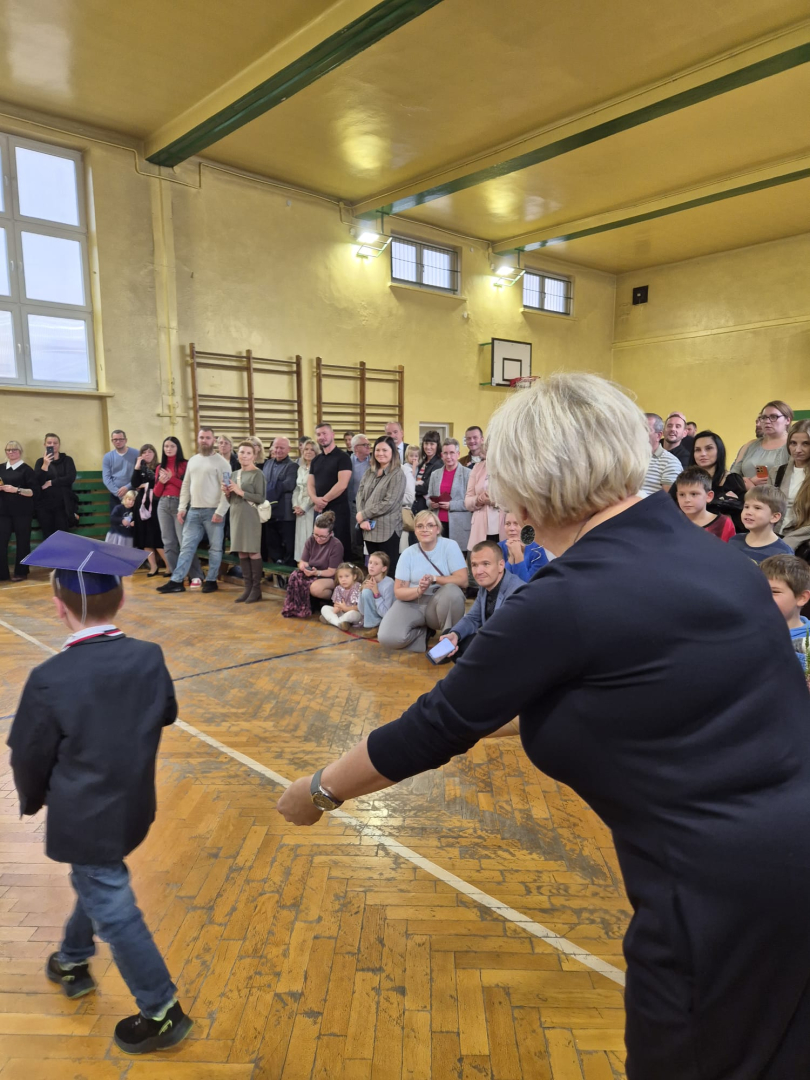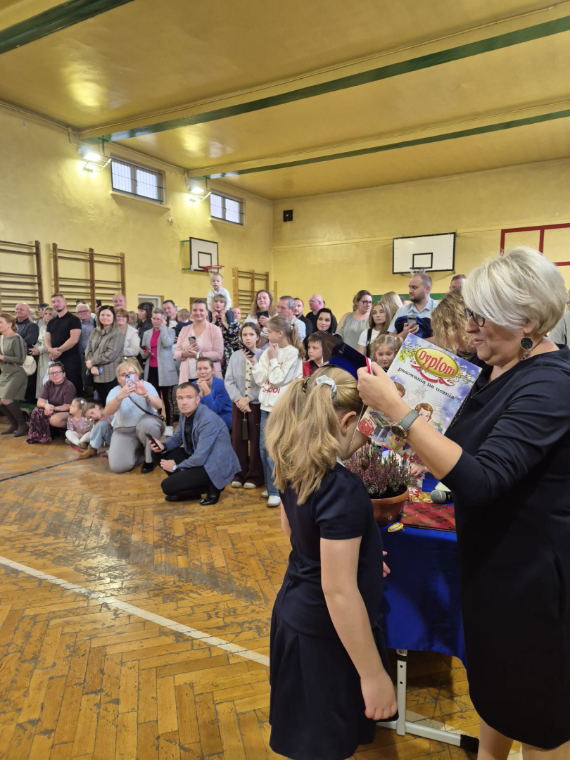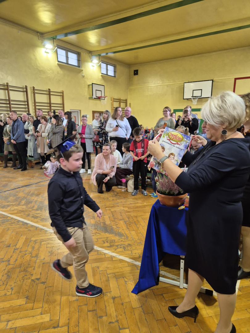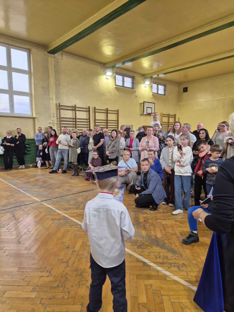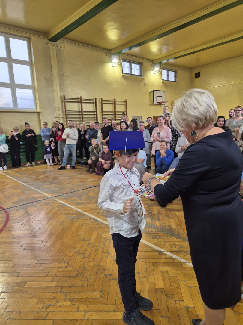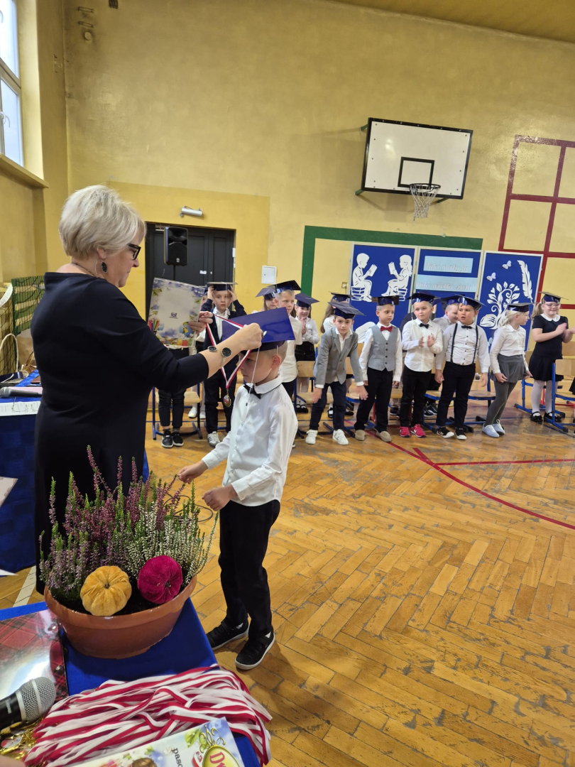 Mimo stresu związanego z pierwszym publicznym występem, dzieci doskonale sobie poradziły i udowodniły, że są gotowe, aby stać się stuprocentowymi uczniami. Dodatkowej wagi tej uroczystości dodali przybyli rodzice oraz Dyrekcja szkoły. W części artystycznej uczniowie zaprezentowali wierszyki, piosenki oraz wykonywali różne zadania. Po zakończeniu części artystycznej, w niezwykle podniosłej atmosferze, przed pocztem sztandarowym uczniowie ślubowali być dobrymi Polakami, godnie reprezentować swoją szkołę, swym zachowaniem i nauką sprawiać radość rodzicom i nauczycielom. Po złożeniu ślubowania Pani Dyrektor dokonała symbolicznego pasowania na ucznia. Wielką kredką, jak czarodziejską różdżką dotykała ramion swoich podopiecznych. Nie obyło się bez upominków i pamiątkowych zdjęć. Kochane Pierwszaki cieszymy się, że jesteście już uczniami i życzymy Wam sukcesów w nauce. Powodzenia.