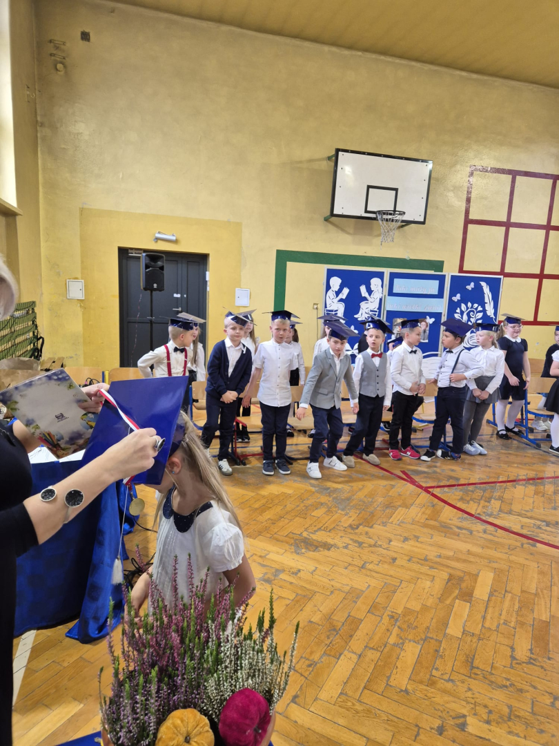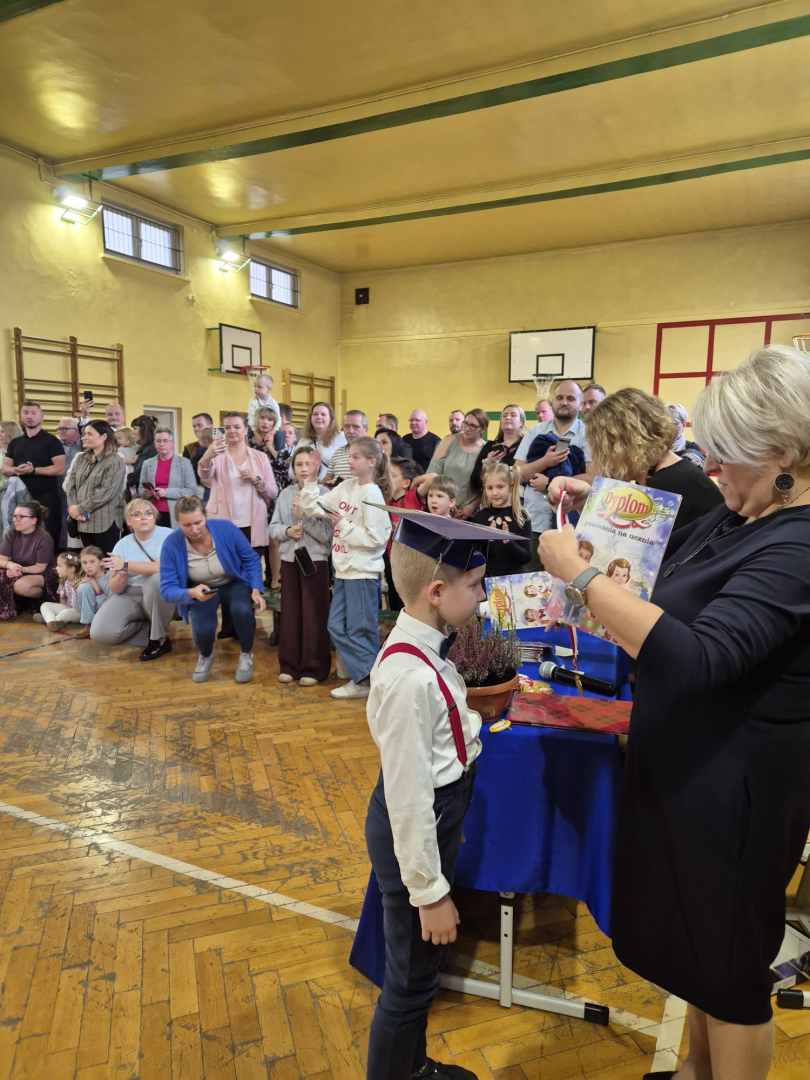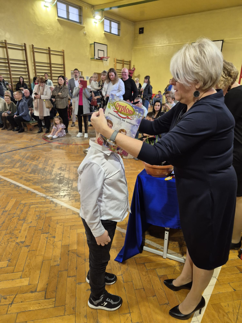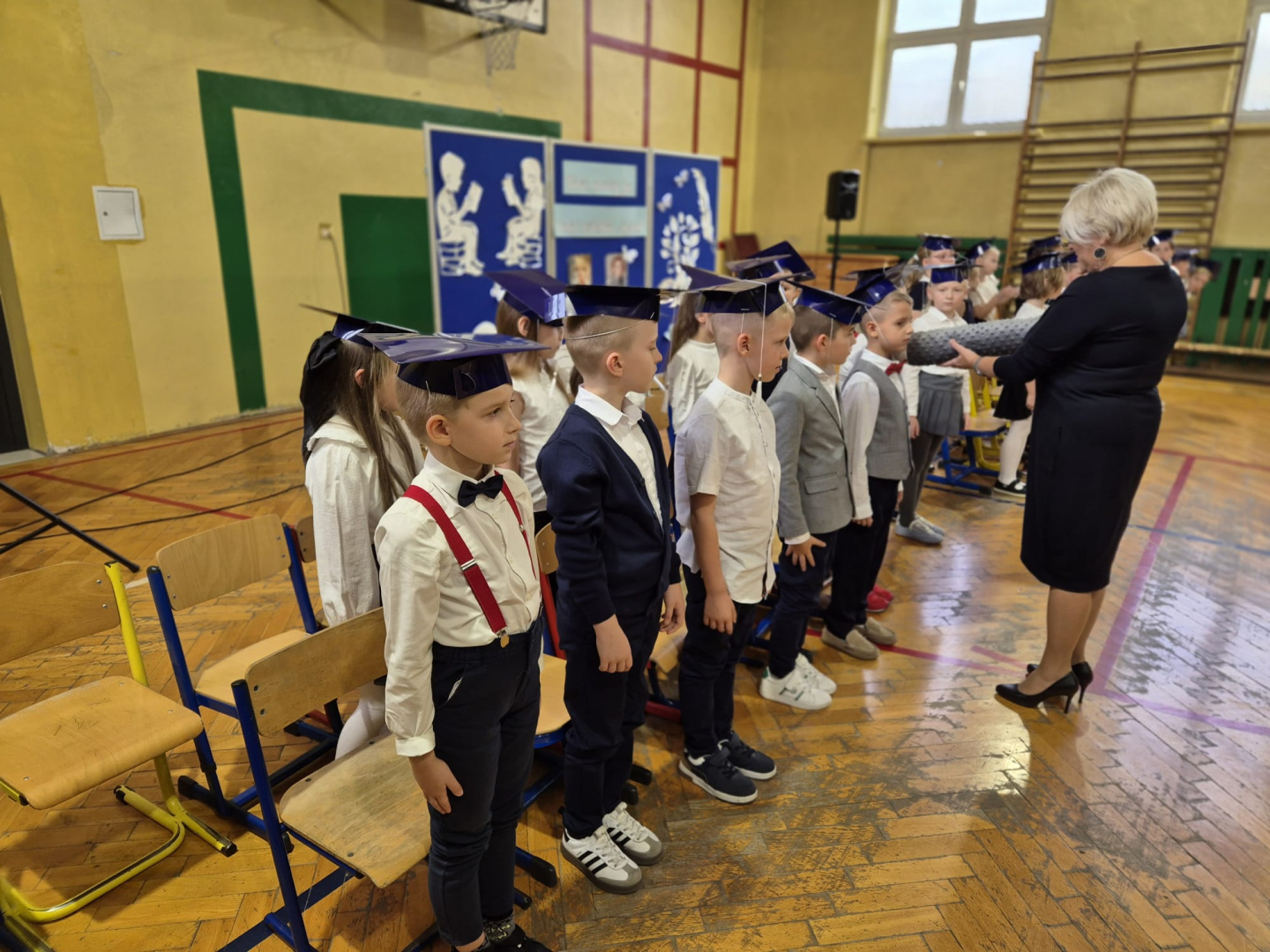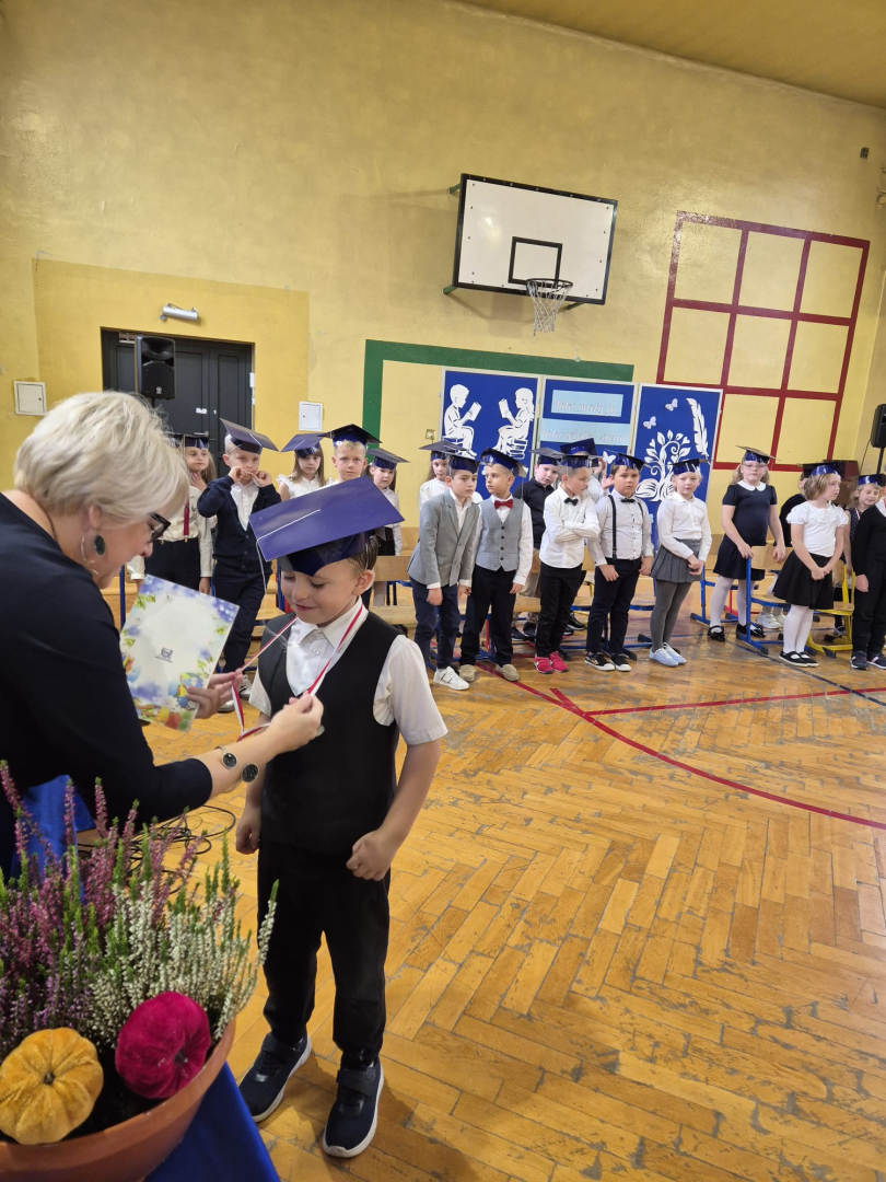 Mimo stresu związanego z pierwszym publicznym występem, dzieci doskonale sobie poradziły i udowodniły, że są gotowe, aby stać się stuprocentowymi uczniami. Dodatkowej wagi tej uroczystości dodali przybyli rodzice oraz Dyrekcja szkoły. W części artystycznej uczniowie zaprezentowali wierszyki, piosenki oraz wykonywali różne zadania. Po zakończeniu części artystycznej, w niezwykle podniosłej atmosferze, przed pocztem sztandarowym uczniowie ślubowali być dobrymi Polakami, godnie reprezentować swoją szkołę, swym zachowaniem i nauką sprawiać radość rodzicom i nauczycielom. Po złożeniu ślubowania Pani Dyrektor dokonała symbolicznego pasowania na ucznia. Wielką kredką, jak czarodziejską różdżką dotykała ramion swoich podopiecznych. Nie obyło się bez upominków i pamiątkowych zdjęć. Kochane Pierwszaki cieszymy się, że jesteście już uczniami i życzymy Wam sukcesów w nauce. Powodzenia.