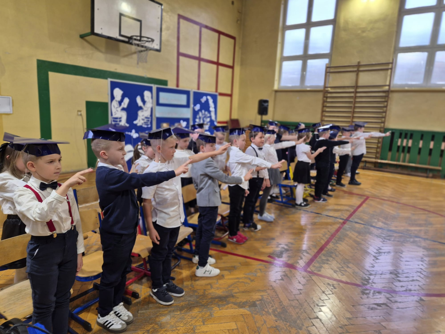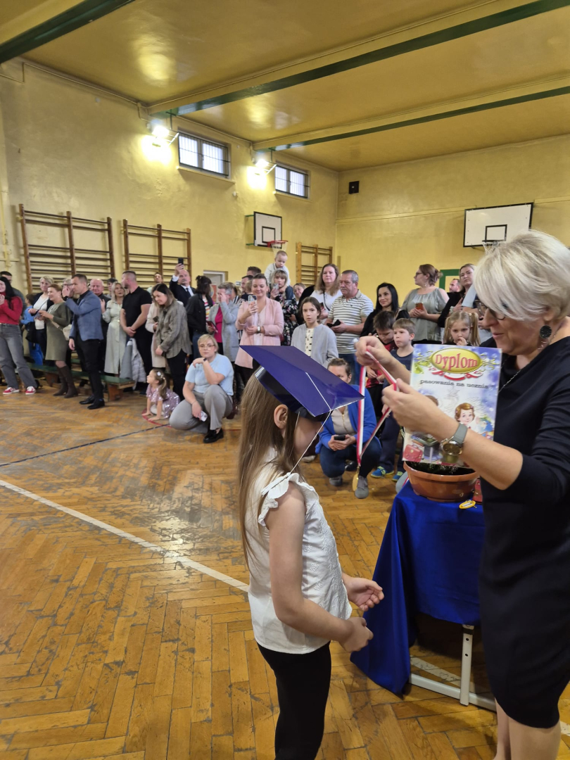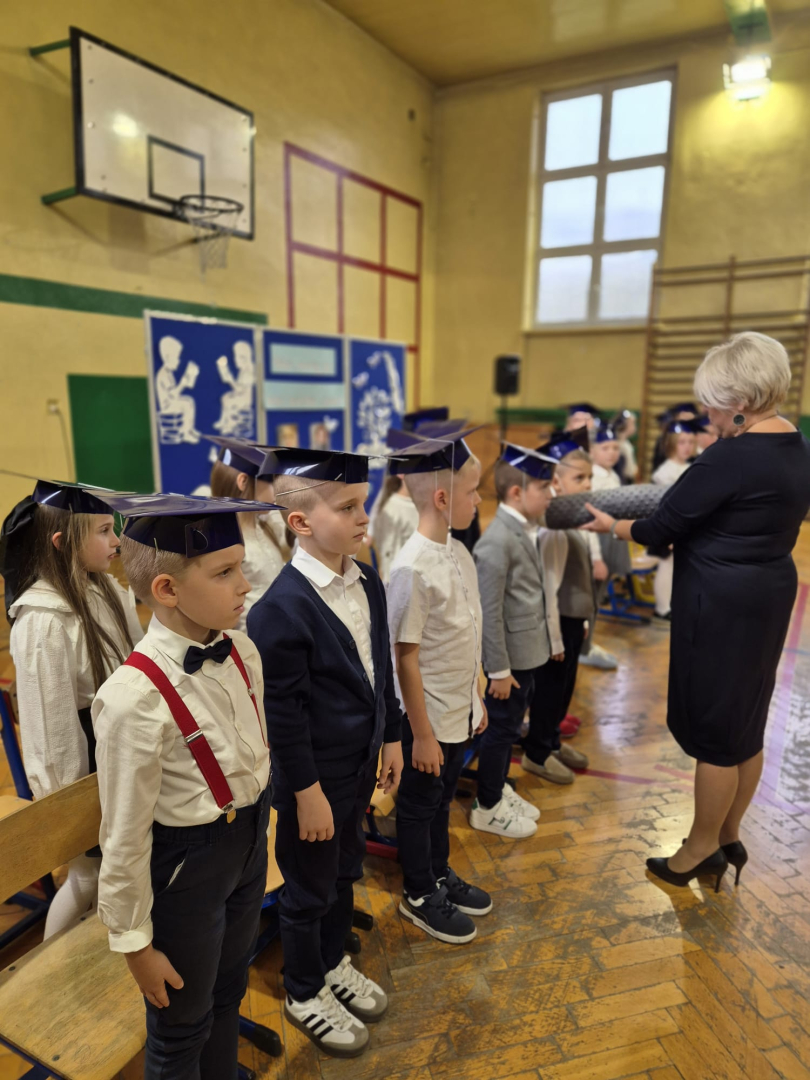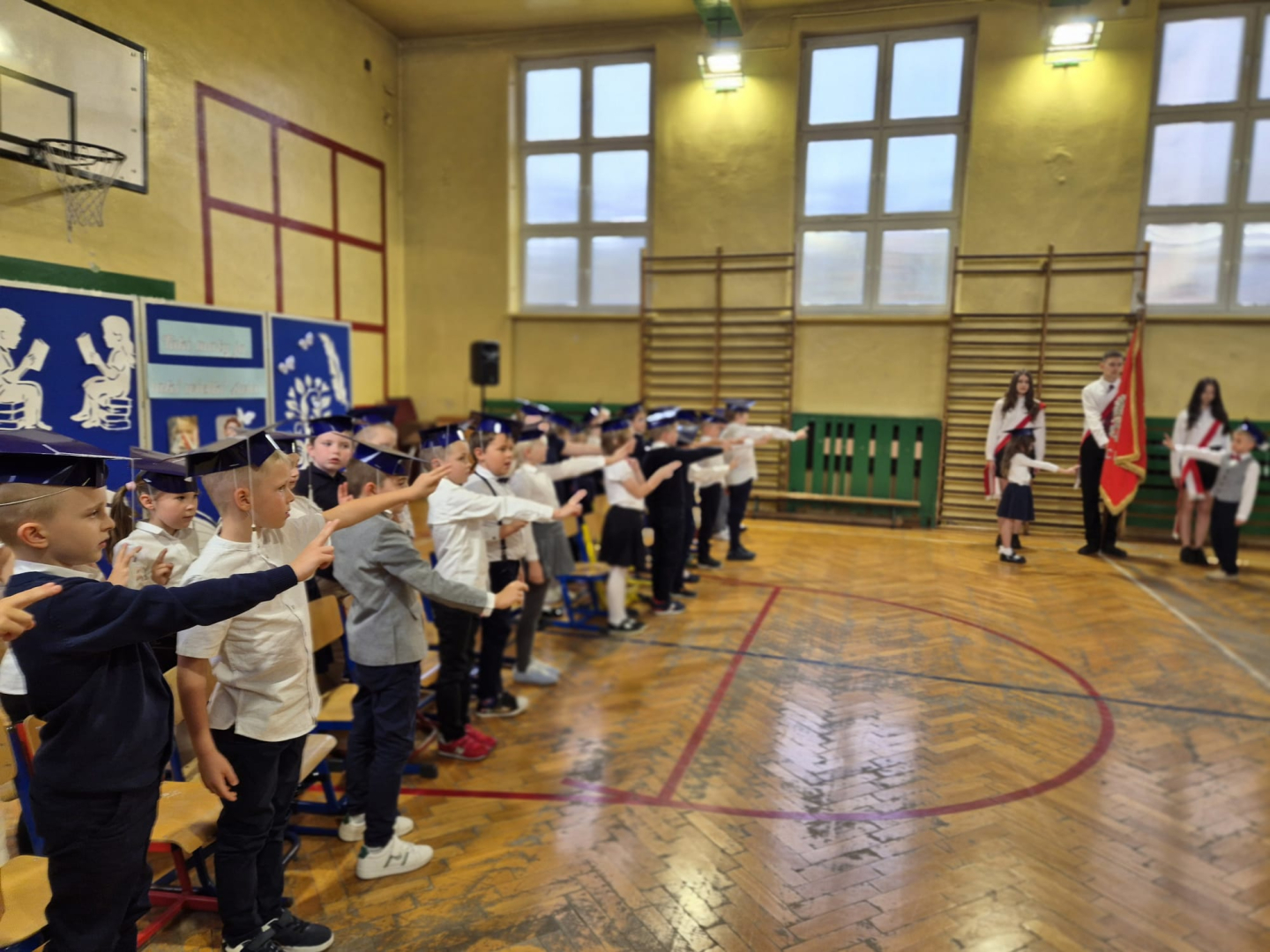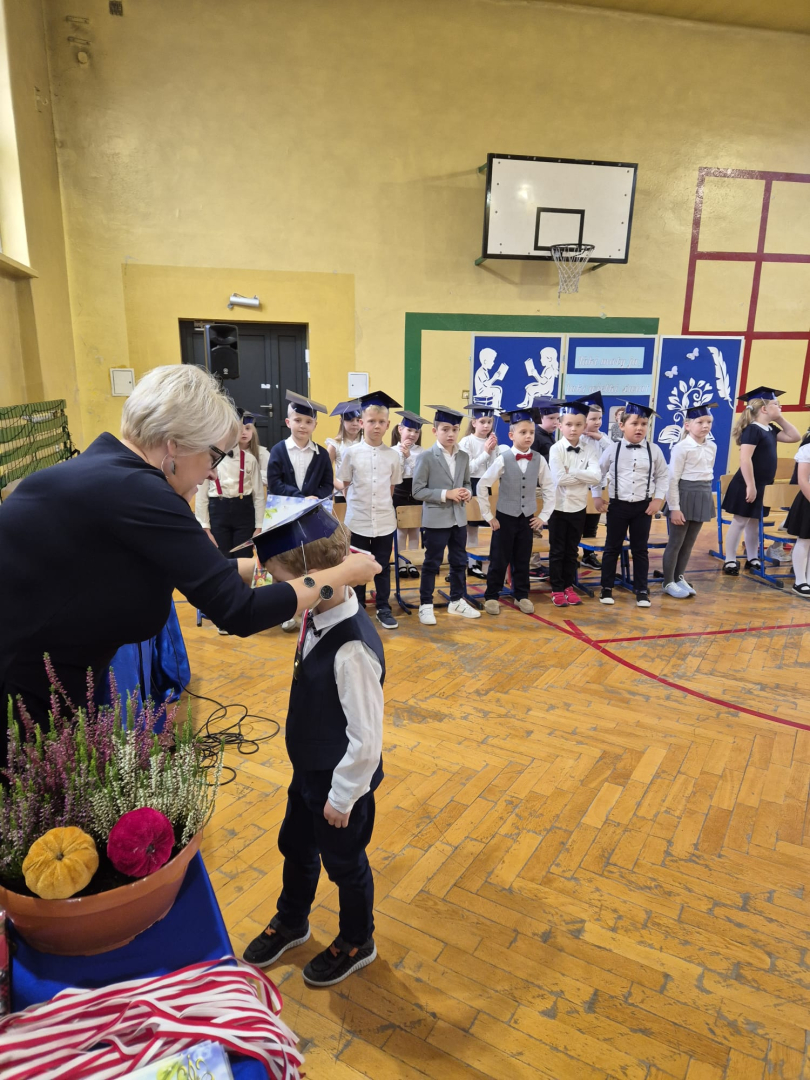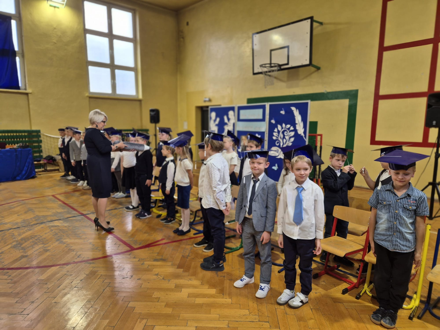 Mimo stresu związanego z pierwszym publicznym występem, dzieci doskonale sobie poradziły i udowodniły, że są gotowe, aby stać się stuprocentowymi uczniami. Dodatkowej wagi tej uroczystości dodali przybyli rodzice oraz Dyrekcja szkoły. W części artystycznej uczniowie zaprezentowali wierszyki, piosenki oraz wykonywali różne zadania. Po zakończeniu części artystycznej, w niezwykle podniosłej atmosferze, przed pocztem sztandarowym uczniowie ślubowali być dobrymi Polakami, godnie reprezentować swoją szkołę, swym zachowaniem i nauką sprawiać radość rodzicom i nauczycielom. Po złożeniu ślubowania Pani Dyrektor dokonała symbolicznego pasowania na ucznia. Wielką kredką, jak czarodziejską różdżką dotykała ramion swoich podopiecznych. Nie obyło się bez upominków i pamiątkowych zdjęć. Kochane Pierwszaki cieszymy się, że jesteście już uczniami i życzymy Wam sukcesów w nauce. Powodzenia.