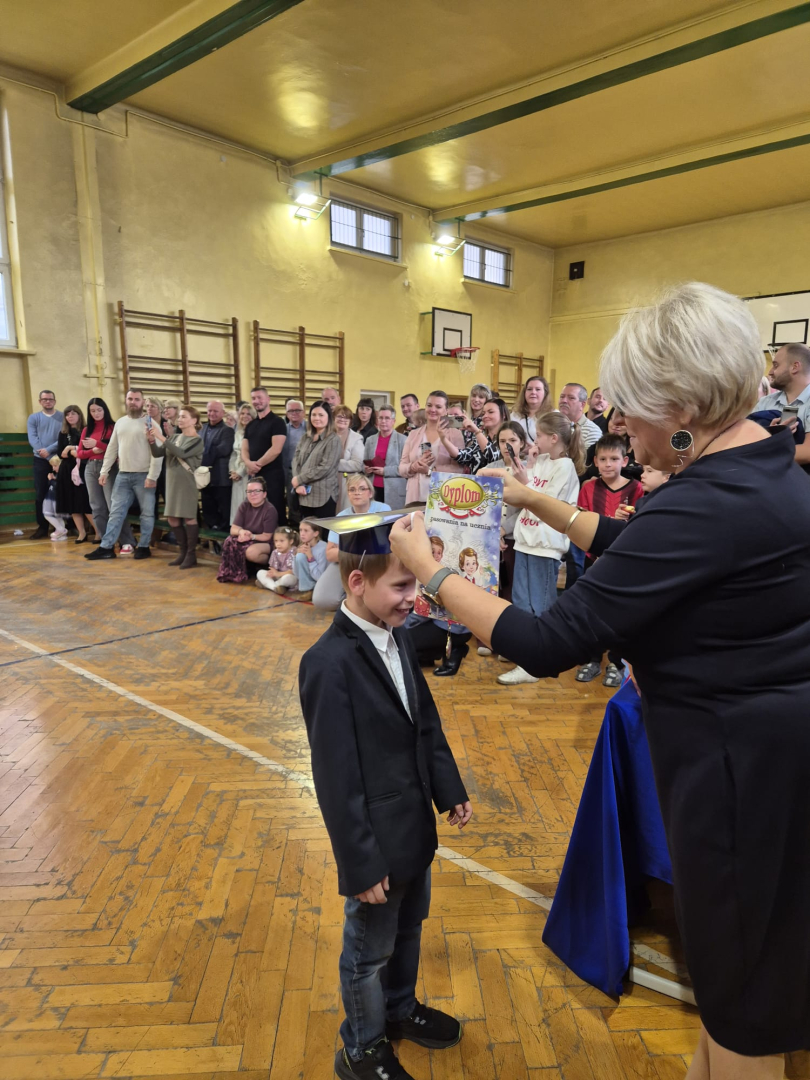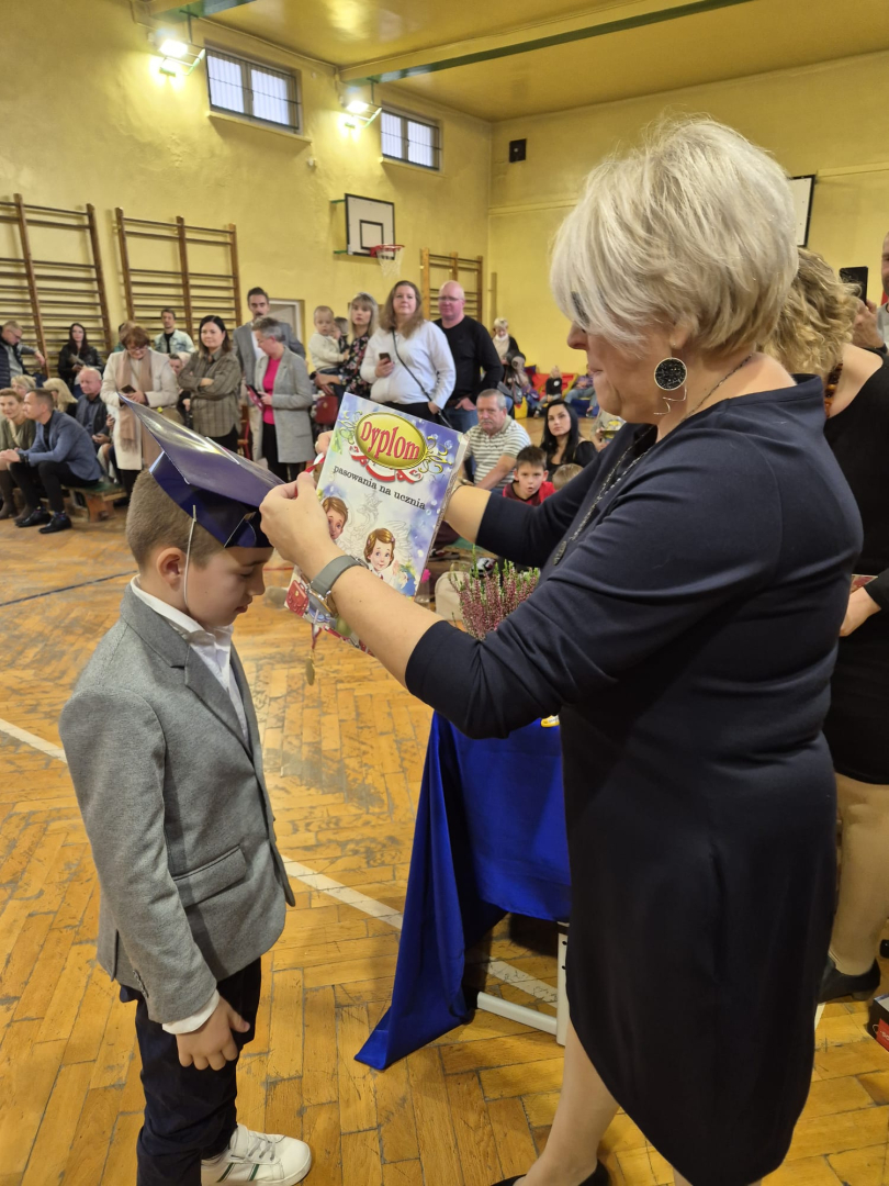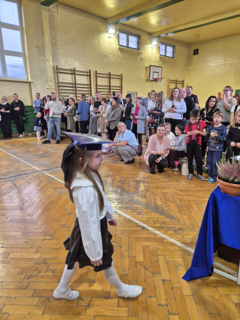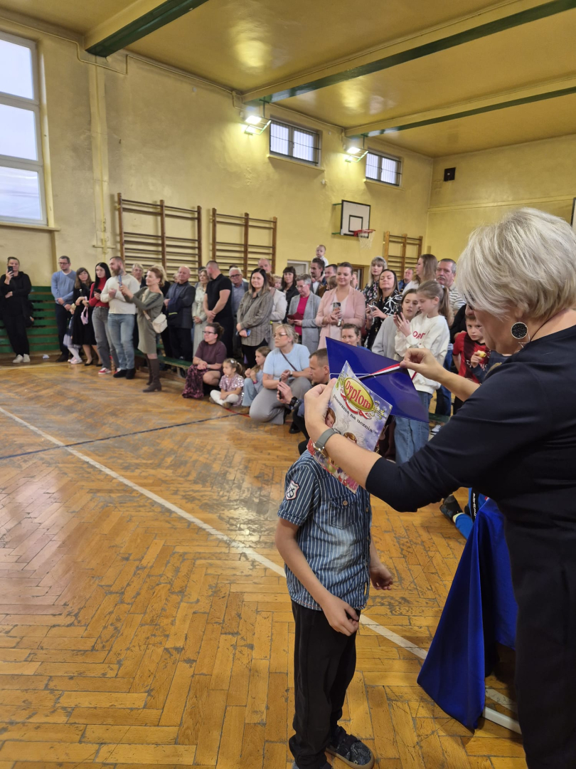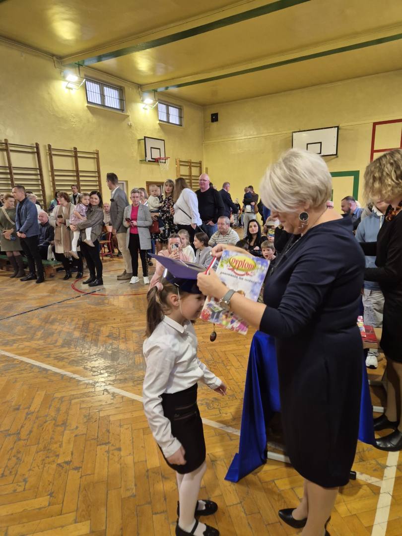 Mimo stresu związanego z pierwszym publicznym występem, dzieci doskonale sobie poradziły i udowodniły, że są gotowe, aby stać się stuprocentowymi uczniami. Dodatkowej wagi tej uroczystości dodali przybyli rodzice oraz Dyrekcja szkoły. W części artystycznej uczniowie zaprezentowali wierszyki, piosenki oraz wykonywali różne zadania. Po zakończeniu części artystycznej, w niezwykle podniosłej atmosferze, przed pocztem sztandarowym uczniowie ślubowali być dobrymi Polakami, godnie reprezentować swoją szkołę, swym zachowaniem i nauką sprawiać radość rodzicom i nauczycielom. Po złożeniu ślubowania Pani Dyrektor dokonała symbolicznego pasowania na ucznia. Wielką kredką, jak czarodziejską różdżką dotykała ramion swoich podopiecznych. Nie obyło się bez upominków i pamiątkowych zdjęć. Kochane Pierwszaki cieszymy się, że jesteście już uczniami i życzymy Wam sukcesów w nauce. Powodzenia.