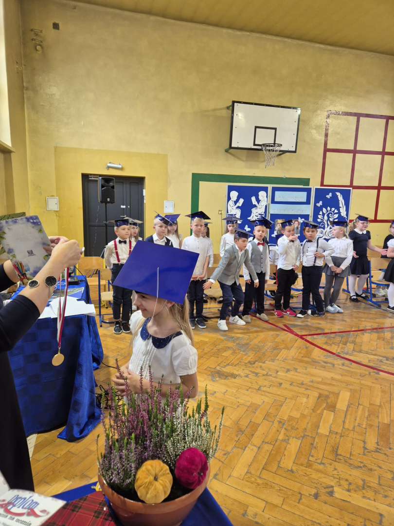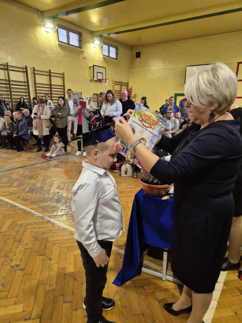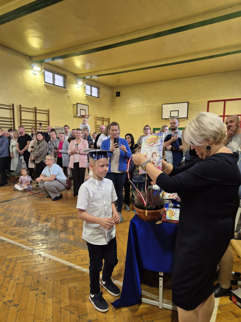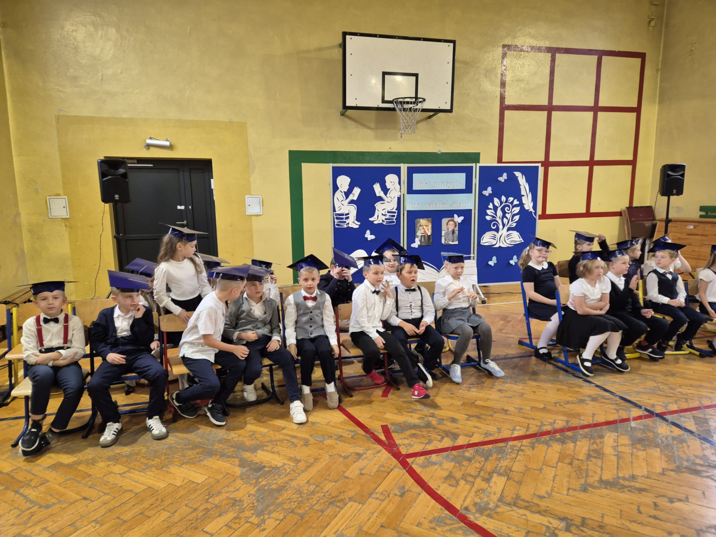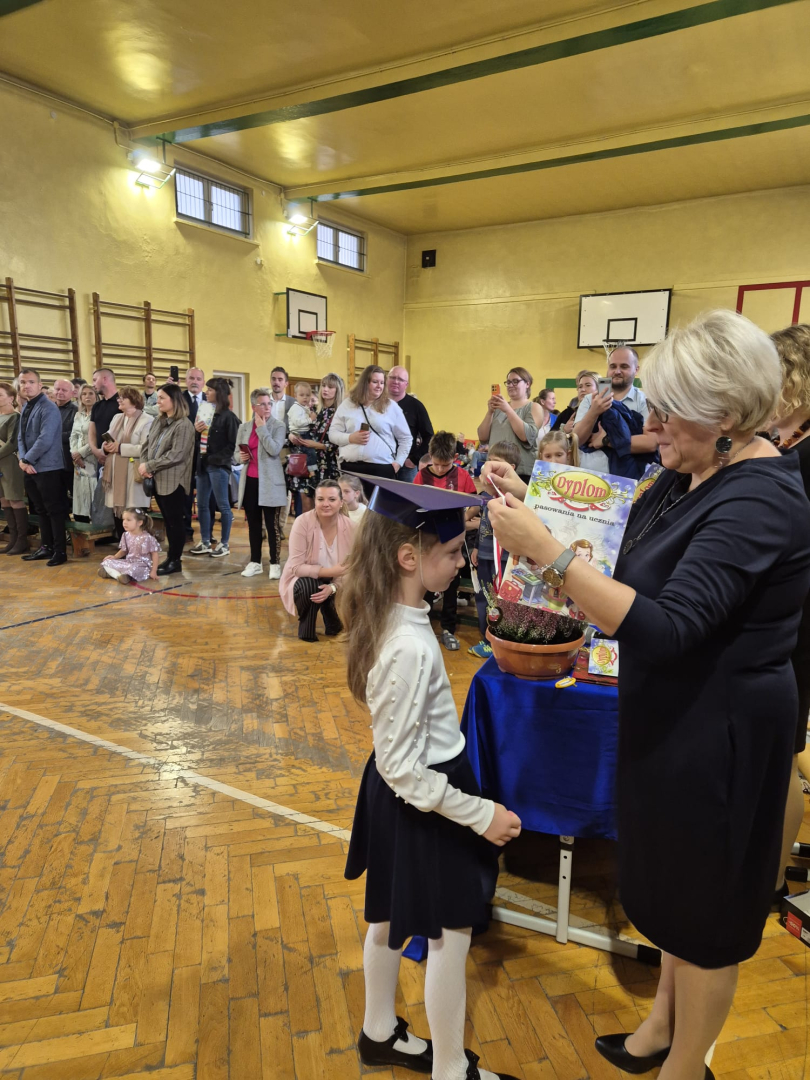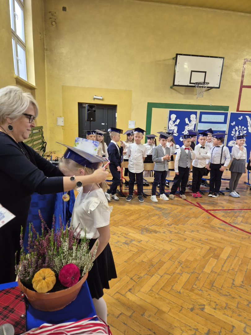 Mimo stresu związanego z pierwszym publicznym występem, dzieci doskonale sobie poradziły i udowodniły, że są gotowe, aby stać się stuprocentowymi uczniami. Dodatkowej wagi tej uroczystości dodali przybyli rodzice oraz Dyrekcja szkoły. W części artystycznej uczniowie zaprezentowali wierszyki, piosenki oraz wykonywali różne zadania. Po zakończeniu części artystycznej, w niezwykle podniosłej atmosferze, przed pocztem sztandarowym uczniowie ślubowali być dobrymi Polakami, godnie reprezentować swoją szkołę, swym zachowaniem i nauką sprawiać radość rodzicom i nauczycielom. Po złożeniu ślubowania Pani Dyrektor dokonała symbolicznego pasowania na ucznia. Wielką kredką, jak czarodziejską różdżką dotykała ramion swoich podopiecznych. Nie obyło się bez upominków i pamiątkowych zdjęć. Kochane Pierwszaki cieszymy się, że jesteście już uczniami i życzymy Wam sukcesów w nauce. Powodzenia.