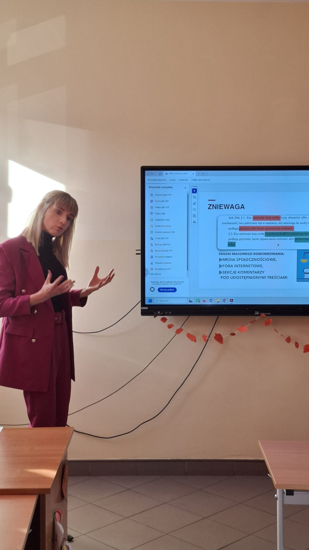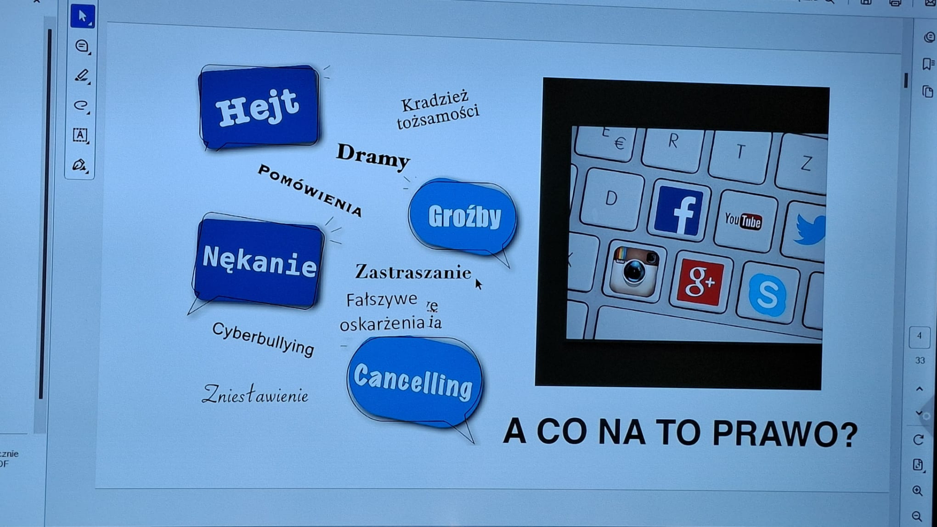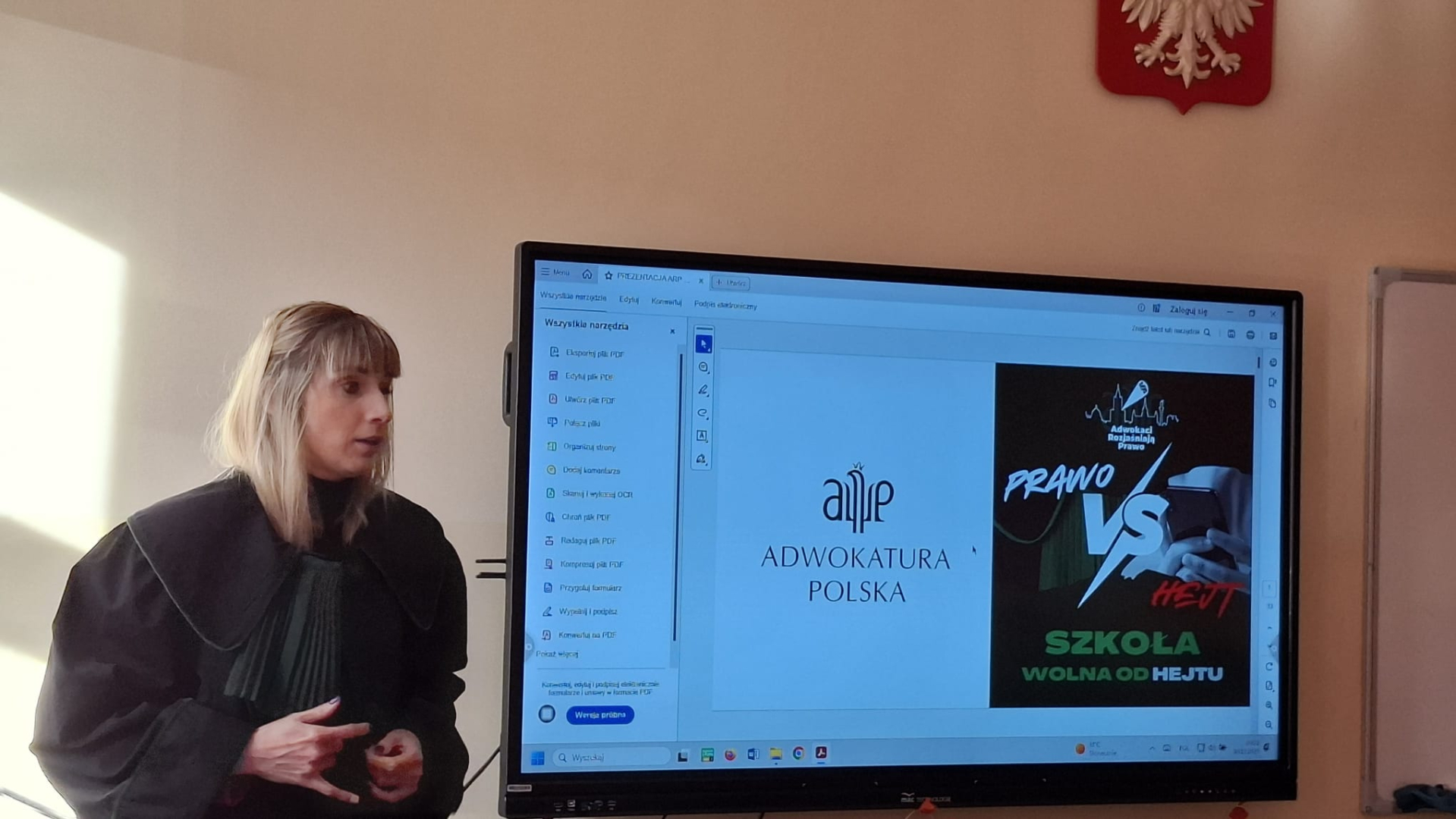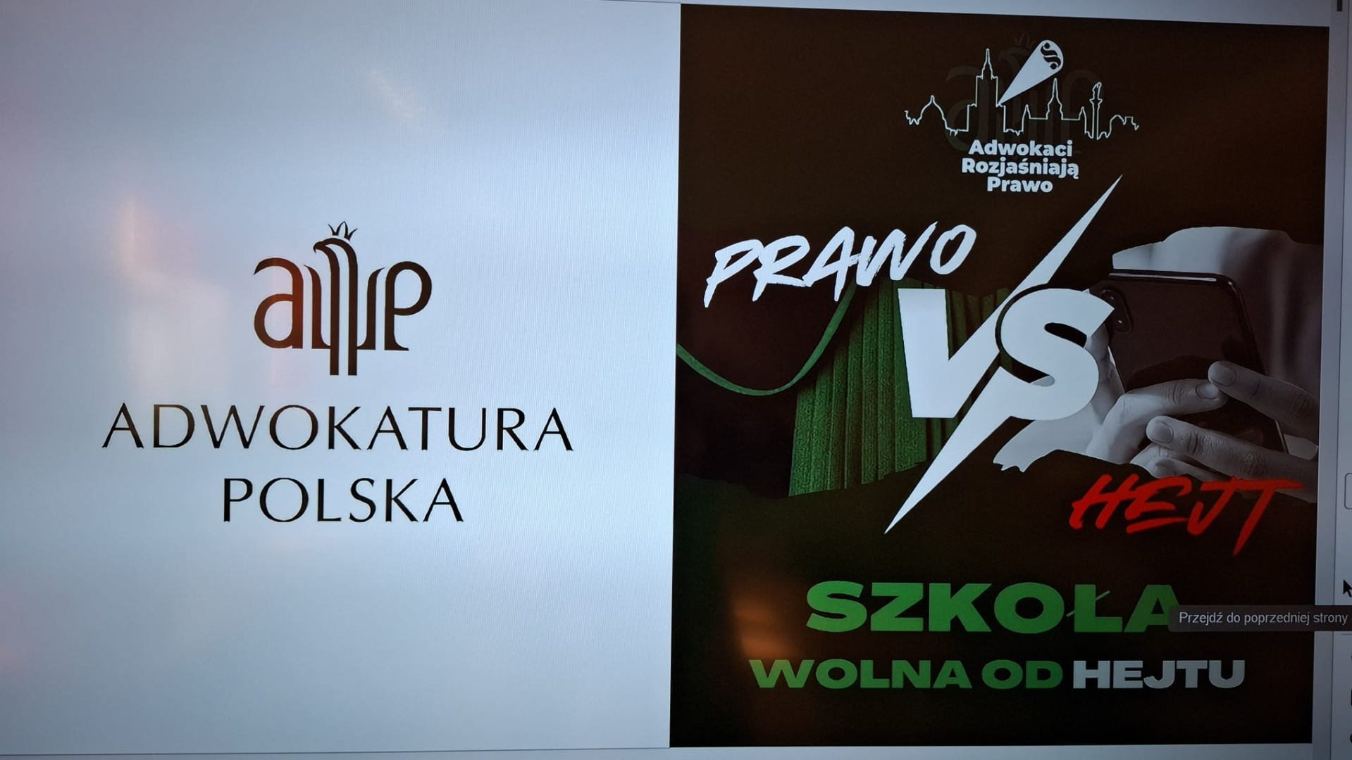 Tematem spotkania było Prawo vs hejt. Szkoła wolna od hejtu - zjawisko, które niestety coraz częściej dotyka młodych ludzi. Pani adwokat w przystępny i angażujący sposób opowiedziała o tym, czym jest hejt, jakie mogą być jego konsekwencje prawne, a także jak skutecznie się przed nim bronić.