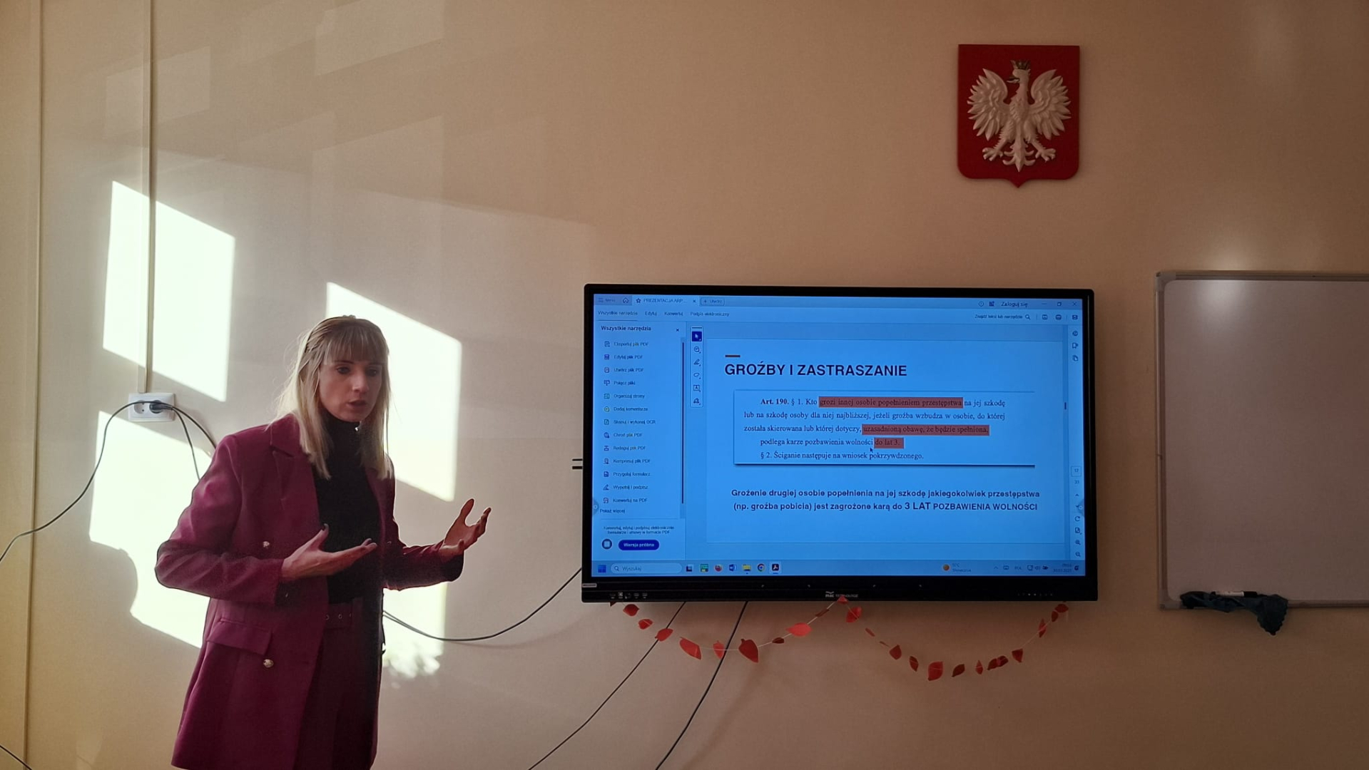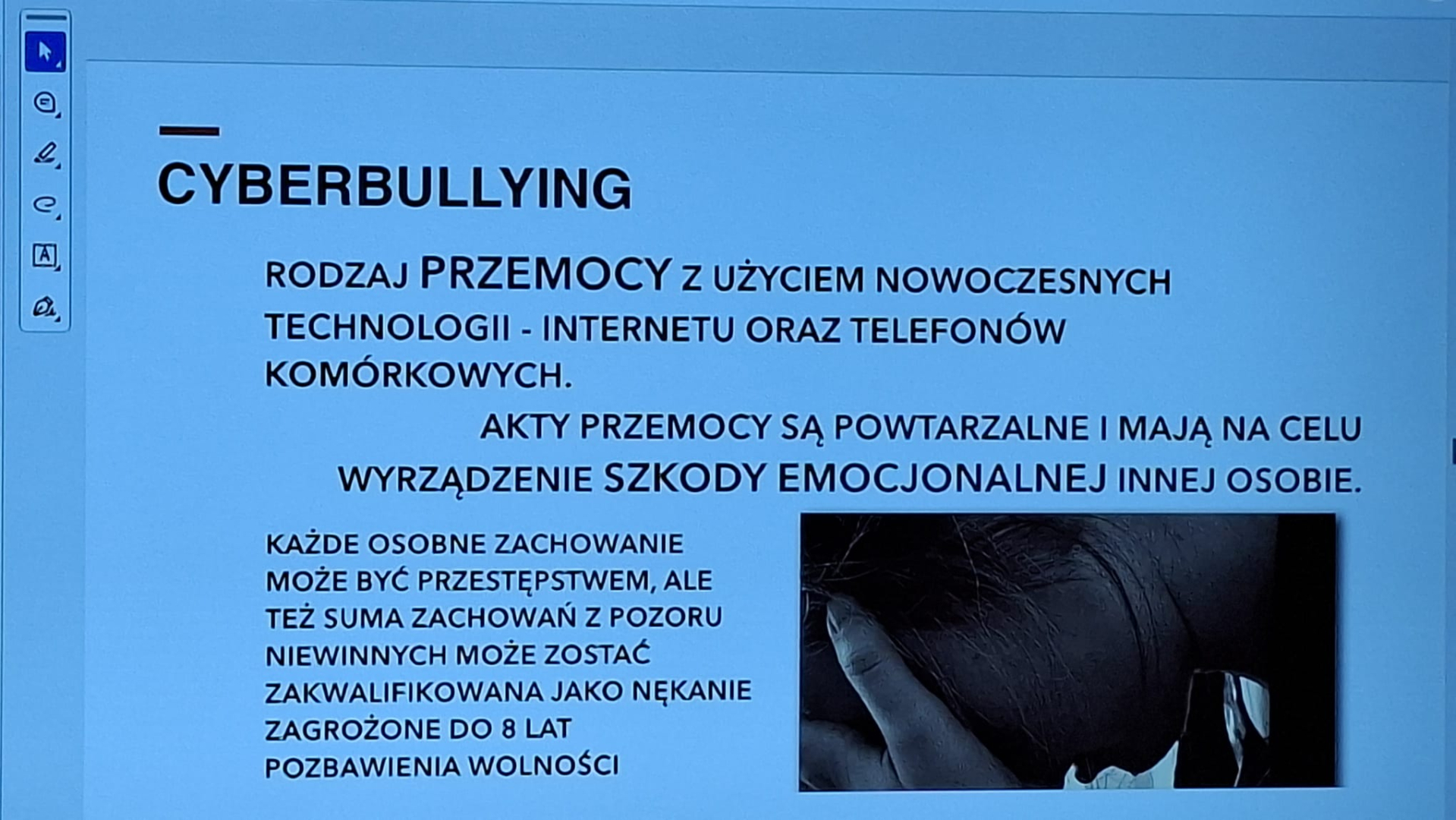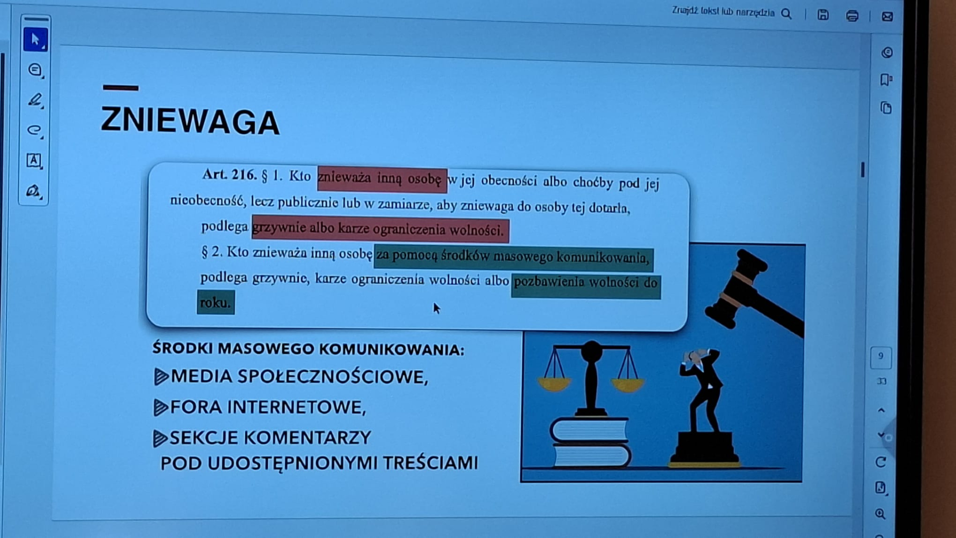 Tematem spotkania było Prawo vs hejt. Szkoła wolna od hejtu - zjawisko, które niestety coraz częściej dotyka młodych ludzi. Pani adwokat w przystępny i angażujący sposób opowiedziała o tym, czym jest hejt, jakie mogą być jego konsekwencje prawne, a także jak skutecznie się przed nim bronić.