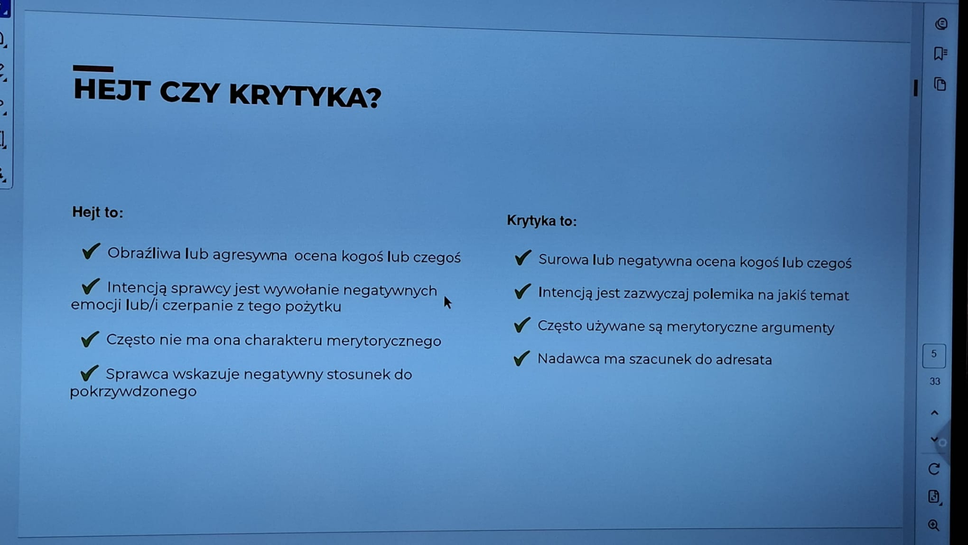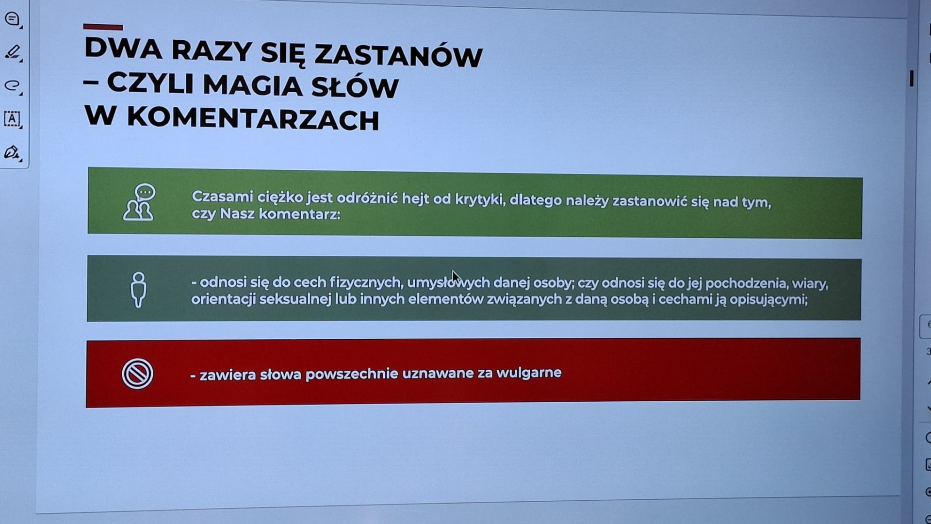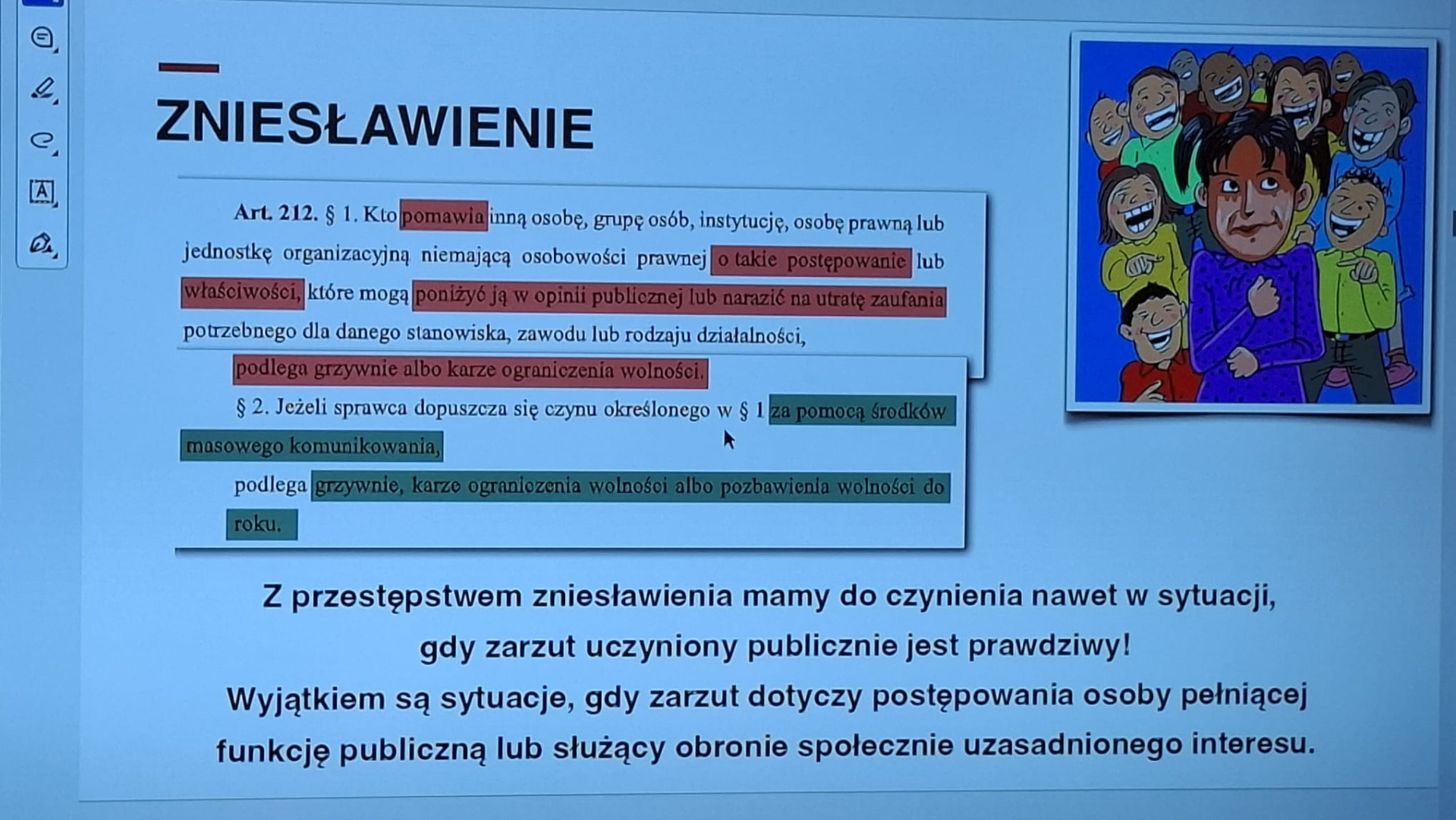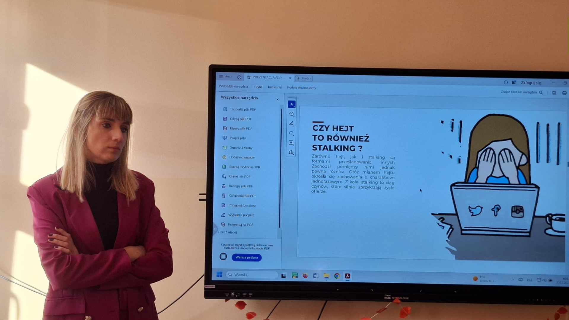 Tematem spotkania było Prawo vs hejt. Szkoła wolna od hejtu - zjawisko, które niestety coraz częściej dotyka młodych ludzi. Pani adwokat w przystępny i angażujący sposób opowiedziała o tym, czym jest hejt, jakie mogą być jego konsekwencje prawne, a także jak skutecznie się przed nim bronić.