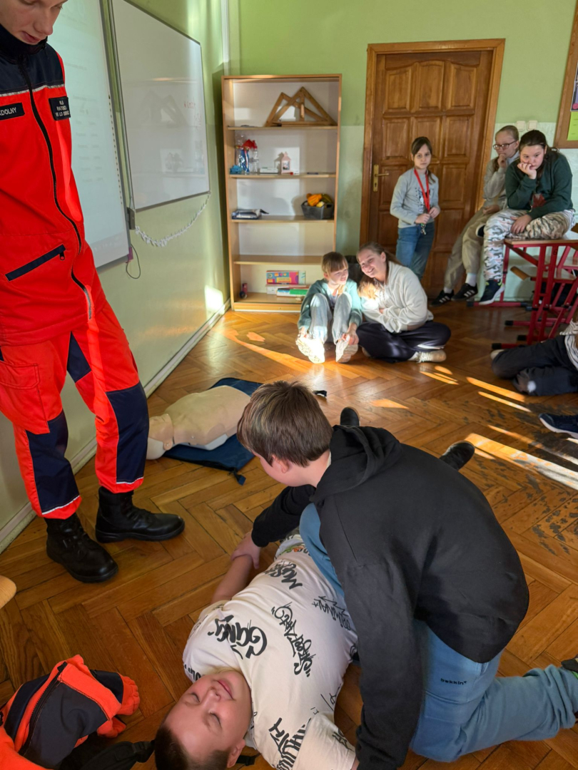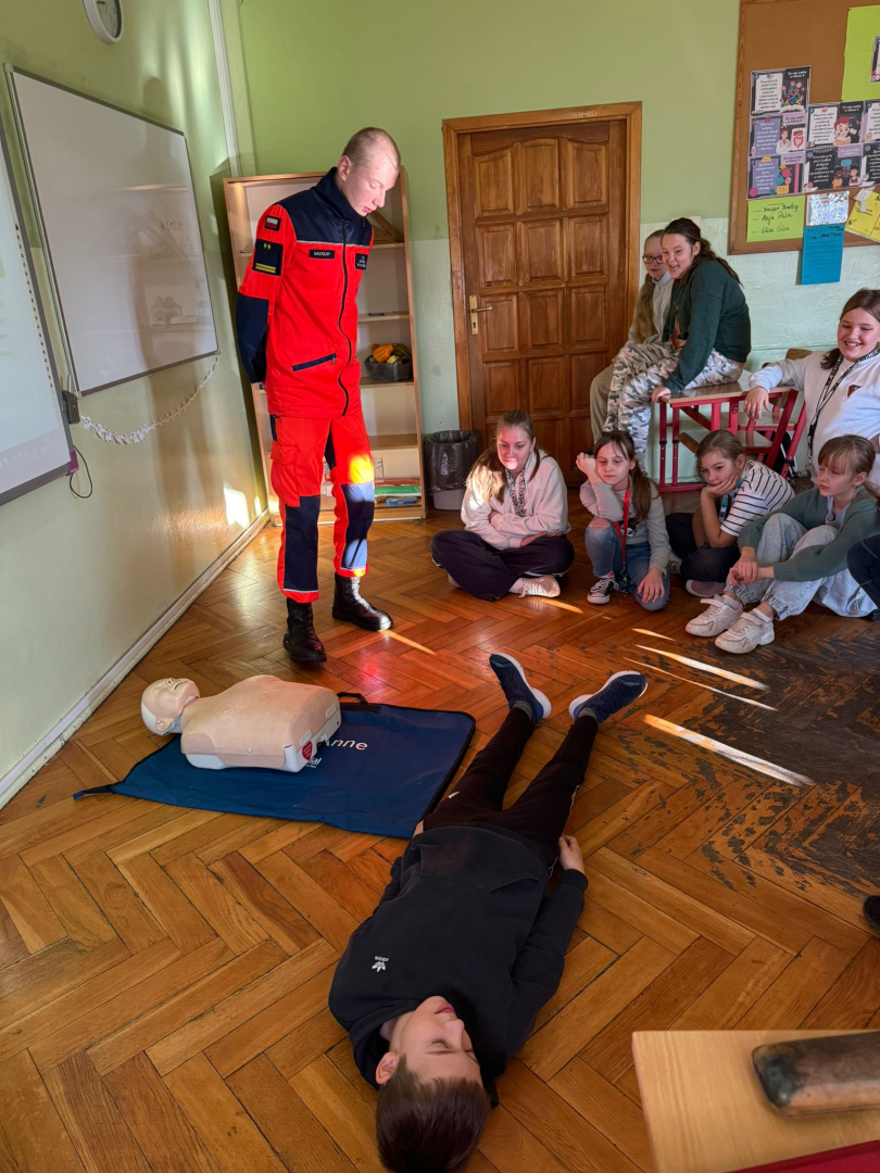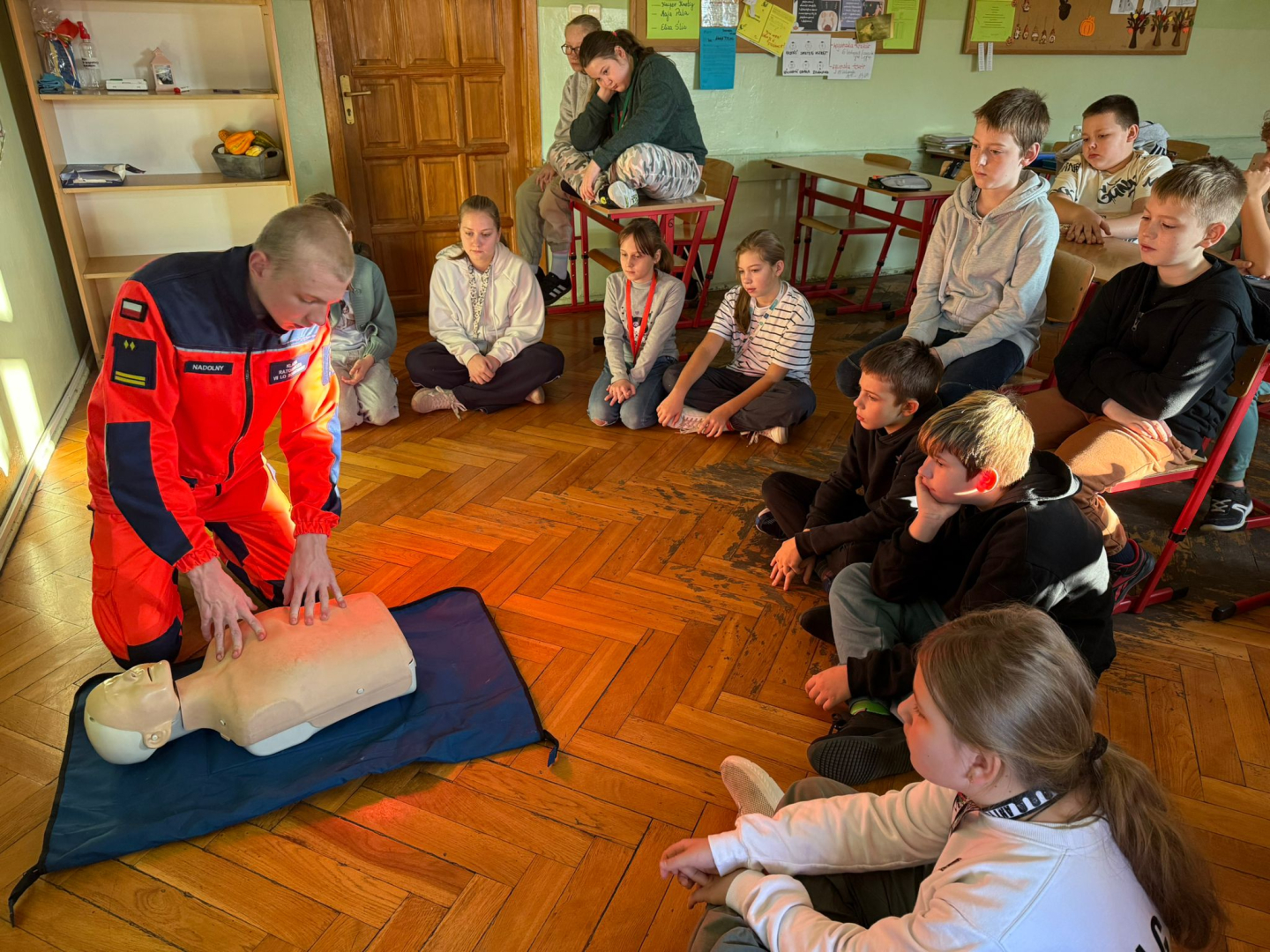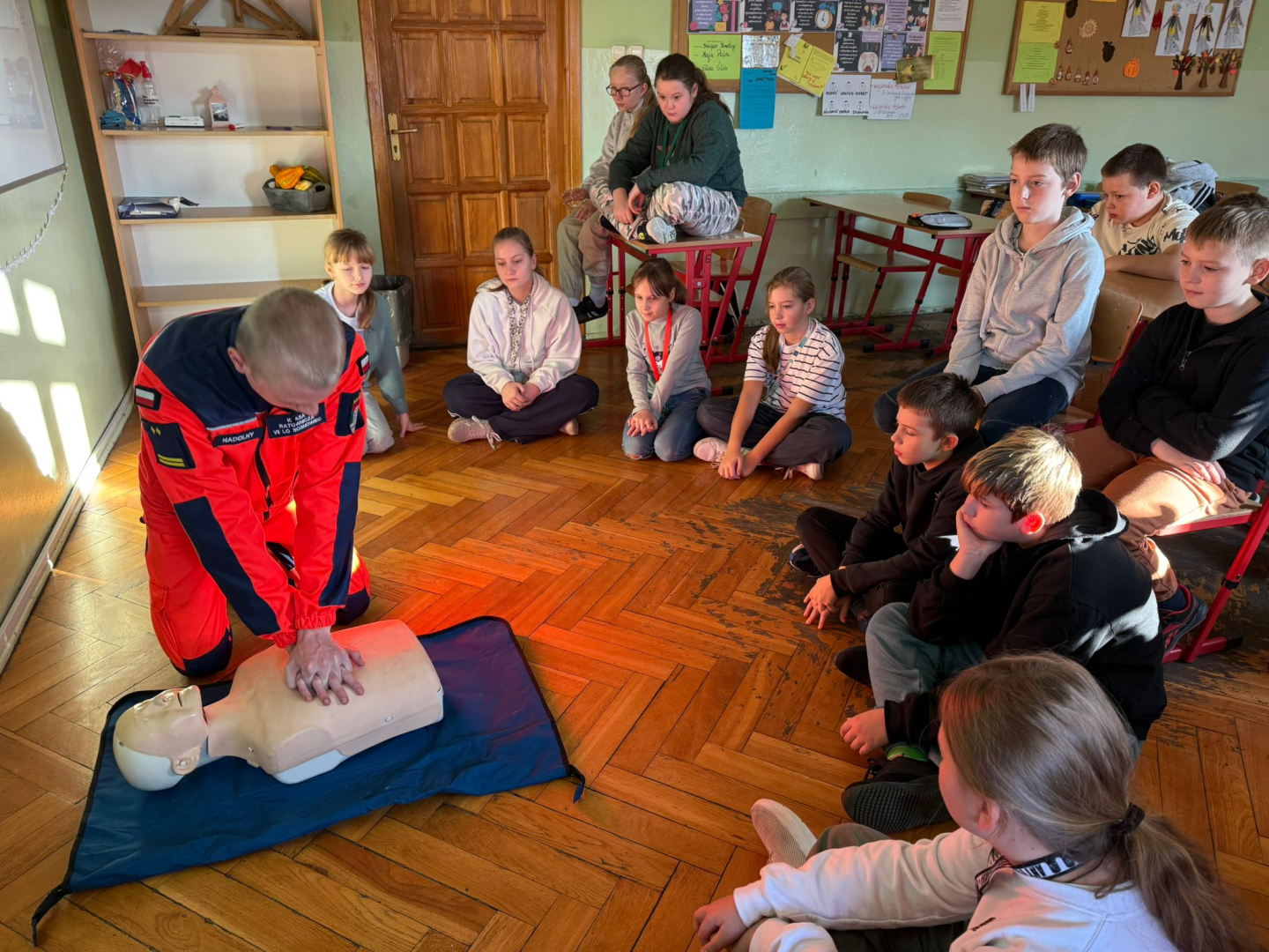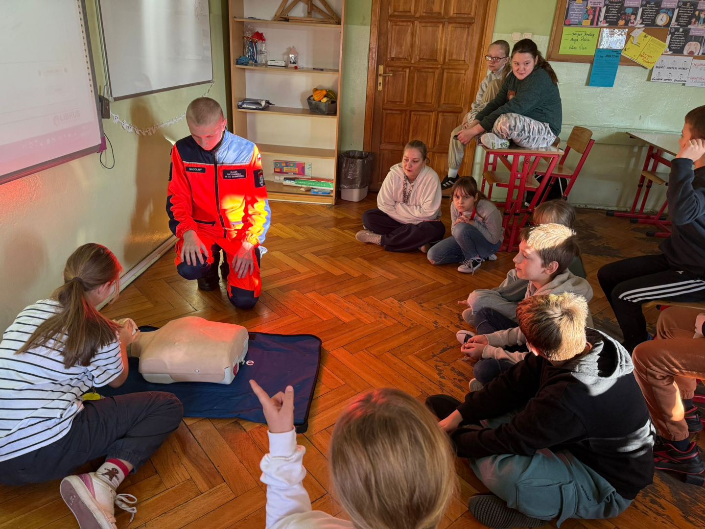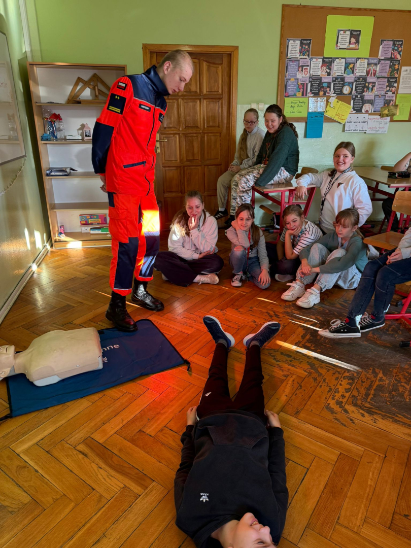 - Praktyka na fantomie: Centralnym punktem zajęć były ćwiczenia praktyczne. Uczniowie, pracując pod nadzorem absolwenta Kamila Nadolnego na specjalnym fantomie do resuscytacji krążeniowo-oddechowej (RKO), uczyli się prawidłowej techniki uciśnięć klatki piersiowej. Każdy uczeń miał możliwość przećwiczenia nabytej wiedzy w praktyce.
