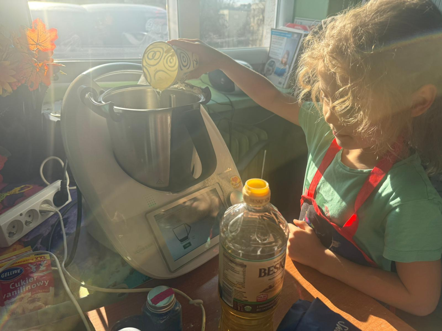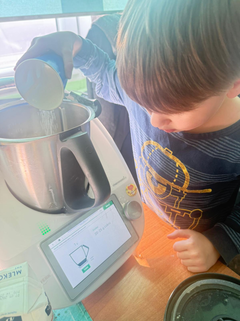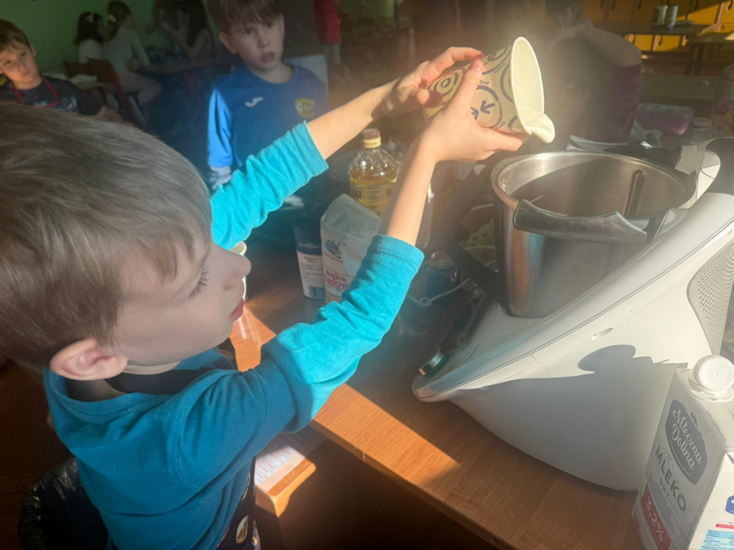 Już pierwszego dnia zajęć dodatkowych mali kucharze zmierzyli się z przygotowaniem pysznych, chrupiących gofrów. Okazało się, że nie jest to trudne zadanie — zwłaszcza gdy do dyspozycji mieliśmy Thermomix, gofrownicę oraz wszystkie potrzebne składniki.