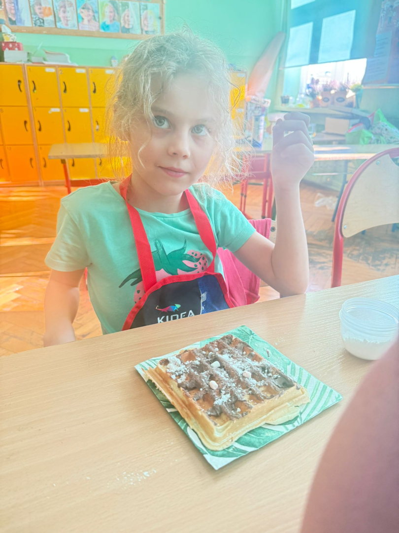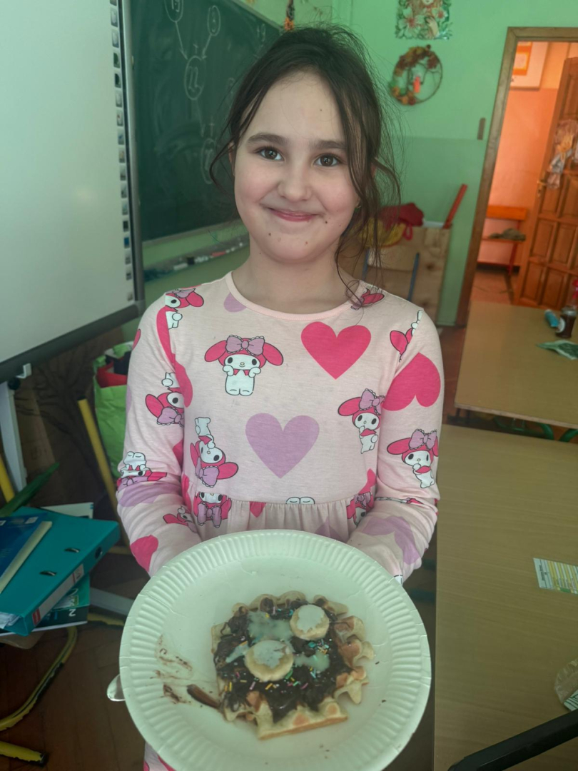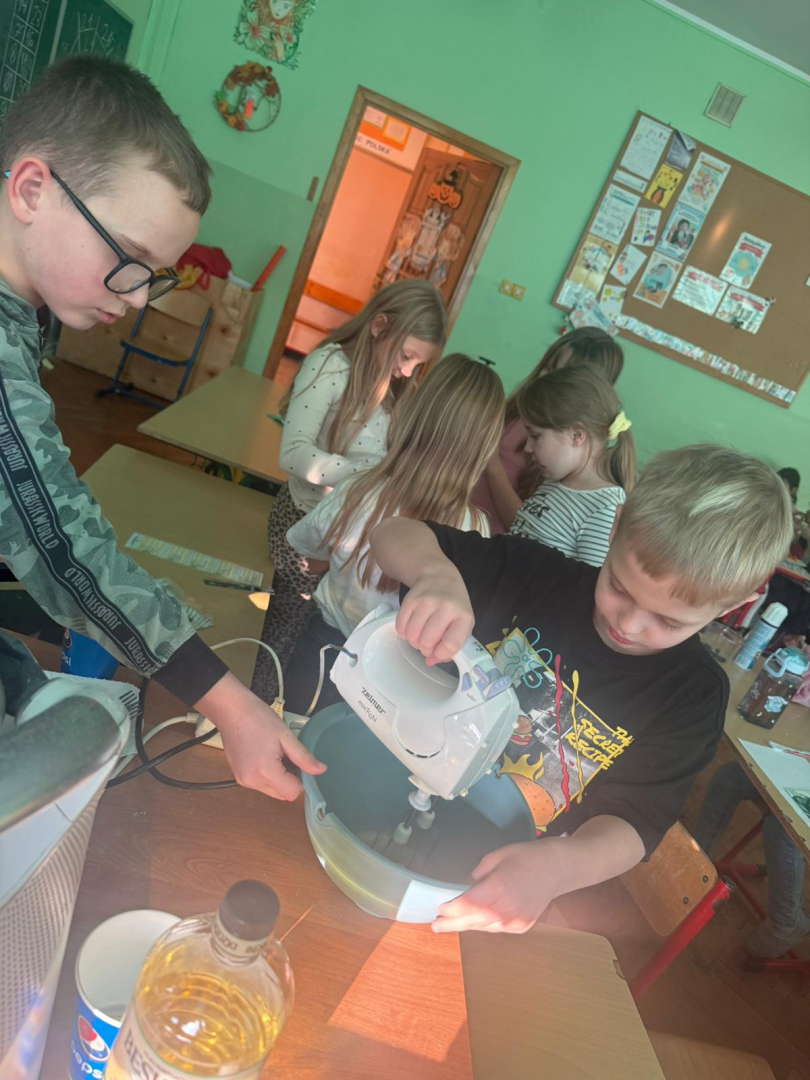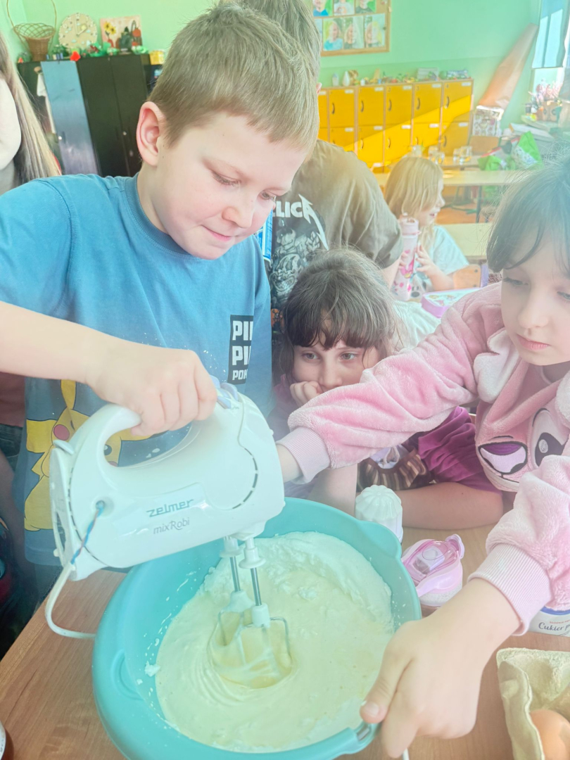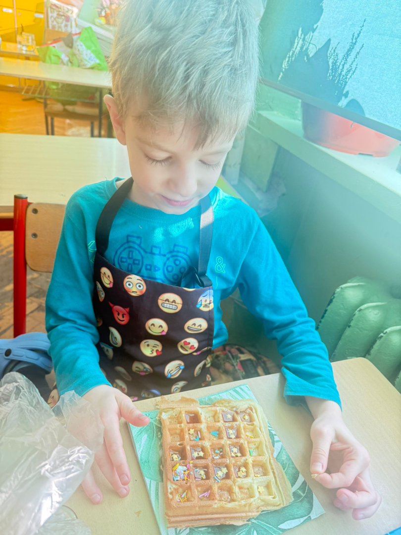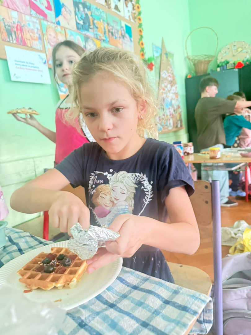Po wspólnym przygotowaniu ciasta nadszedł najbardziej wyczekiwany moment — dekorowanie! Każdy uczeń ozdobił swojego gofra według własnego pomysłu. Na stołach królowały: Nutella, bita śmietana, kolorowe posypki, dżemy oraz swojskie powidła. Kreatywność dzieci nie miała końca, a efekty pracy były nie tylko piękne, ale przede wszystkim bardzo smaczne.