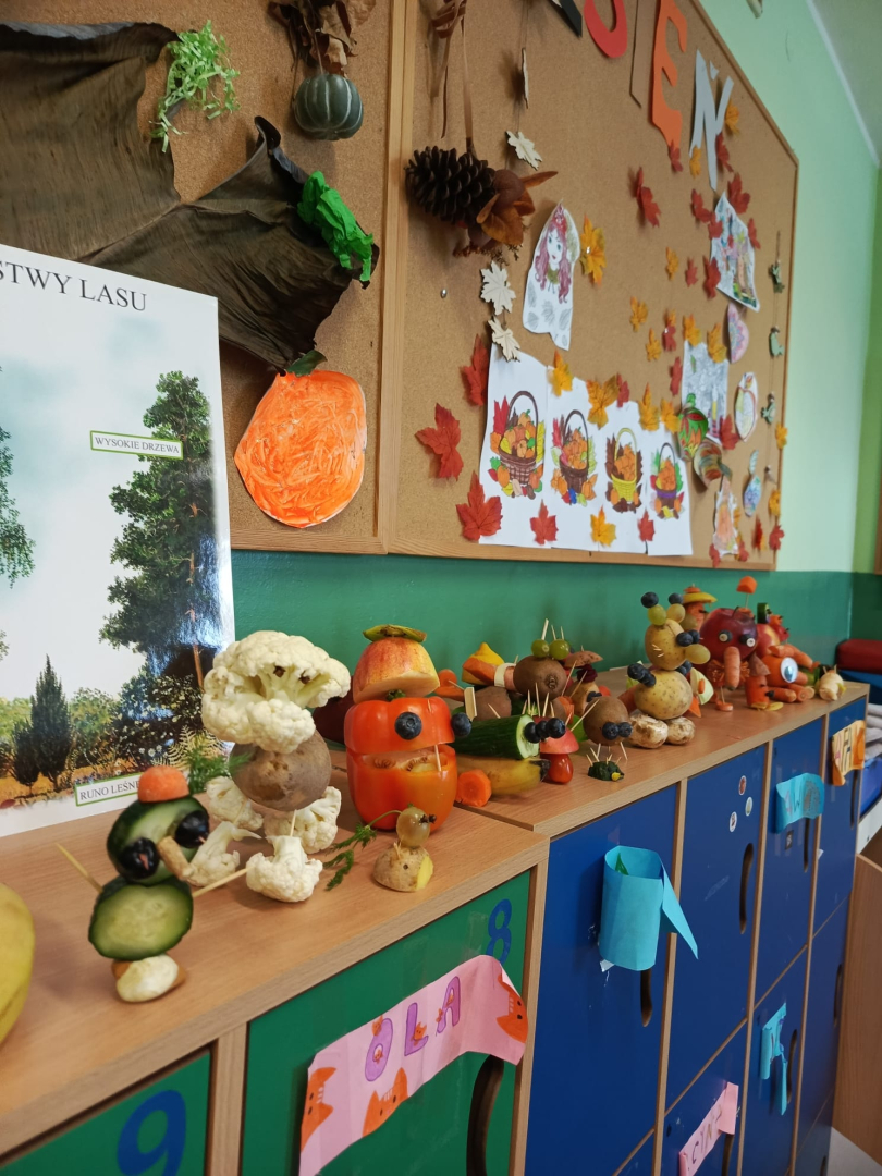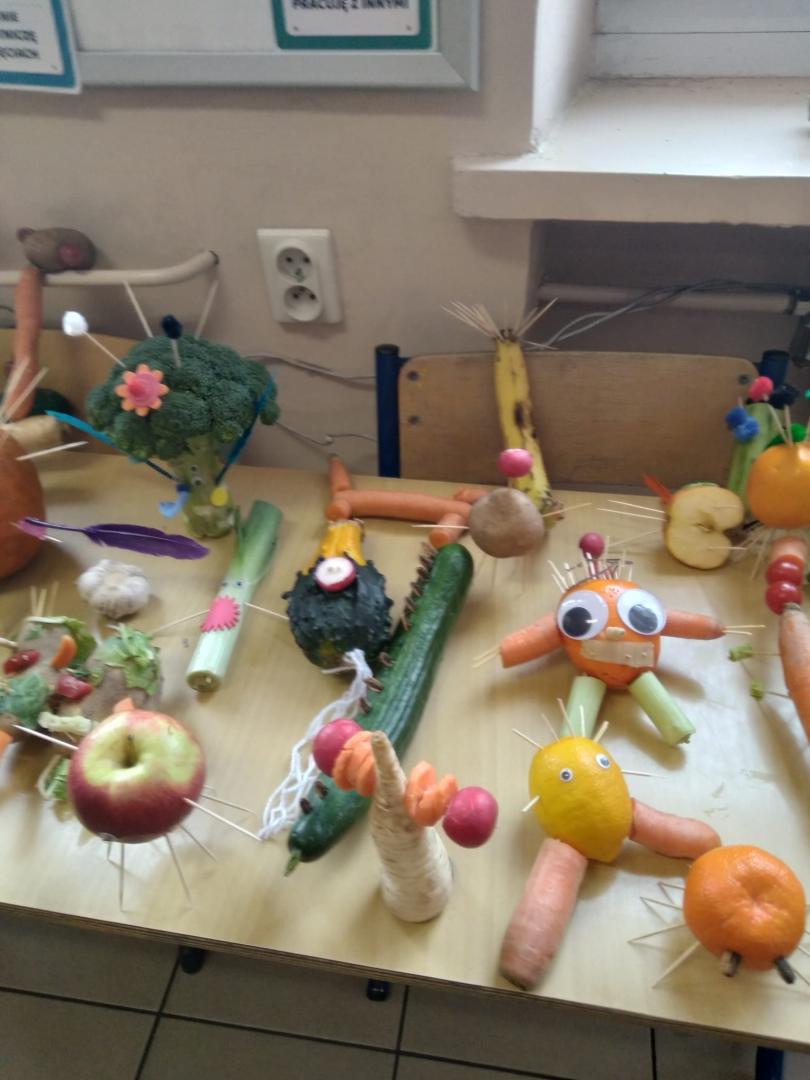 Dzieci wykonywały prace z warzyw, owoców oraz innych darów jesieni. Były to postacie realne, lub wymyślone. Dzieci wspaniale uruchomiły swój potencjał. Prace, które stworzyły są ciekawe i godne podziwu. Wykonanie Jesiennych cudaków sprawiło dzieciom wiele radości i zabawy. Piękne prace! Gratulacje.