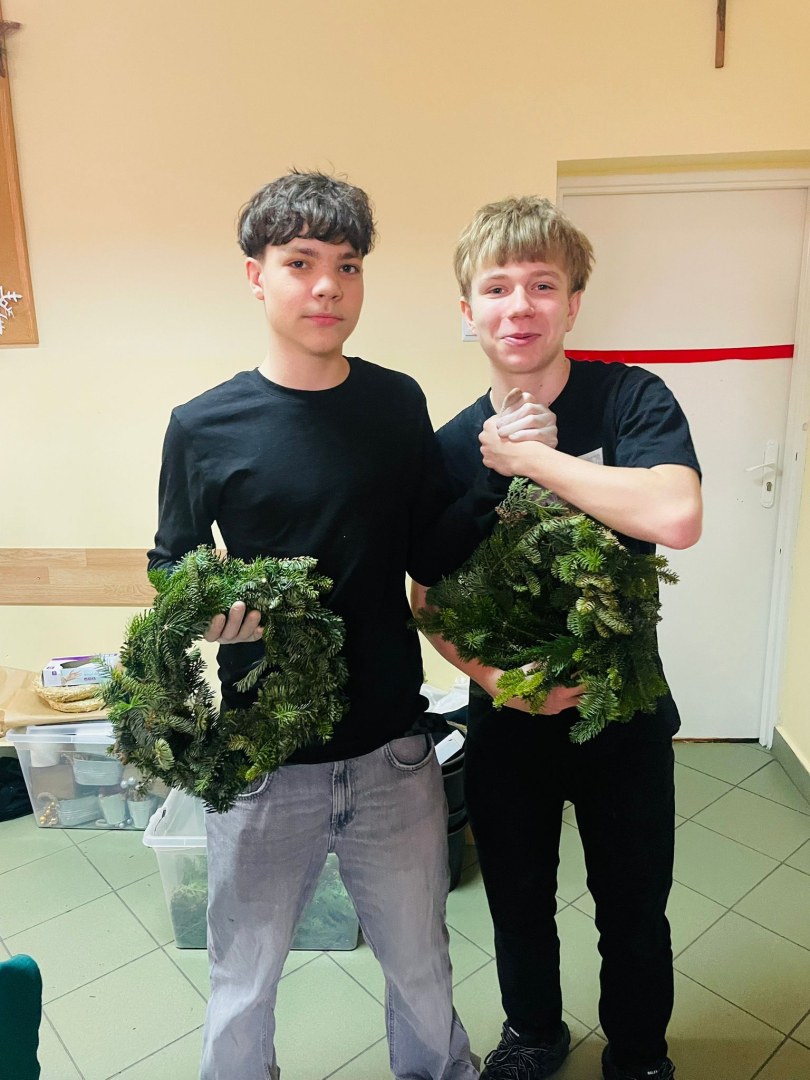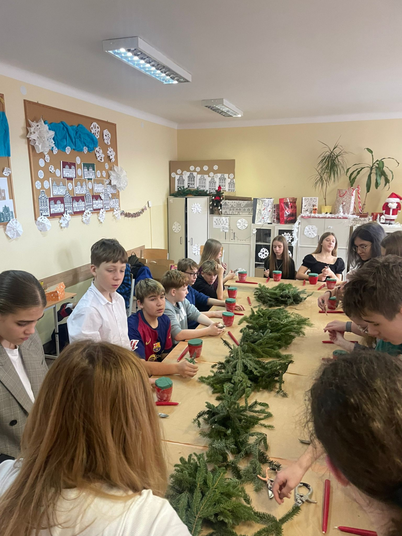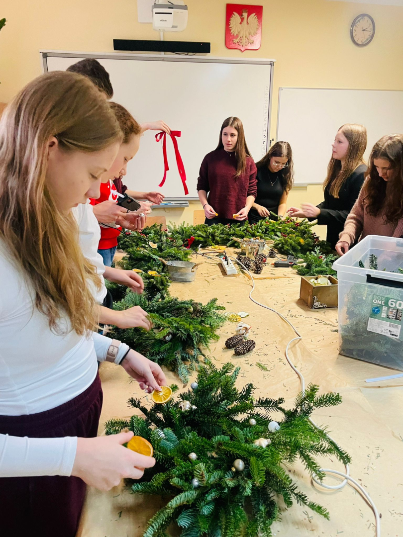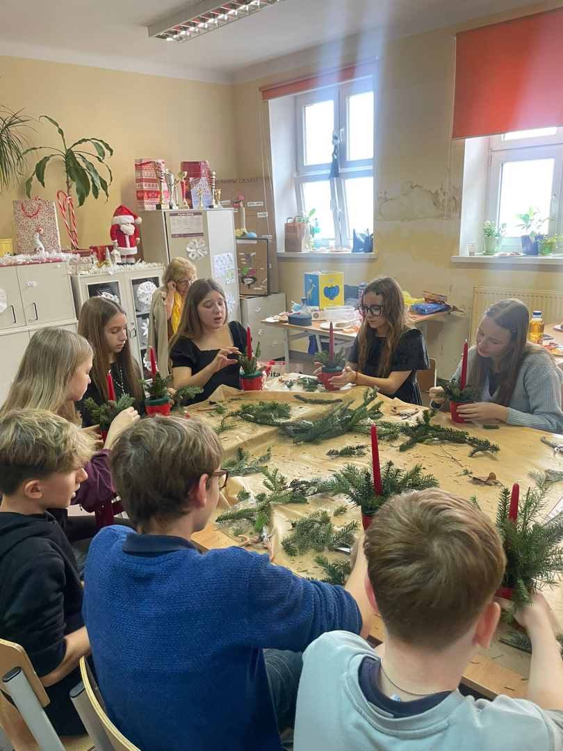 Warsztaty odbyły się w klasie, w miłej, ciepłej atmosferze, pełnej zapachu igliwia i świątecznych dekoracji. Był to czas twórczej pracy, radości i wspólnego przeżywania zbliżających się świąt Bożego Narodzenia. Powstałe stroiki z pewnością staną się piękną ozdobą domów uczniów i miłą pamiątką tego wyjątkowego spotkania.