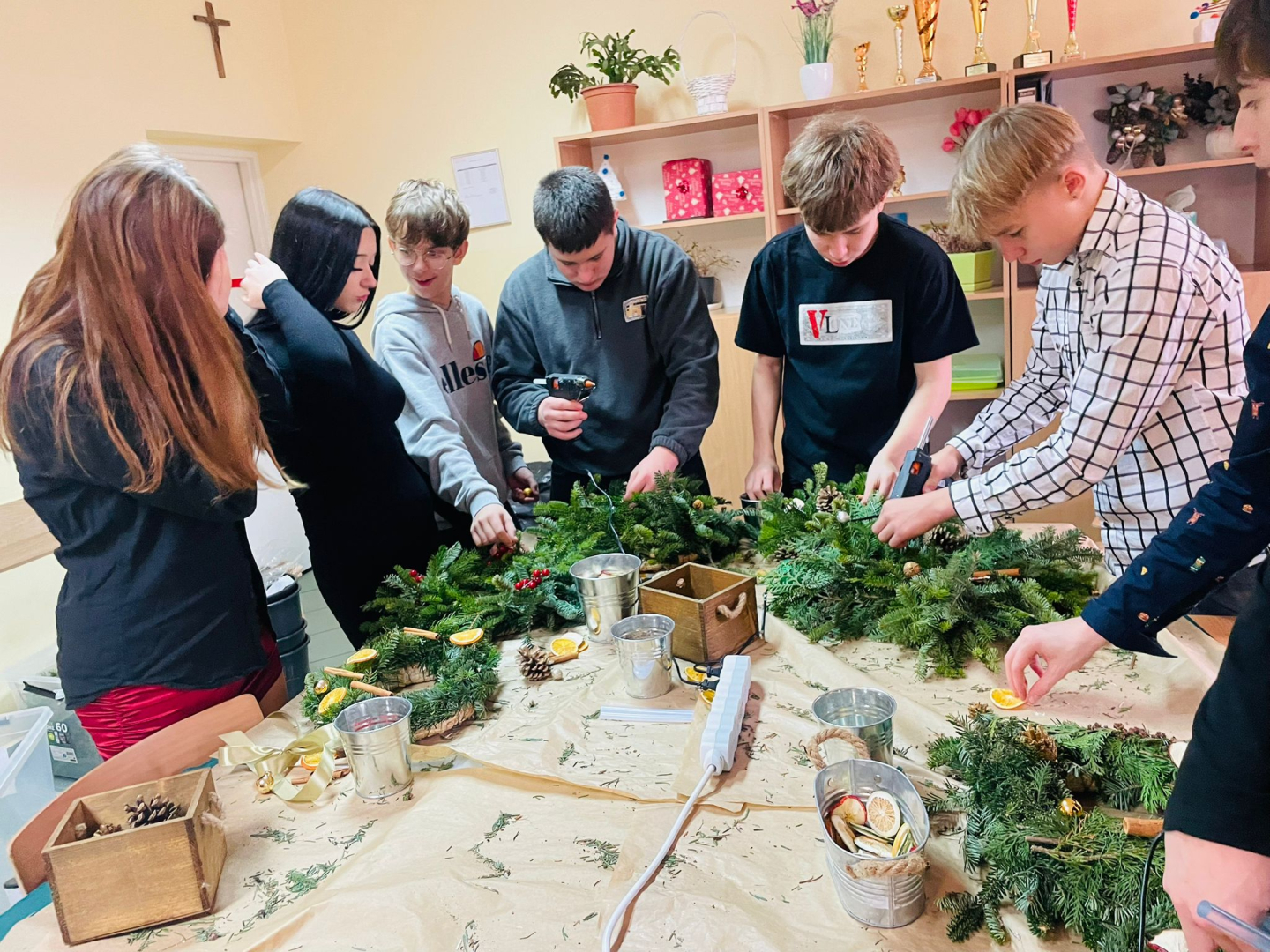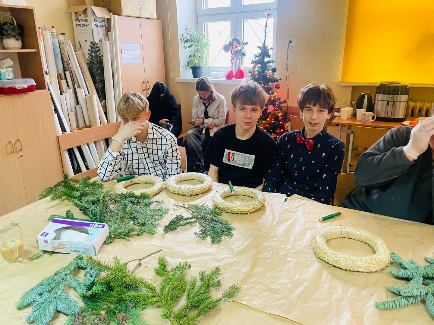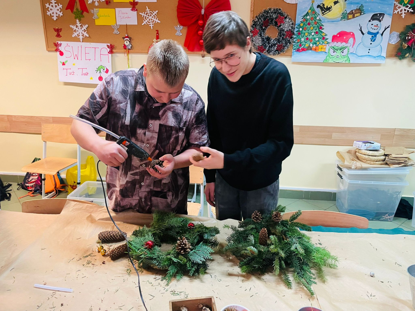 Warsztaty odbyły się w klasie, w miłej, ciepłej atmosferze, pełnej zapachu igliwia i świątecznych dekoracji. Był to czas twórczej pracy, radości i wspólnego przeżywania zbliżających się świąt Bożego Narodzenia. Powstałe stroiki z pewnością staną się piękną ozdobą domów uczniów i miłą pamiątką tego wyjątkowego spotkania.